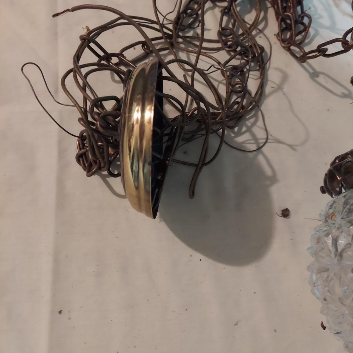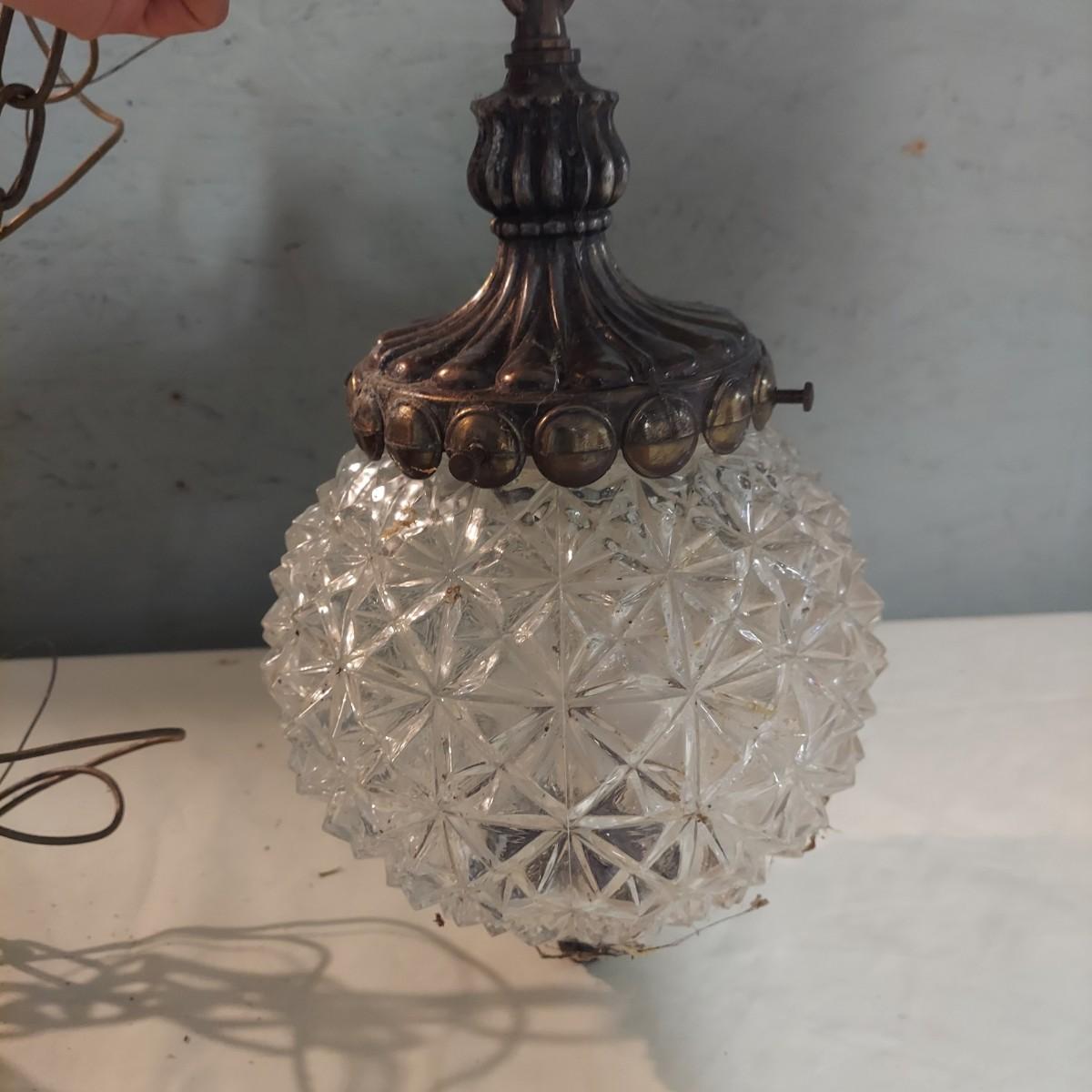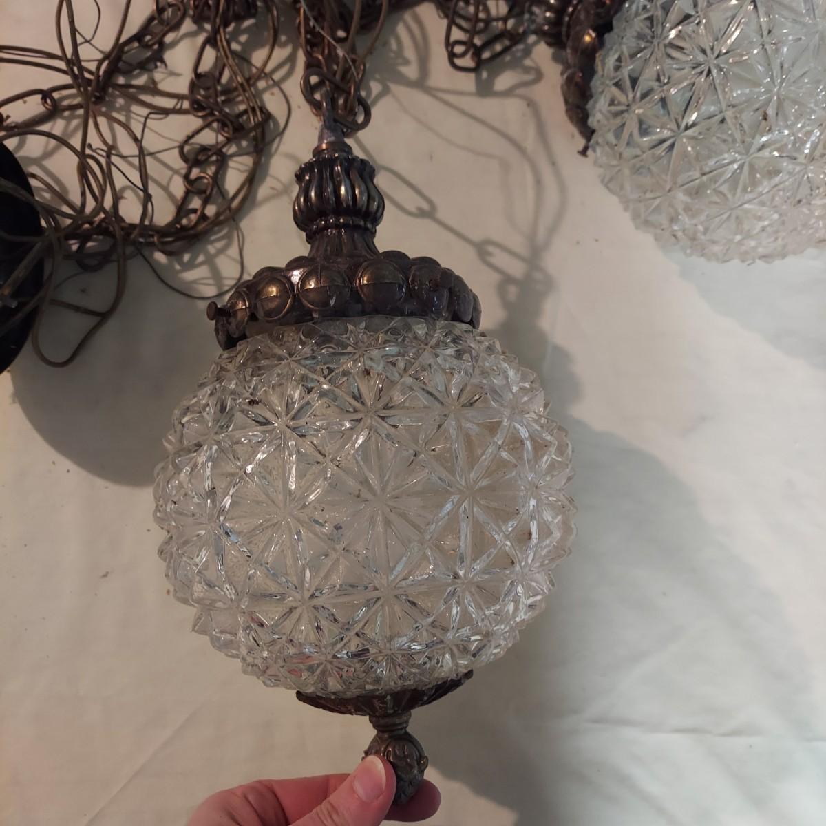 Two metal and formed glass lamps that hang from chains. Each globe with finials is approximately 12"H. The chains are tangled. Please see photos for details. Shipping available