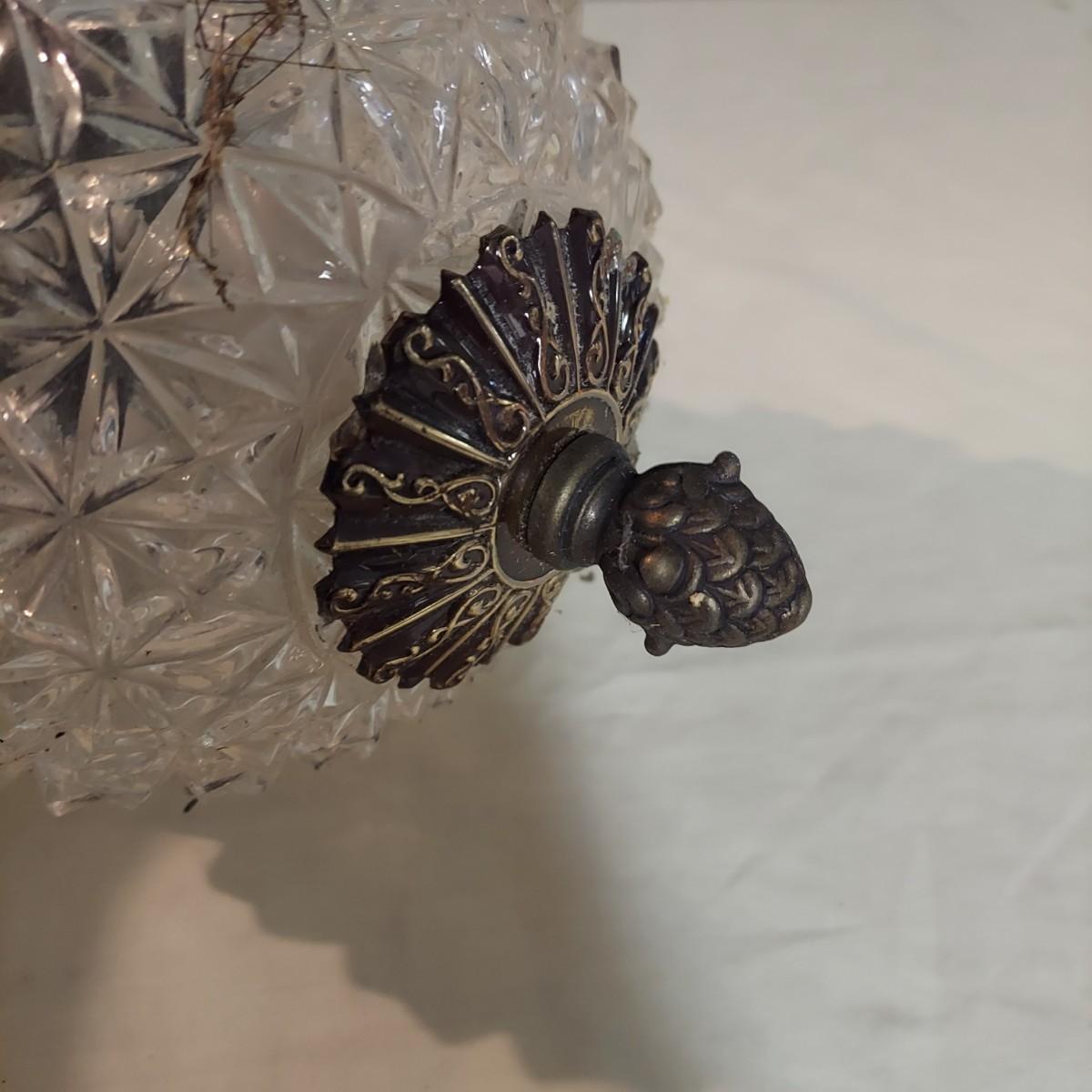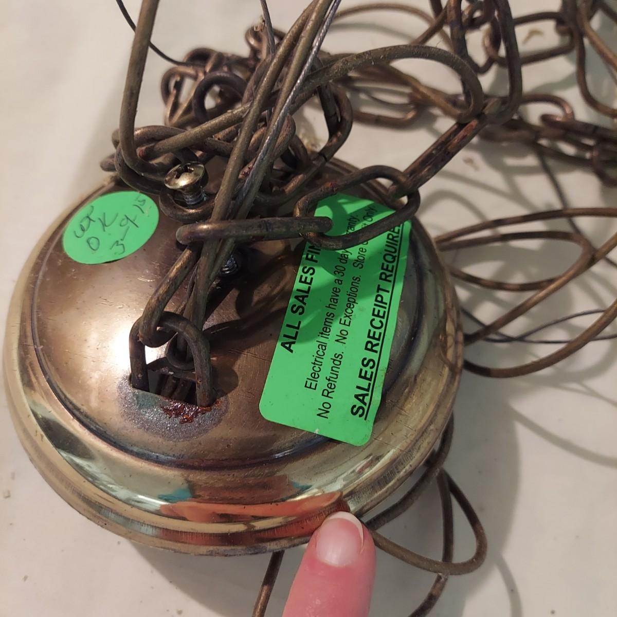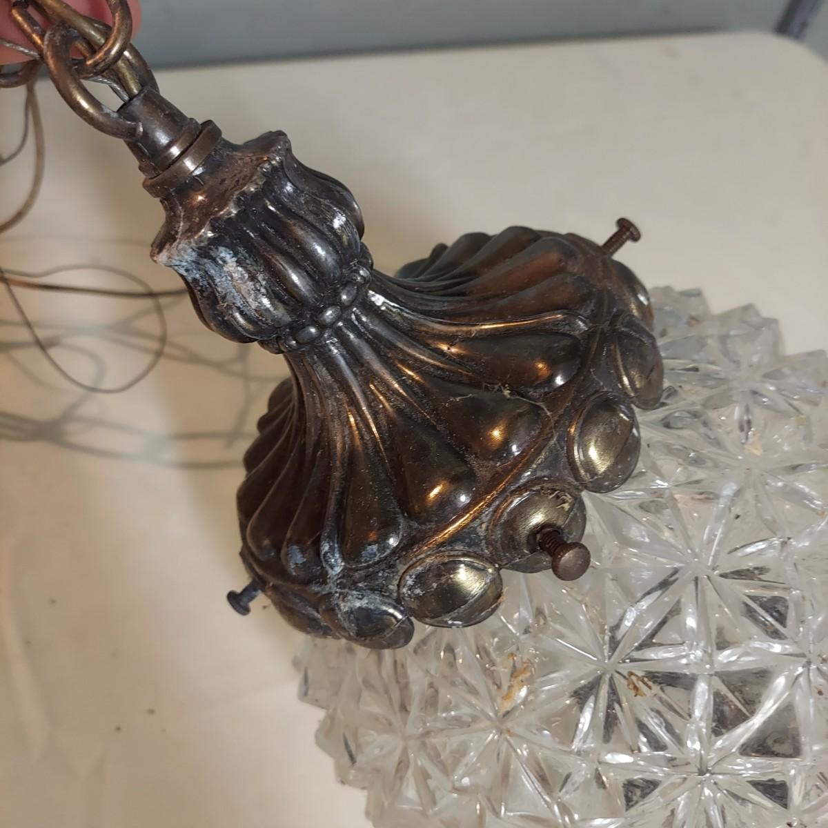 Two metal and formed glass lamps that hang from chains. Each globe with finials is approximately 12"H. The chains are tangled. Please see photos for details. Shipping available