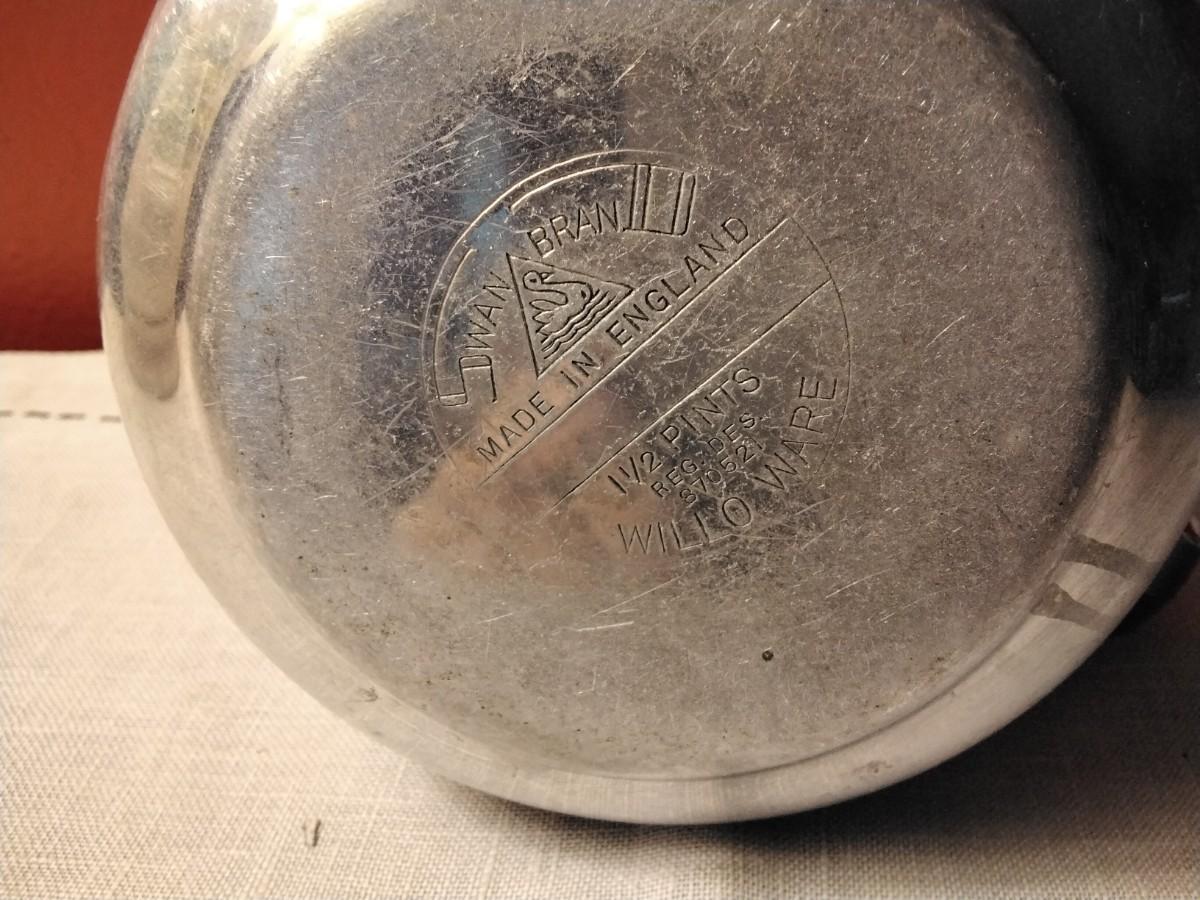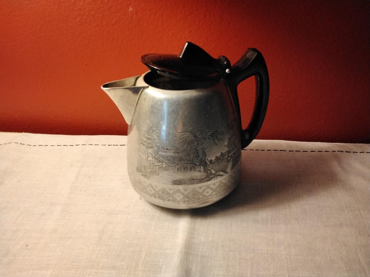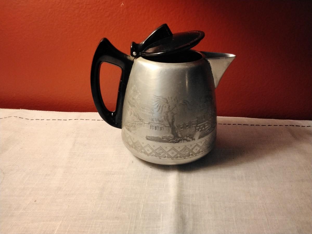 vintage aluminum tea/coffee pot. Swan Willo Ware brand. made in England. holds 1 1/2 pints of liquid.