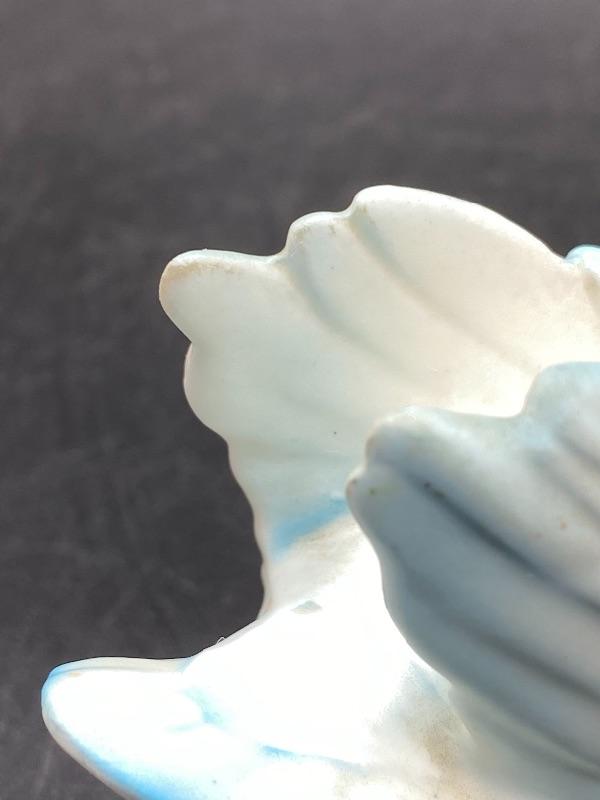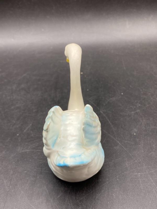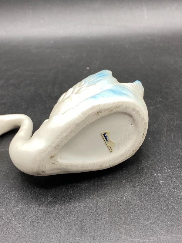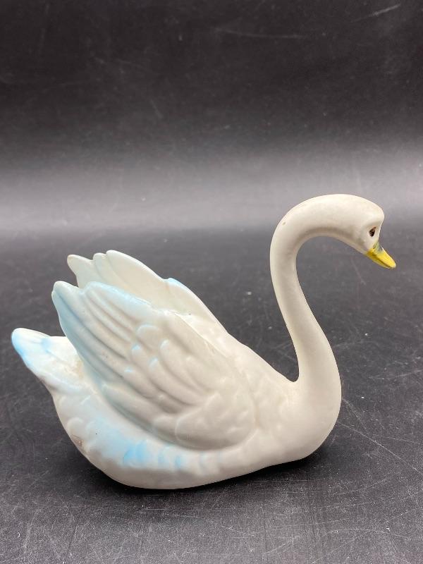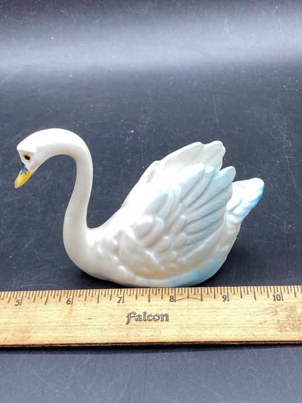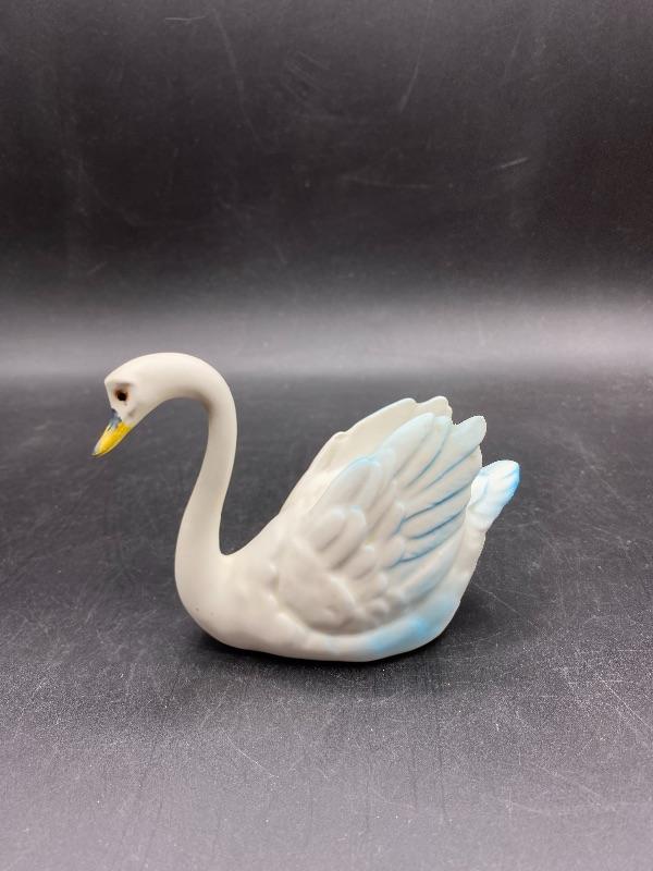 Small vintage swan figurine. White swan with some blue edging. Partial sticker on the bottom, possibly made in Japan. About 5" long, 3.5" tall.