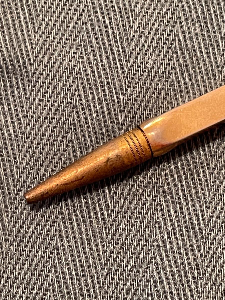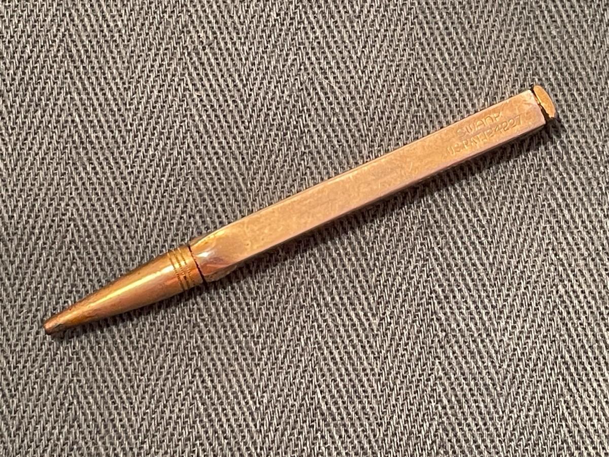 This tiny pencil is marked Swank and made of a gold tone metal. It is about 3 inches long.