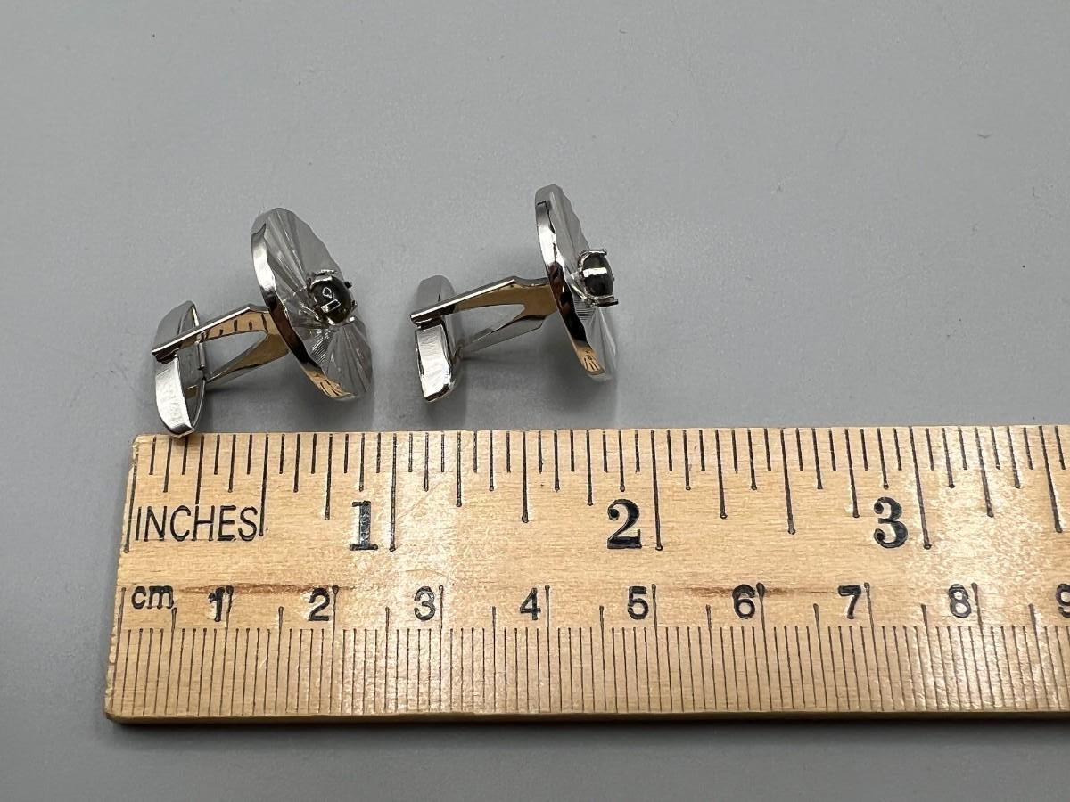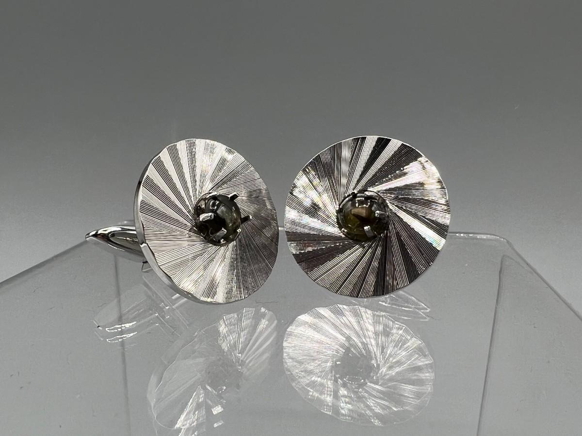 Pair of vintage Swank cuff links. Silver tone textured metal with a rhinestone center. Good condition.