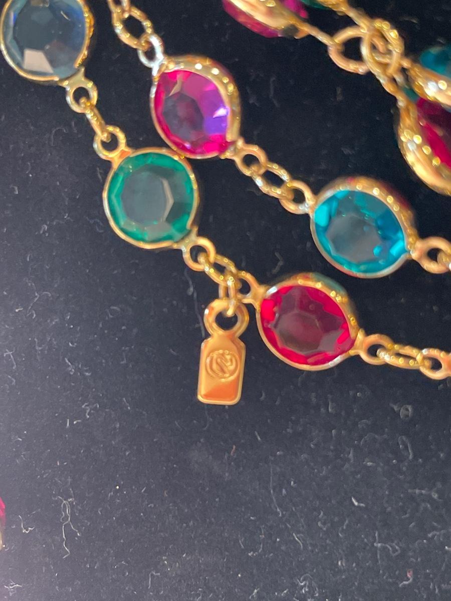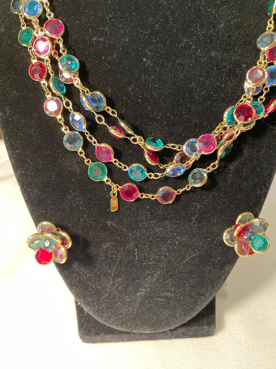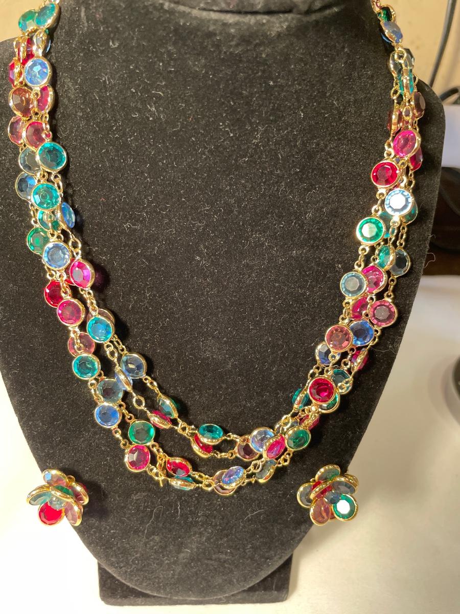 Includes 2 longer vintage Swarovski necklaces slightly different in color and 1 matching pair of clip on earrings