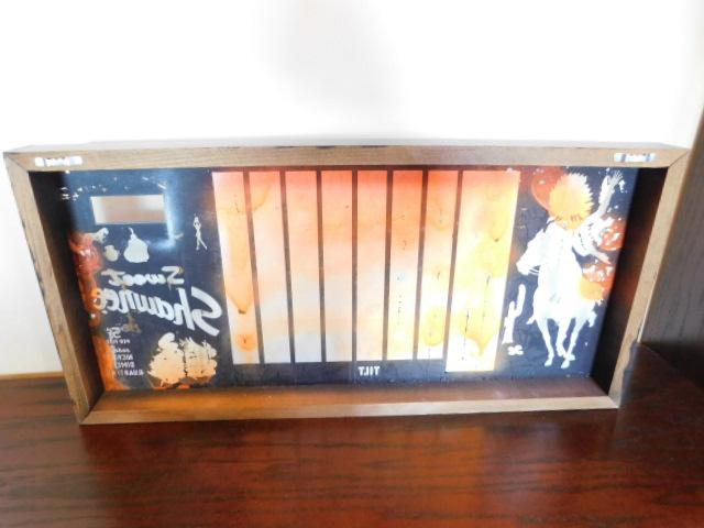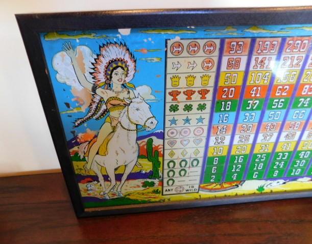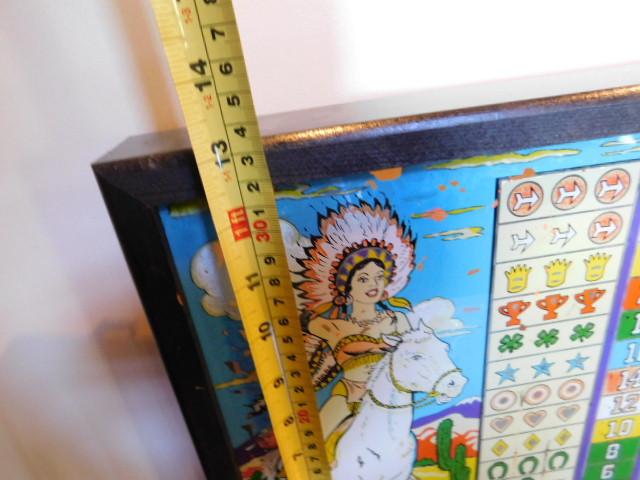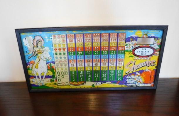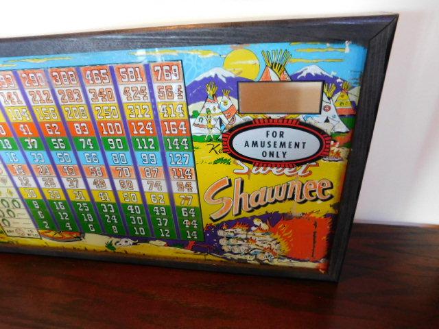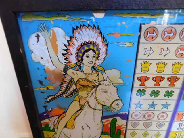 Vintage 'Sweet Shawnee' Framed Slot Machine Reverse Painted Glass Back Light Face 27"x13" has some paint missing but color is strong and makes for a great display item