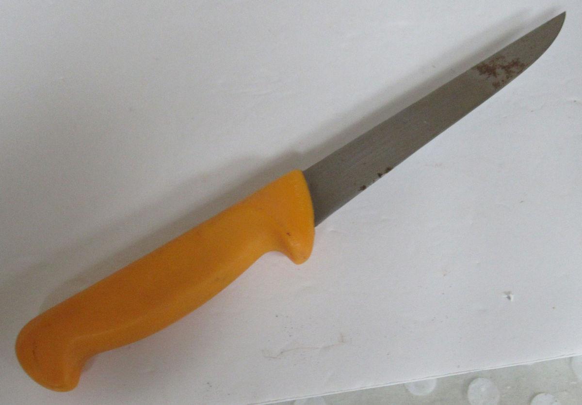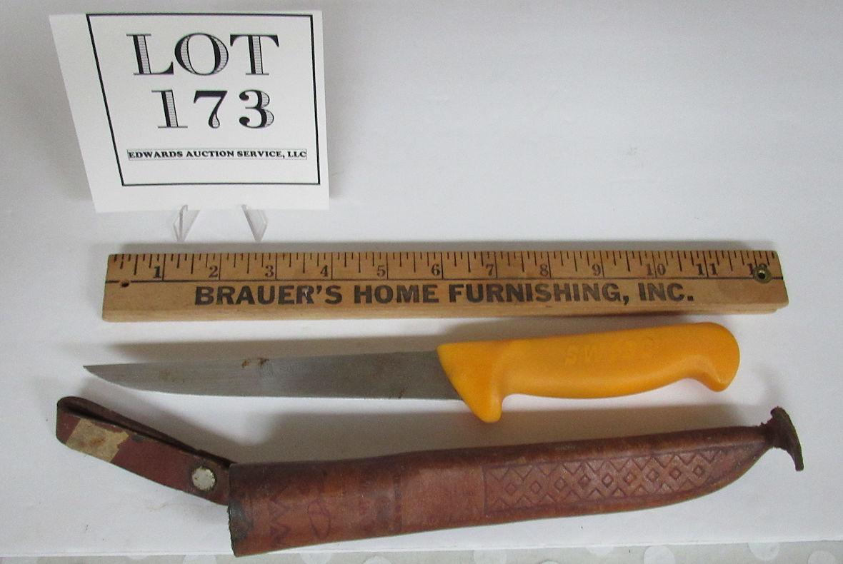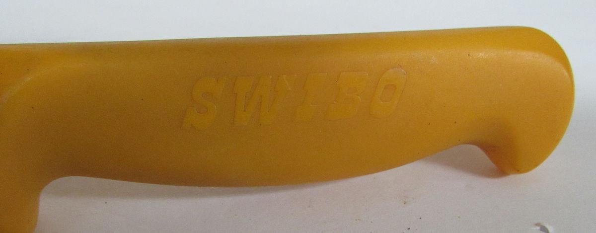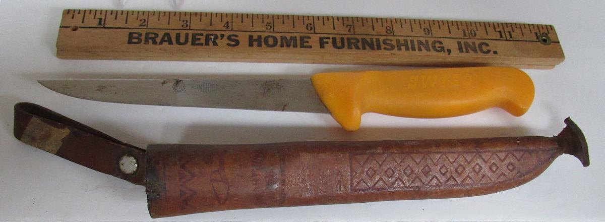 Vintage Swibo Yellow Plastic Handled Fillet Knife with Fancy Sheath