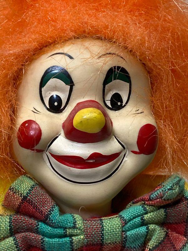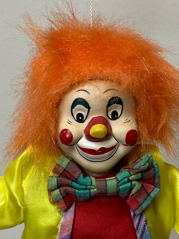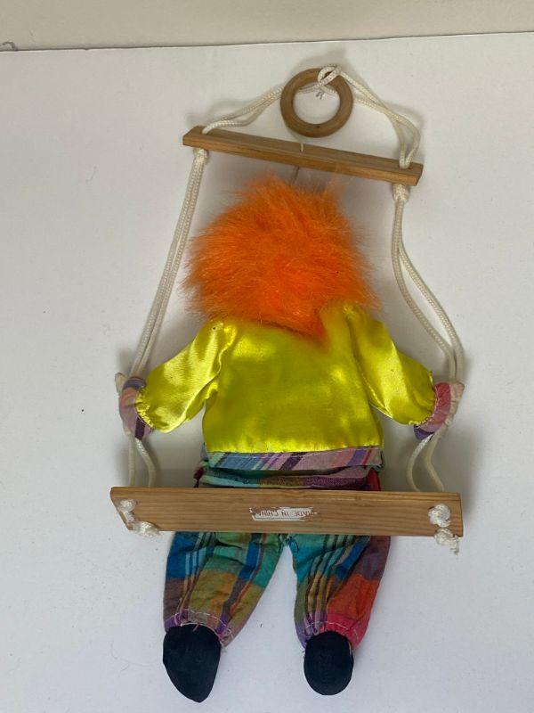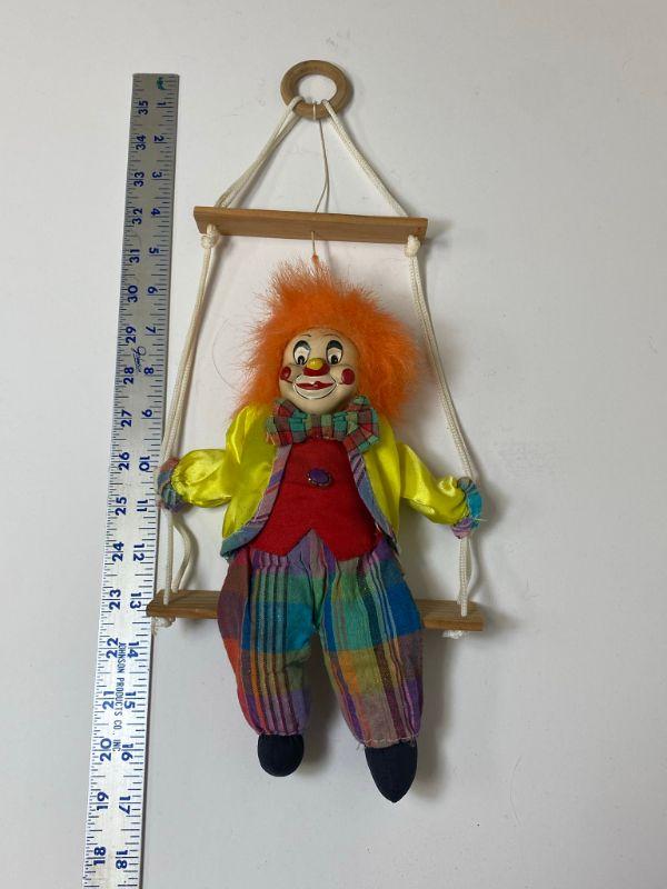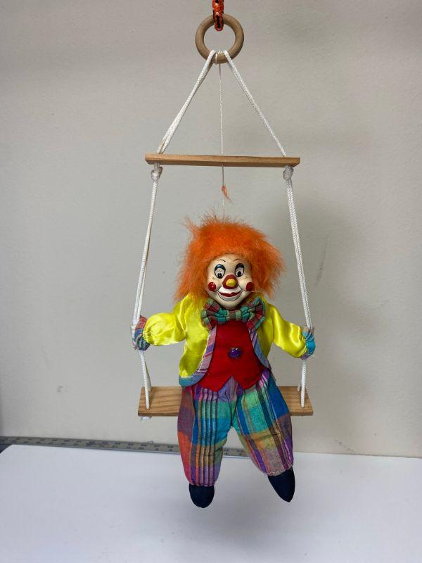 Vintage swinging clown hanging figurine doll. Attached to his swing. Kinda cute, kinda creepy. About 17" length. May be dusty from display.