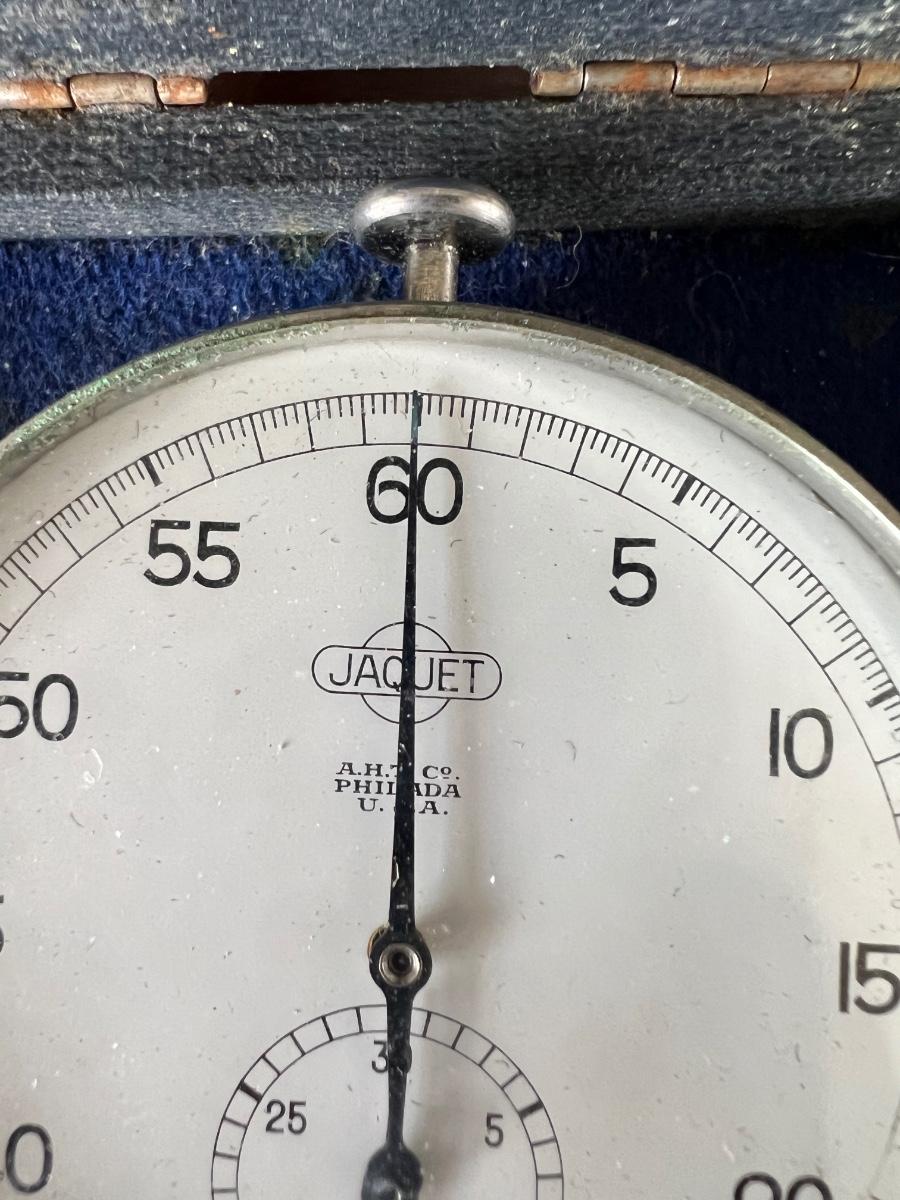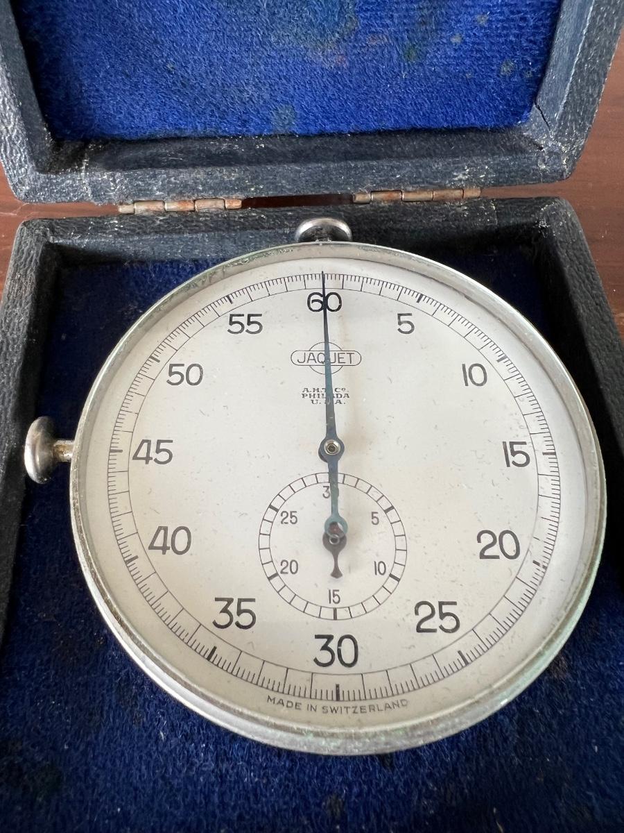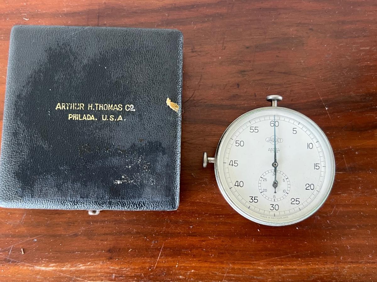 Vintage Swiss-Made Jaquet Stop Watch From with Arthur H. Thomas box measures 3 inches tall by 3 inches wide and 1 inch deep. Does not turn on. Selling as is.
