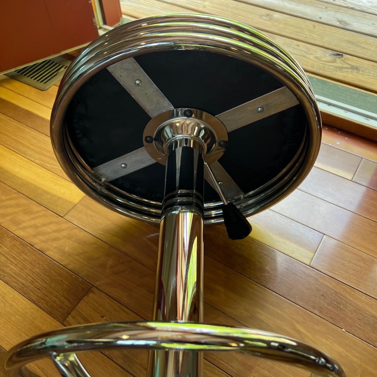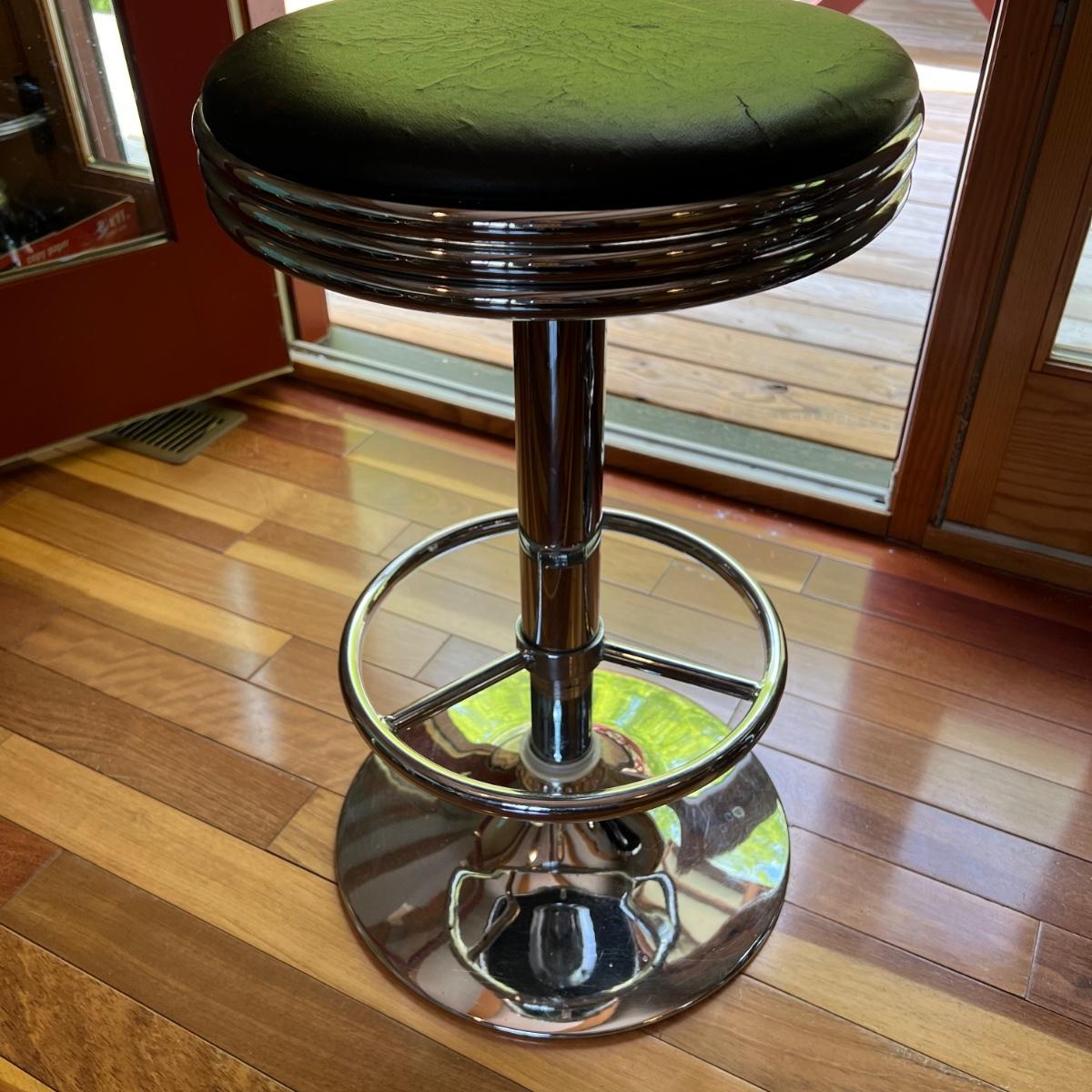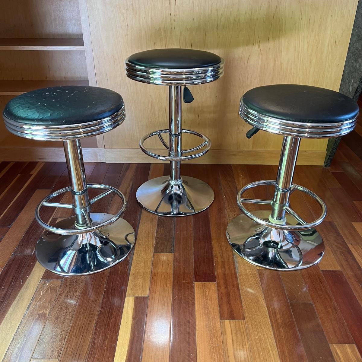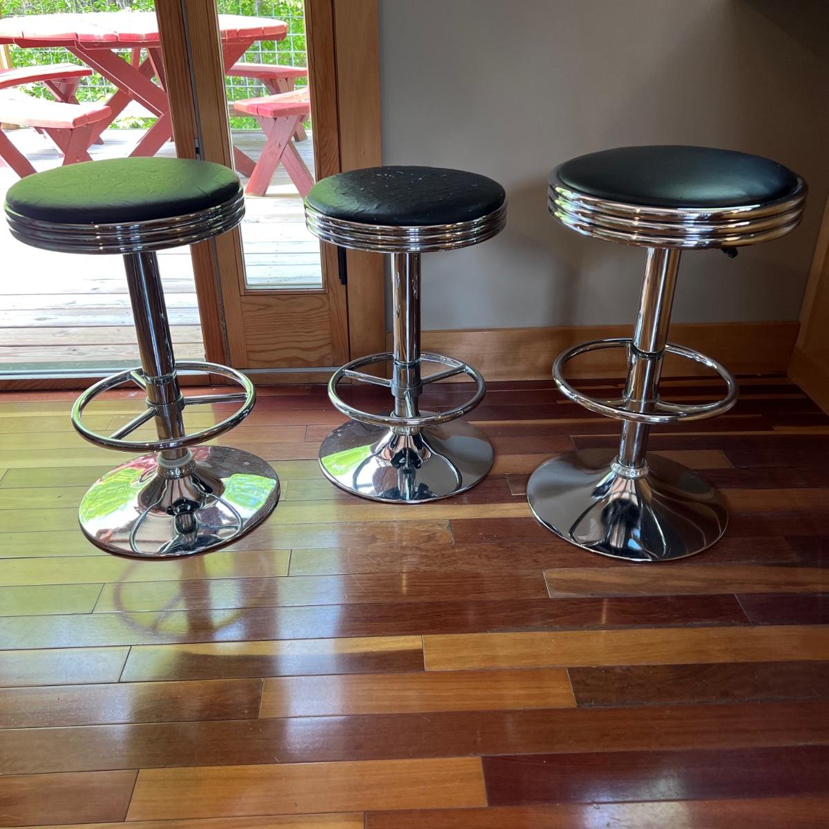 Three retro swivel adjustable height stools with a metal chrome frame and faux leather upholstery. Their dimensions are 15” D x 23-31” H.