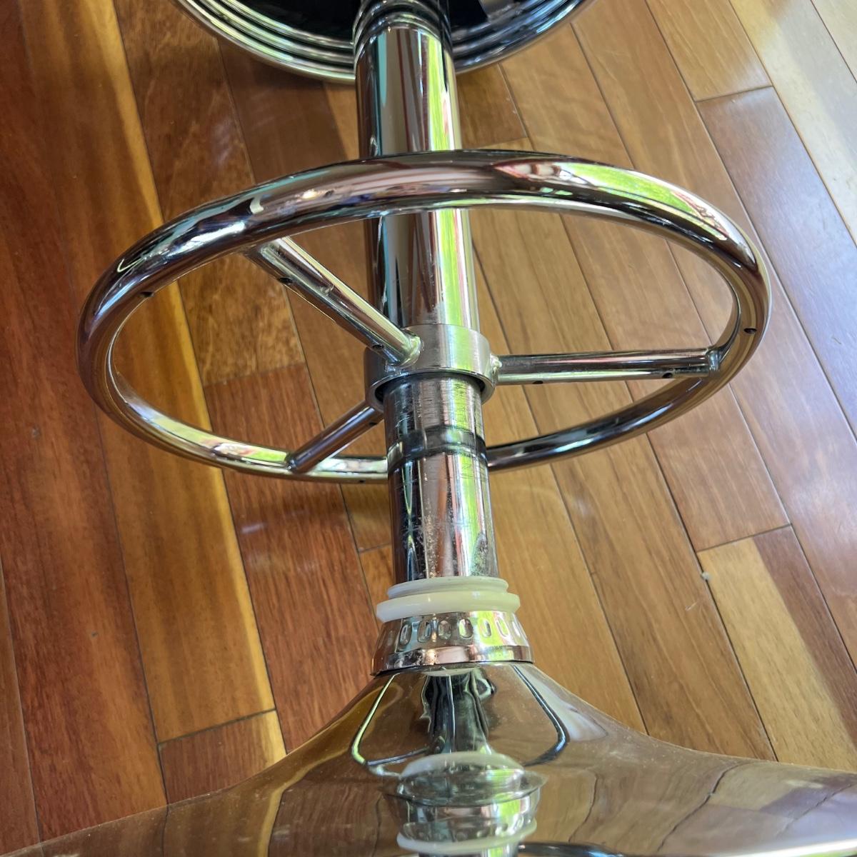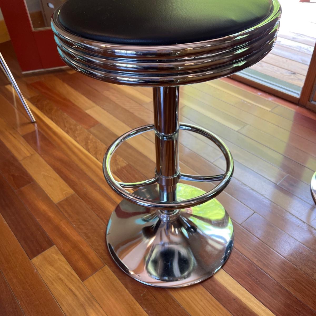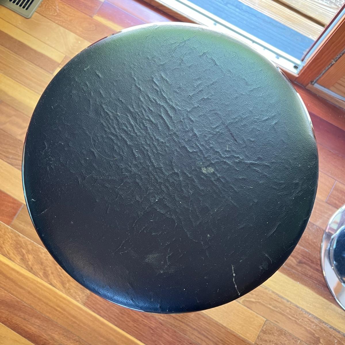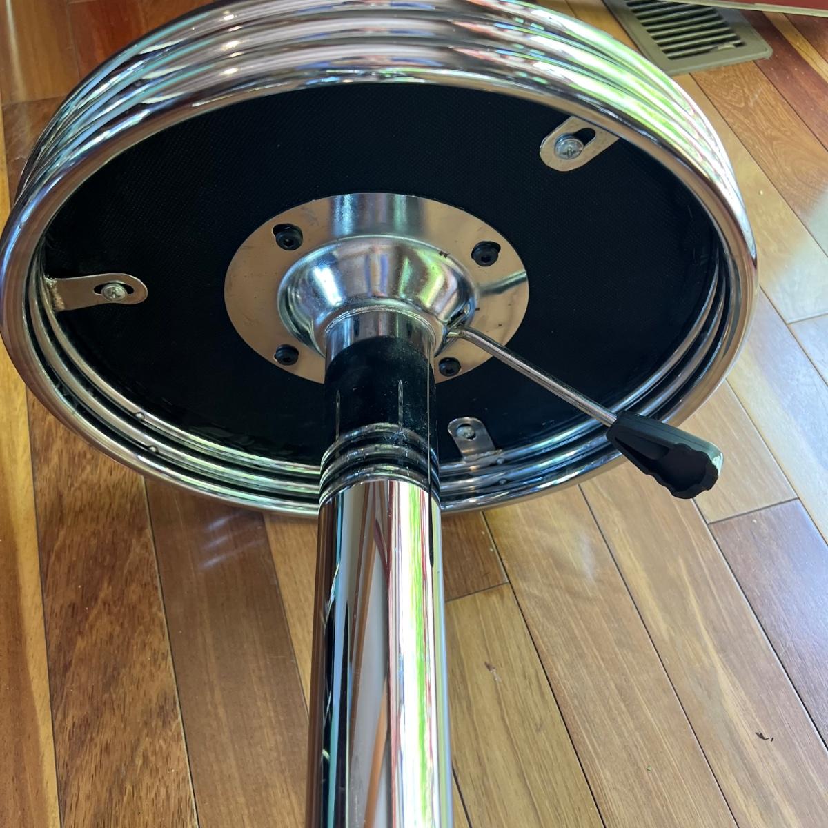 Three retro swivel adjustable height stools with a metal chrome frame and faux leather upholstery. Their dimensions are 15” D x 23-31” H.