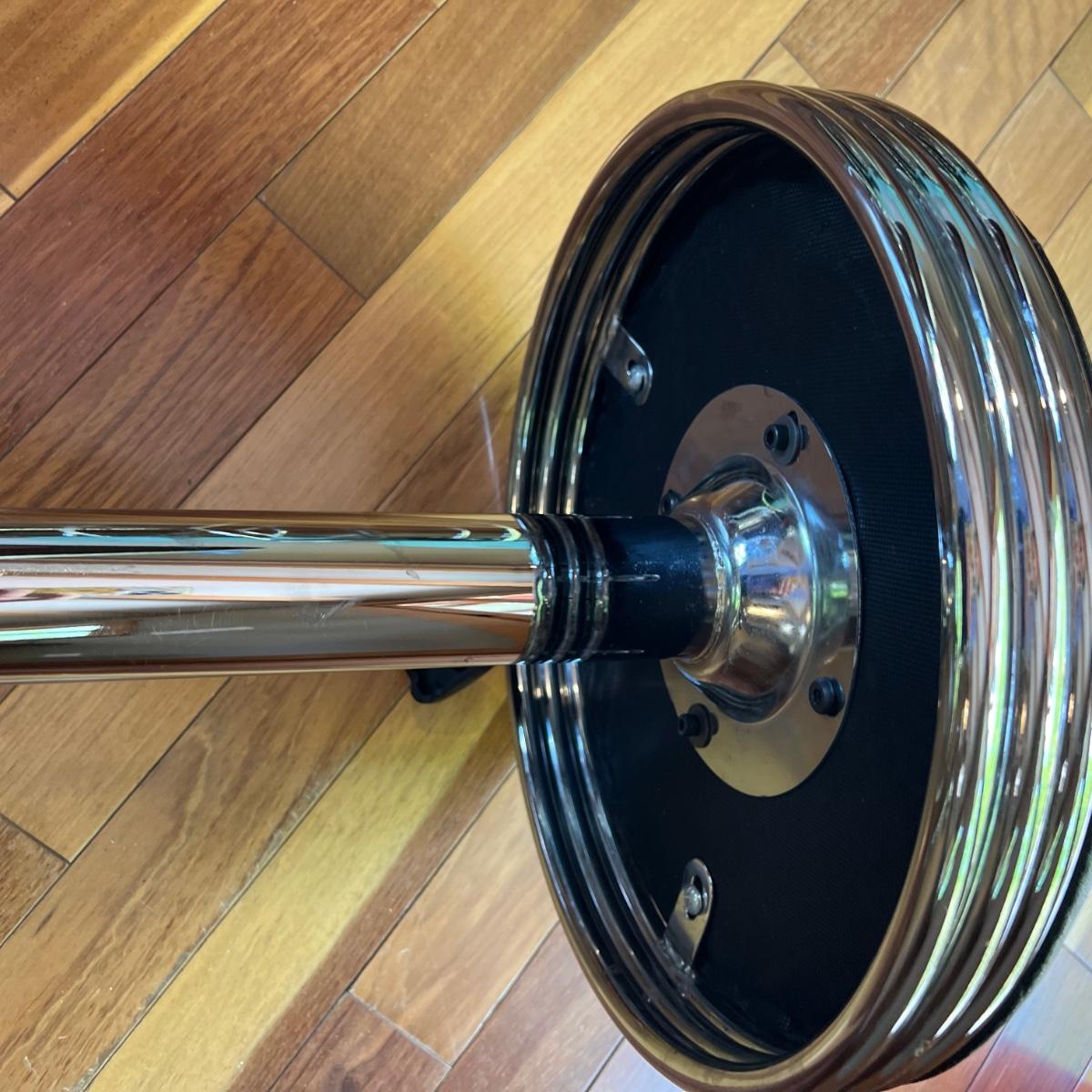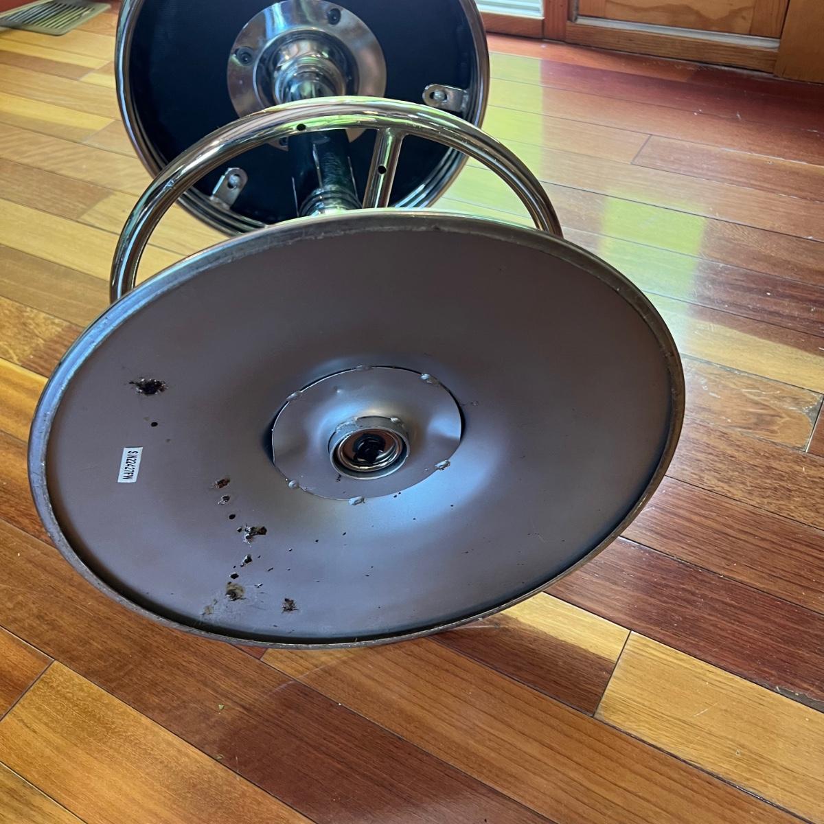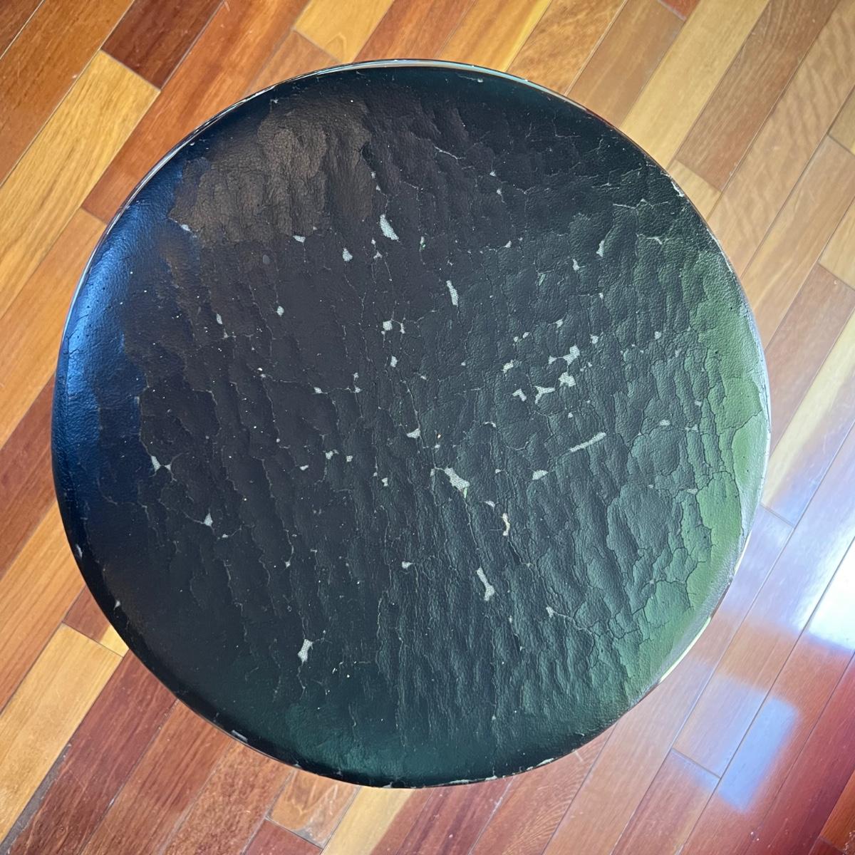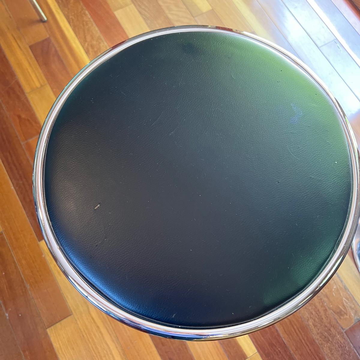 Three retro swivel adjustable height stools with a metal chrome frame and faux leather upholstery. Their dimensions are 15” D x 23-31” H.