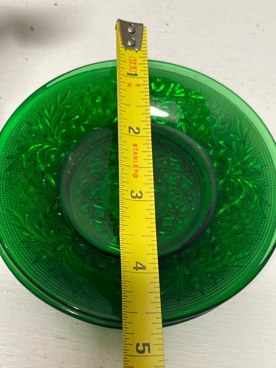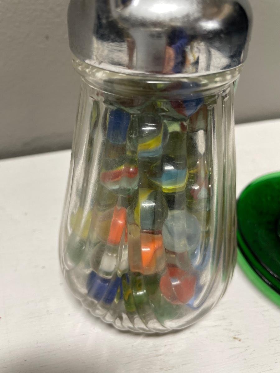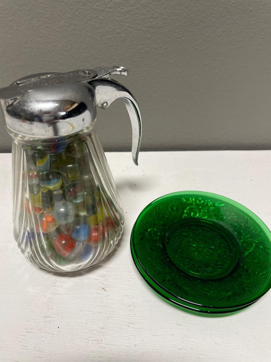 Vintage syrup bottle with marbles and 2 green glass plates