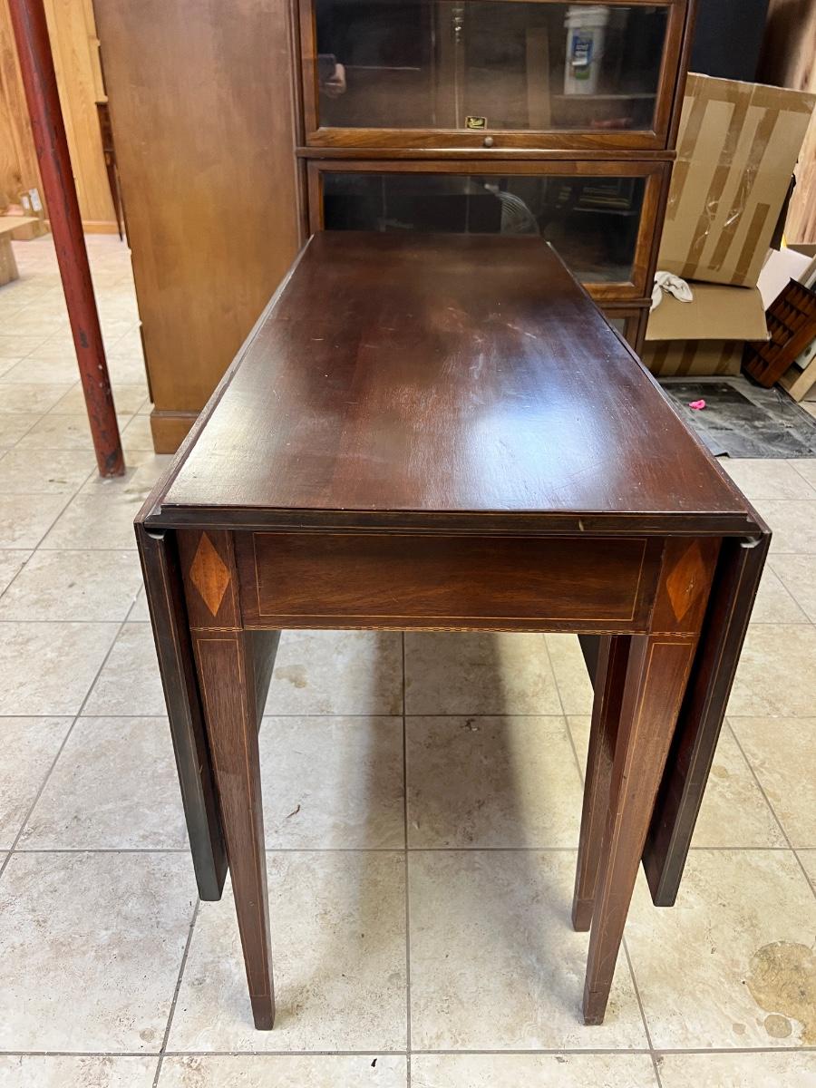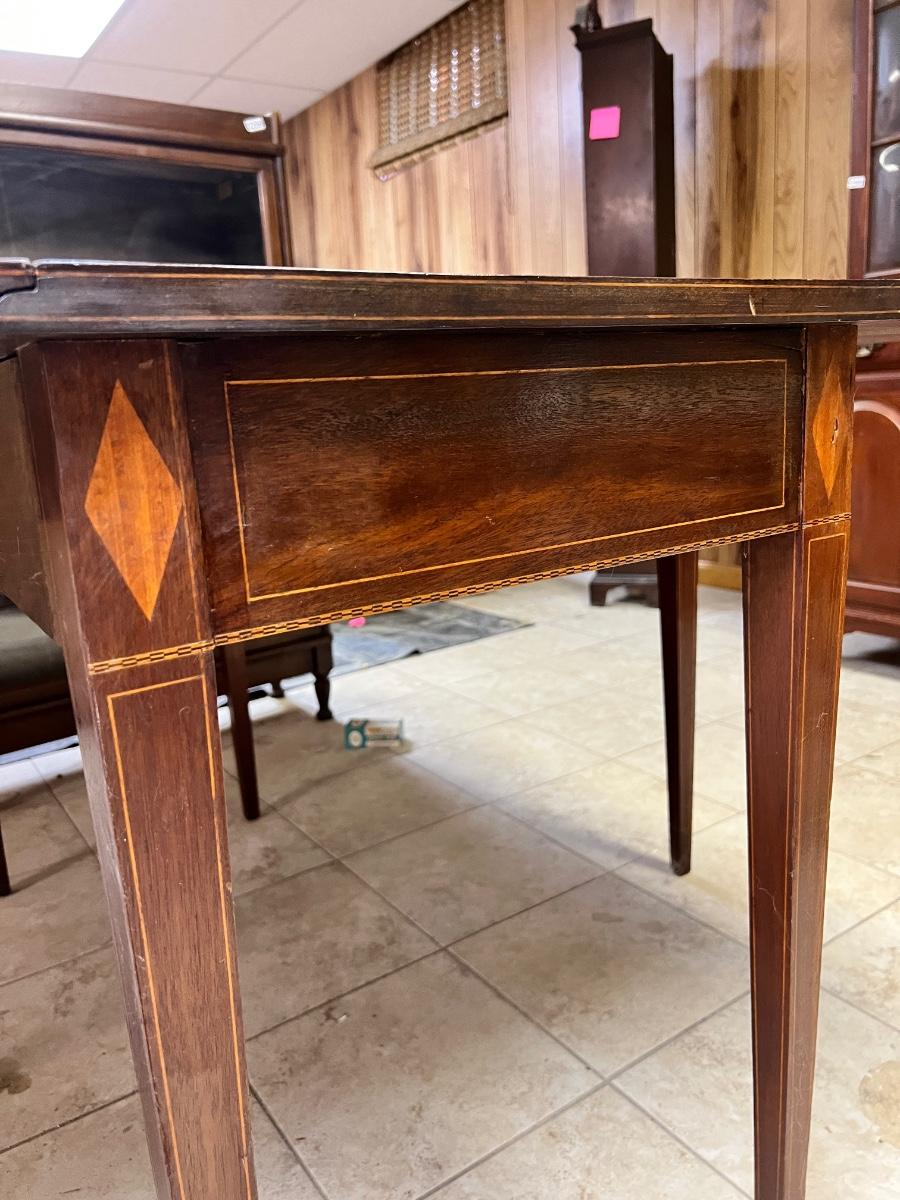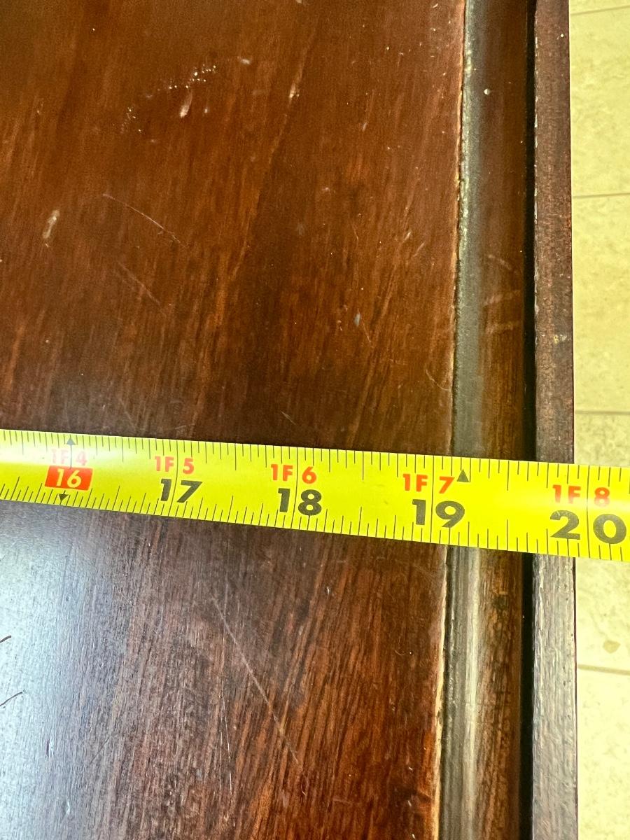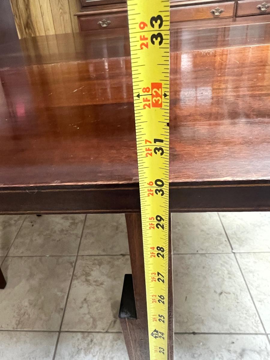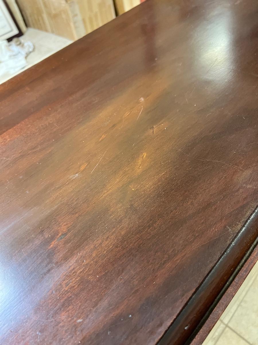 Inlaid wood detail. Its a great solid piece, but has scratches and shows wear as shown in pics. NOTE: PICK UP ONLY IN DUNKIRK MD.
