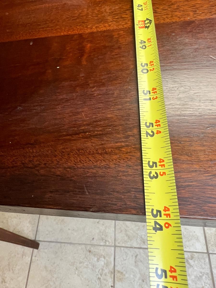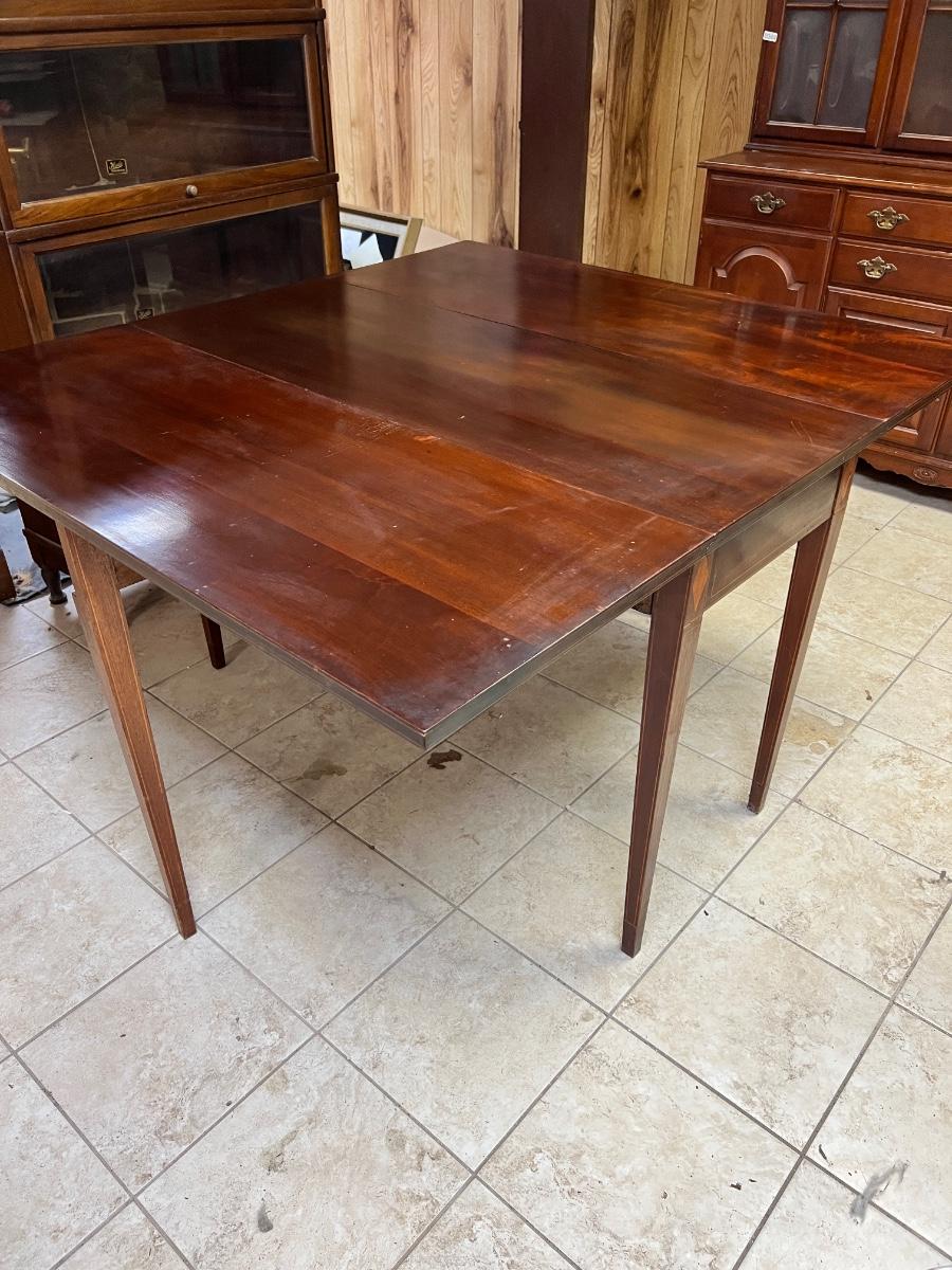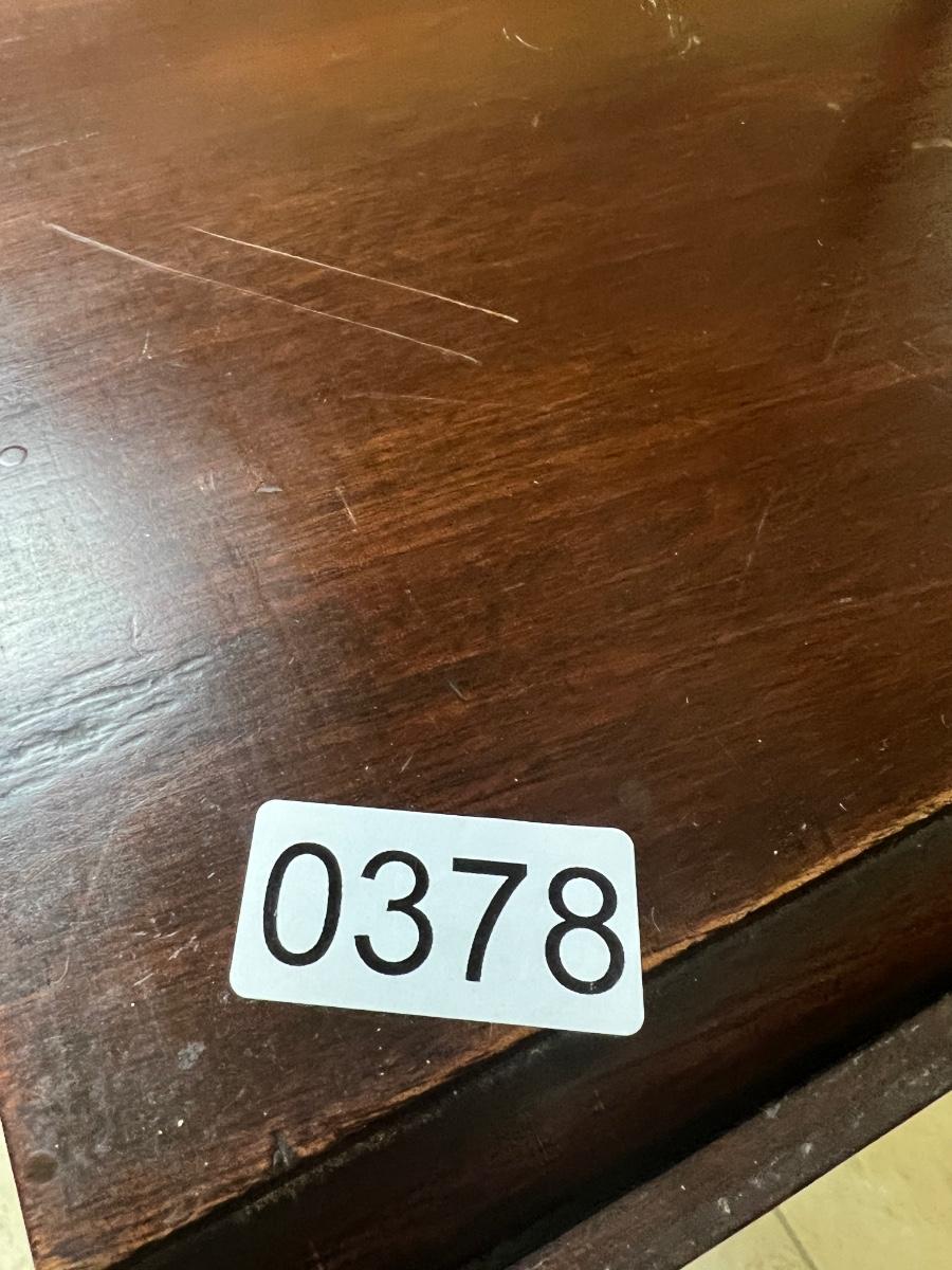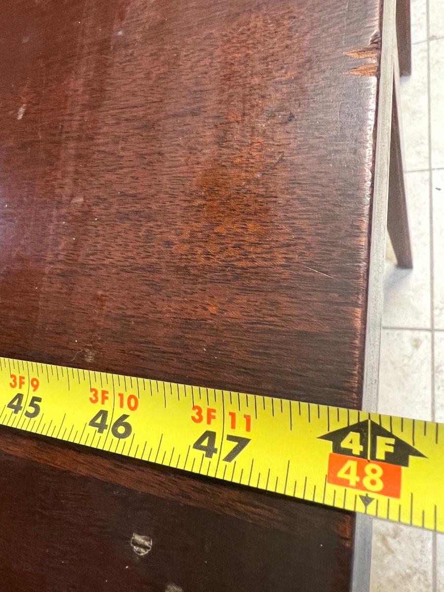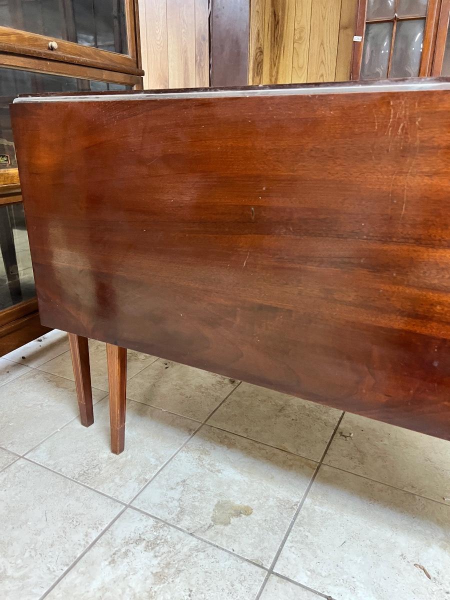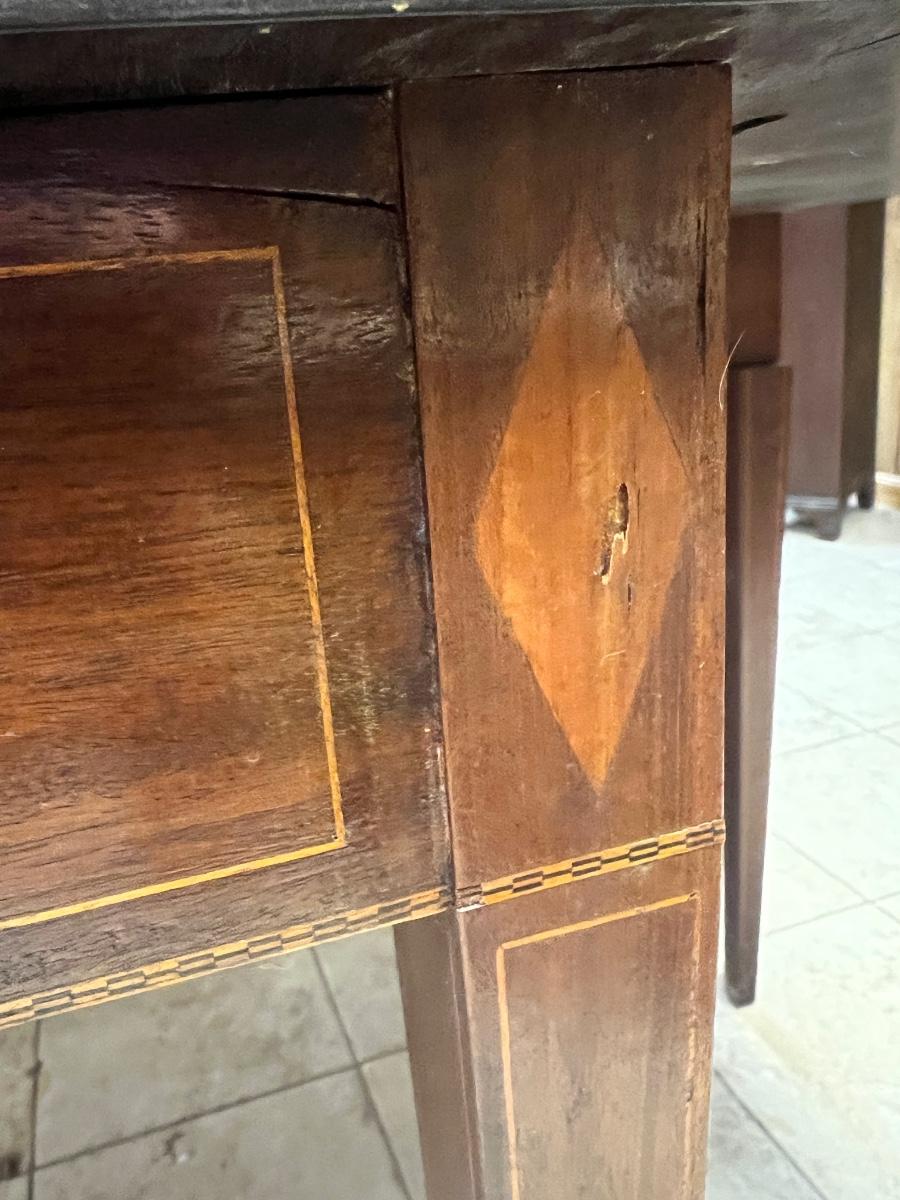 Inlaid wood detail. Its a great solid piece, but has scratches and shows wear as shown in pics. NOTE: PICK UP ONLY IN DUNKIRK MD.