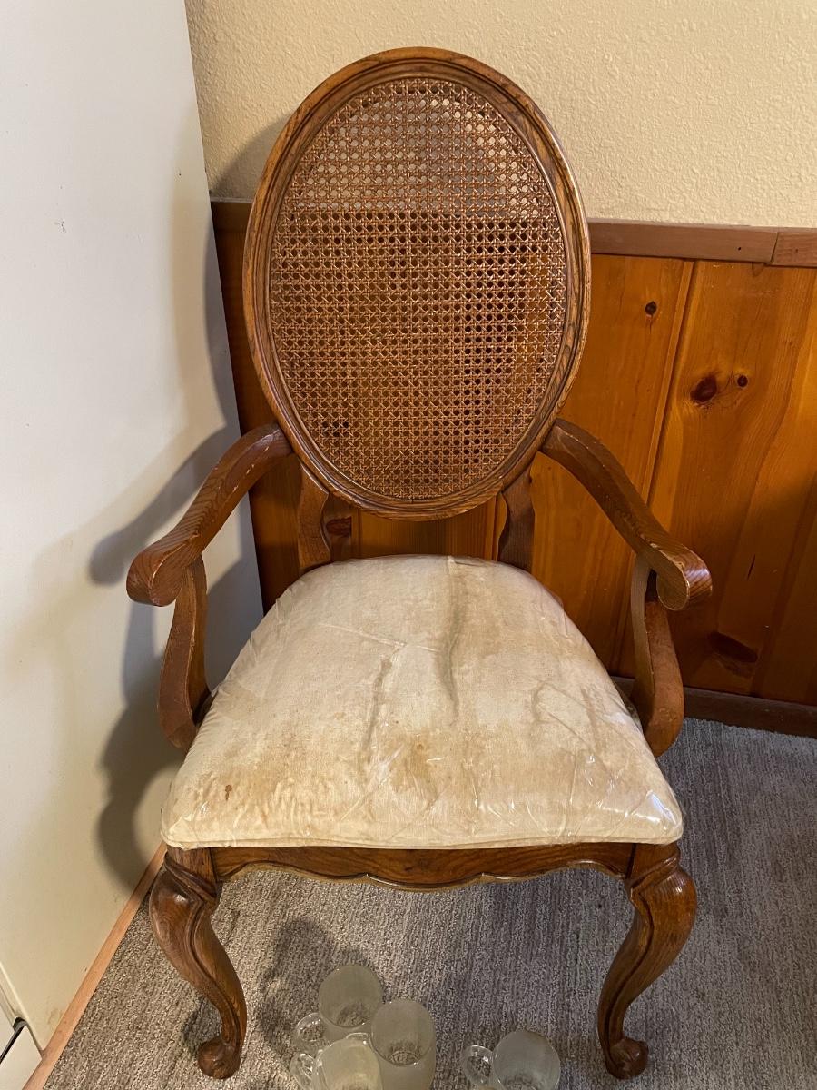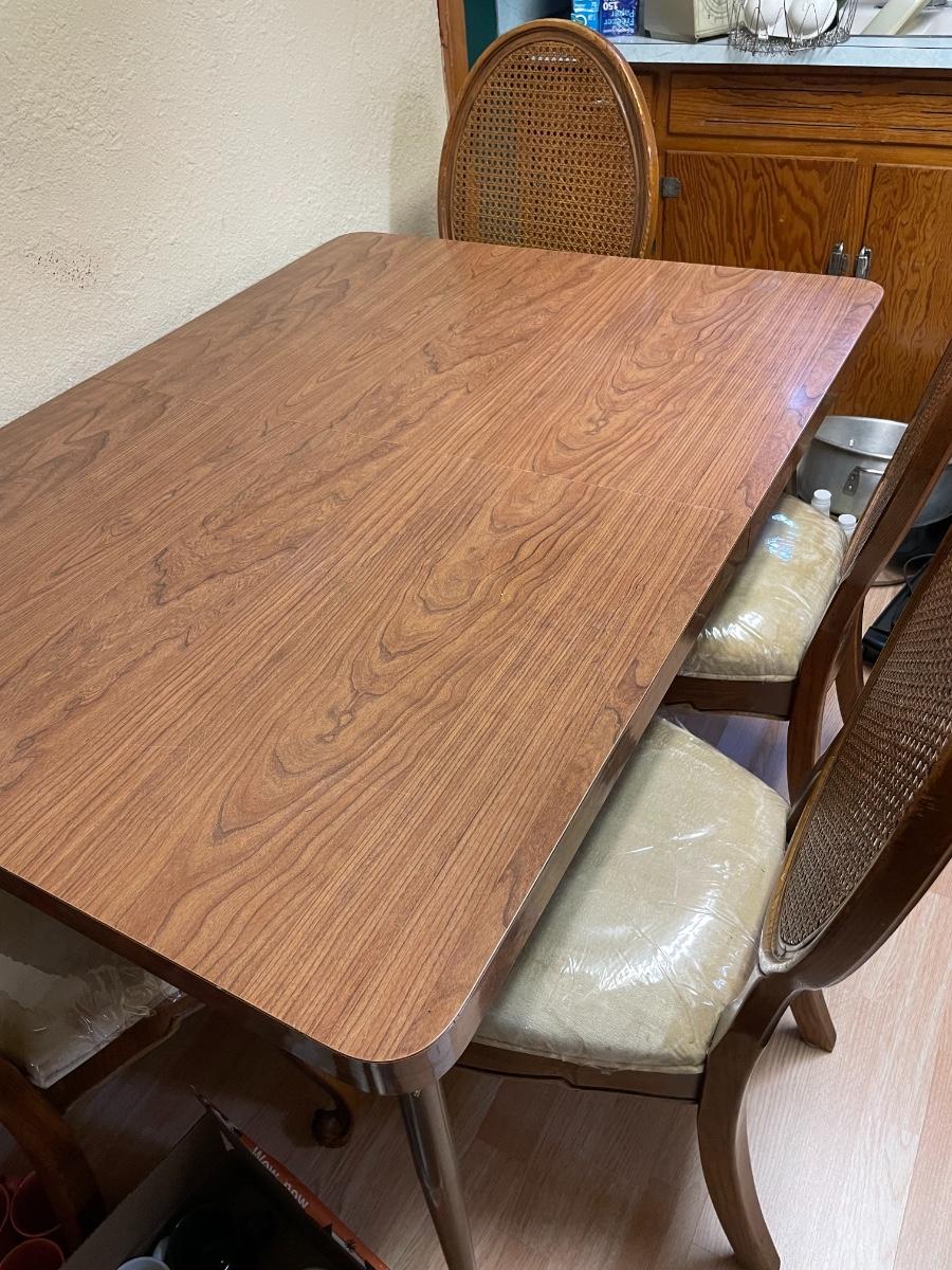 Vintage table with metal legs. Includes 6 wicker back chair with padded seats
