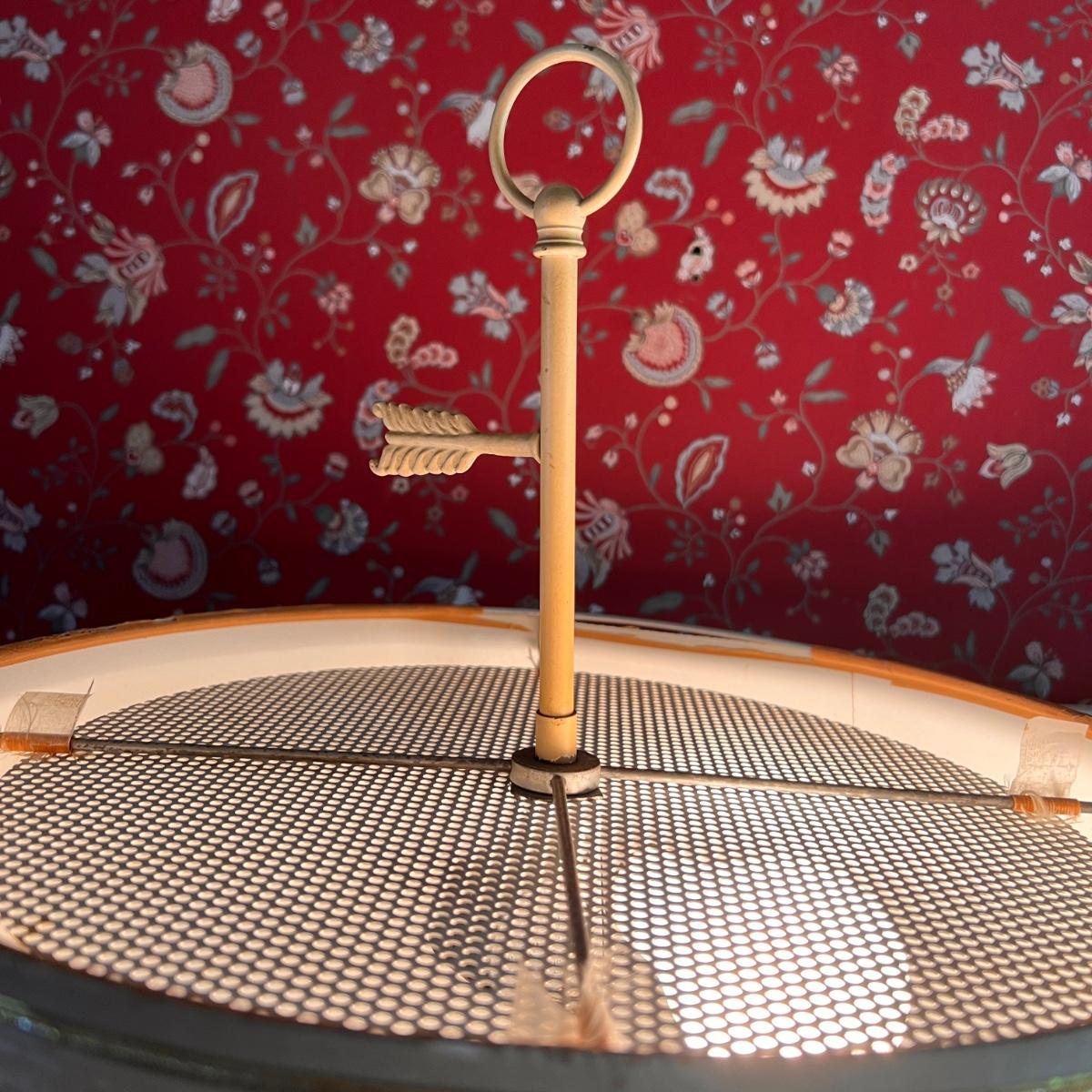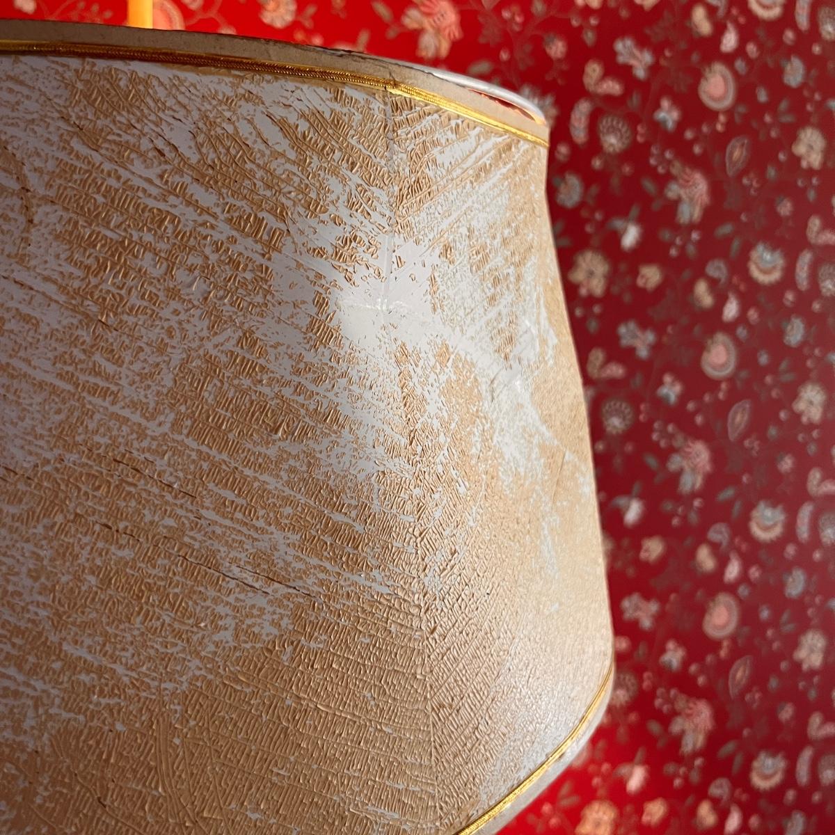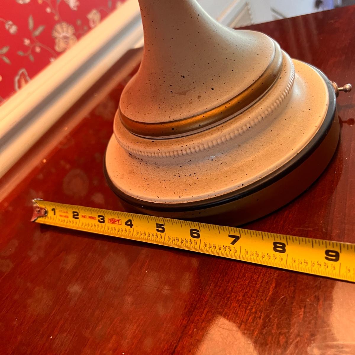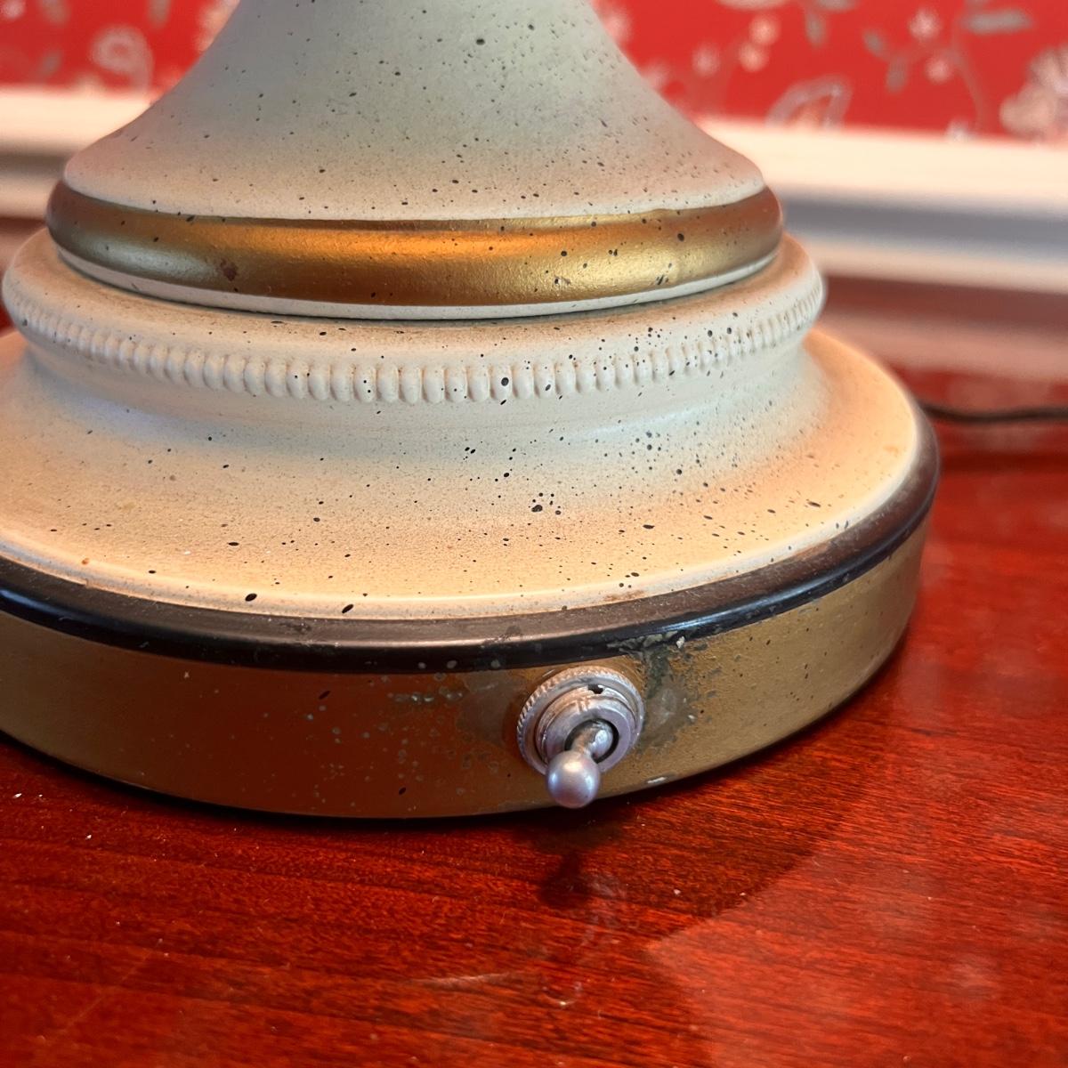 Retro Mid Century Modern metal lamp in speckled cream color with gold and black highlights. It is in need of a new lampshade. See all pics.