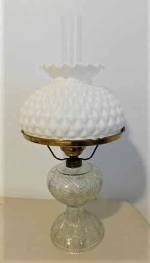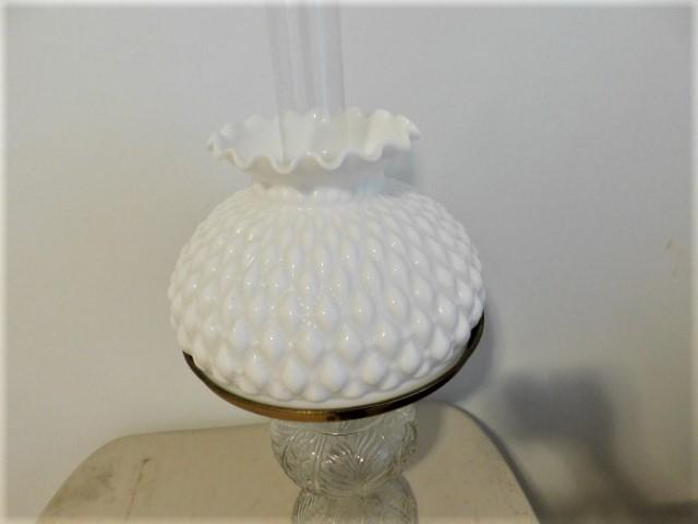 Vintage Table Hurricane Lamp with Clear Glass Post and Layered Milk Glass Shade