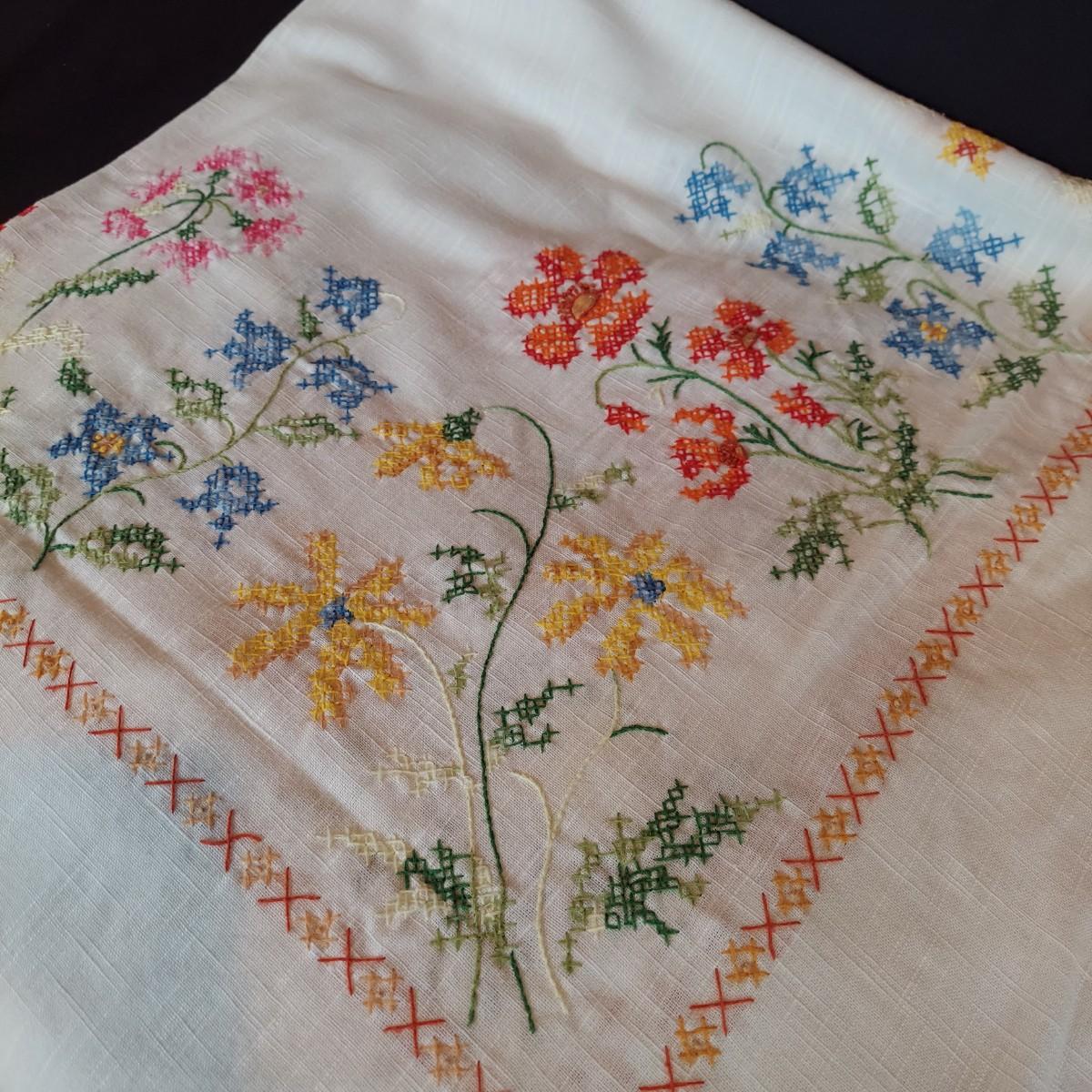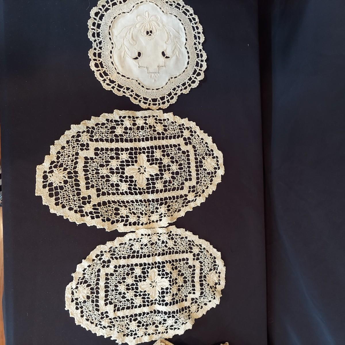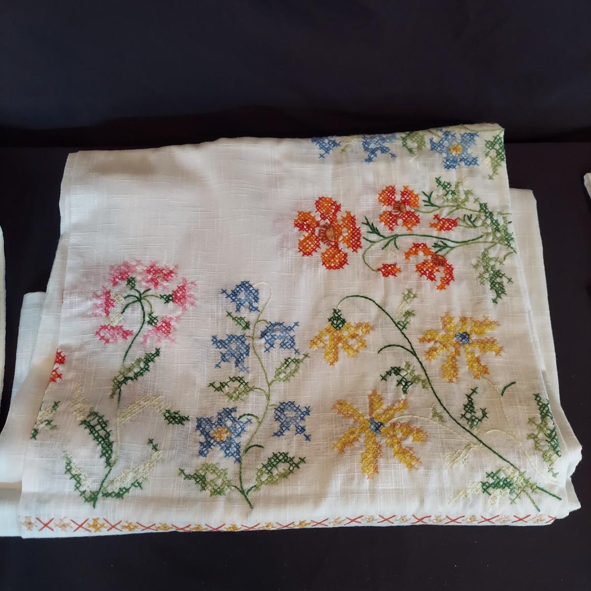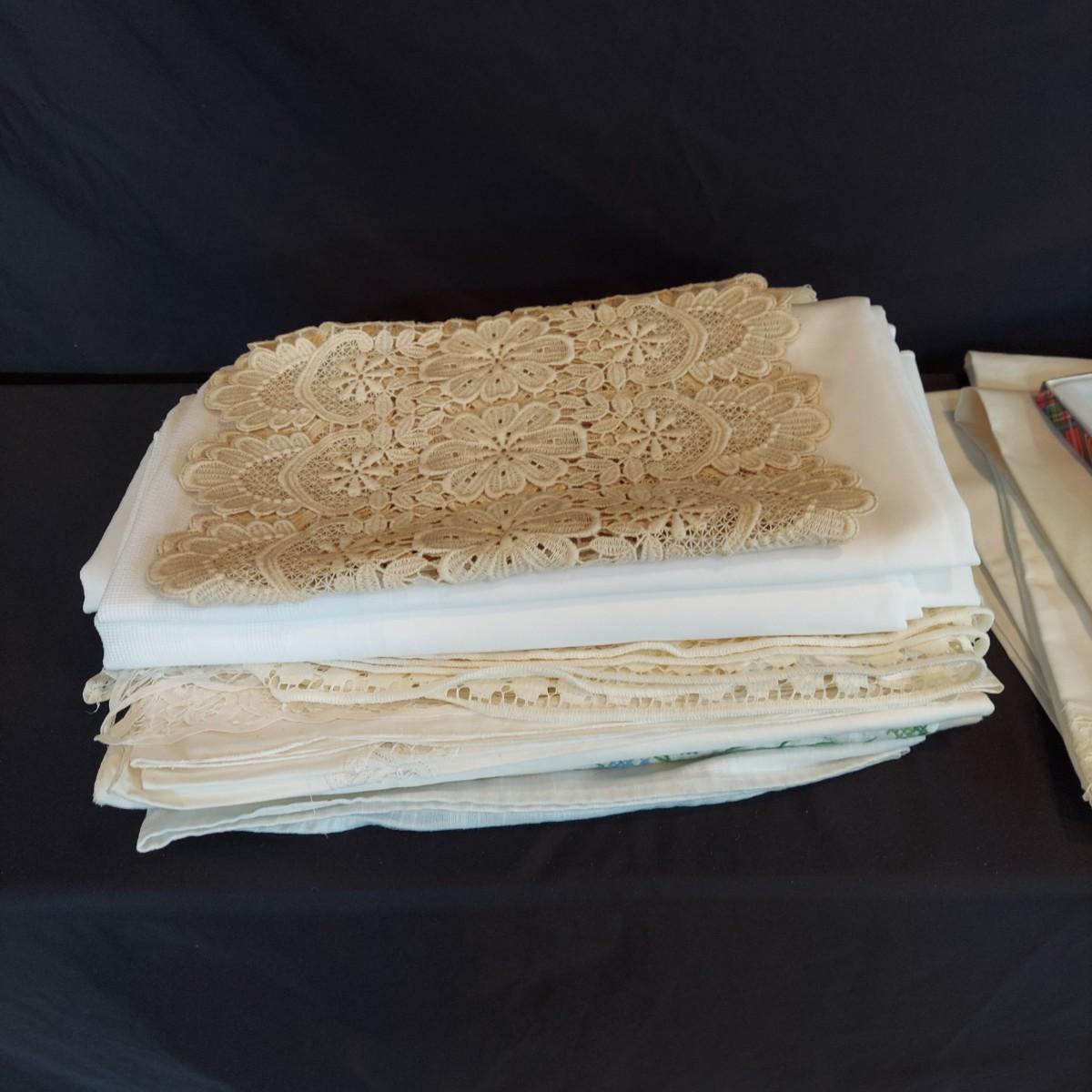 Several vintage Table linens including tablecloths, cloth napkins, table runners and decorative doilies. Shipping available