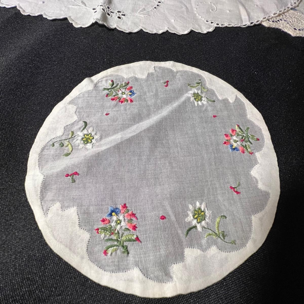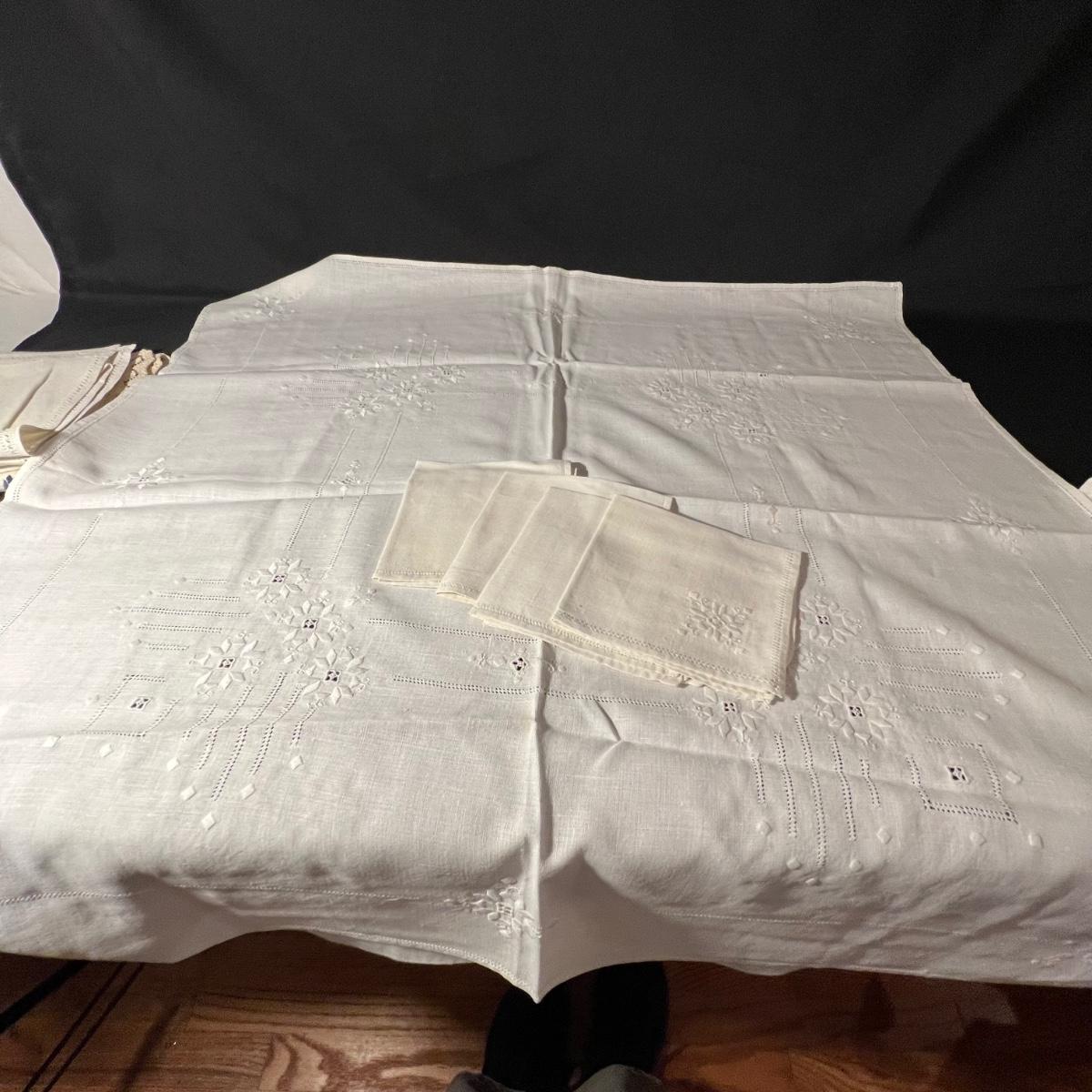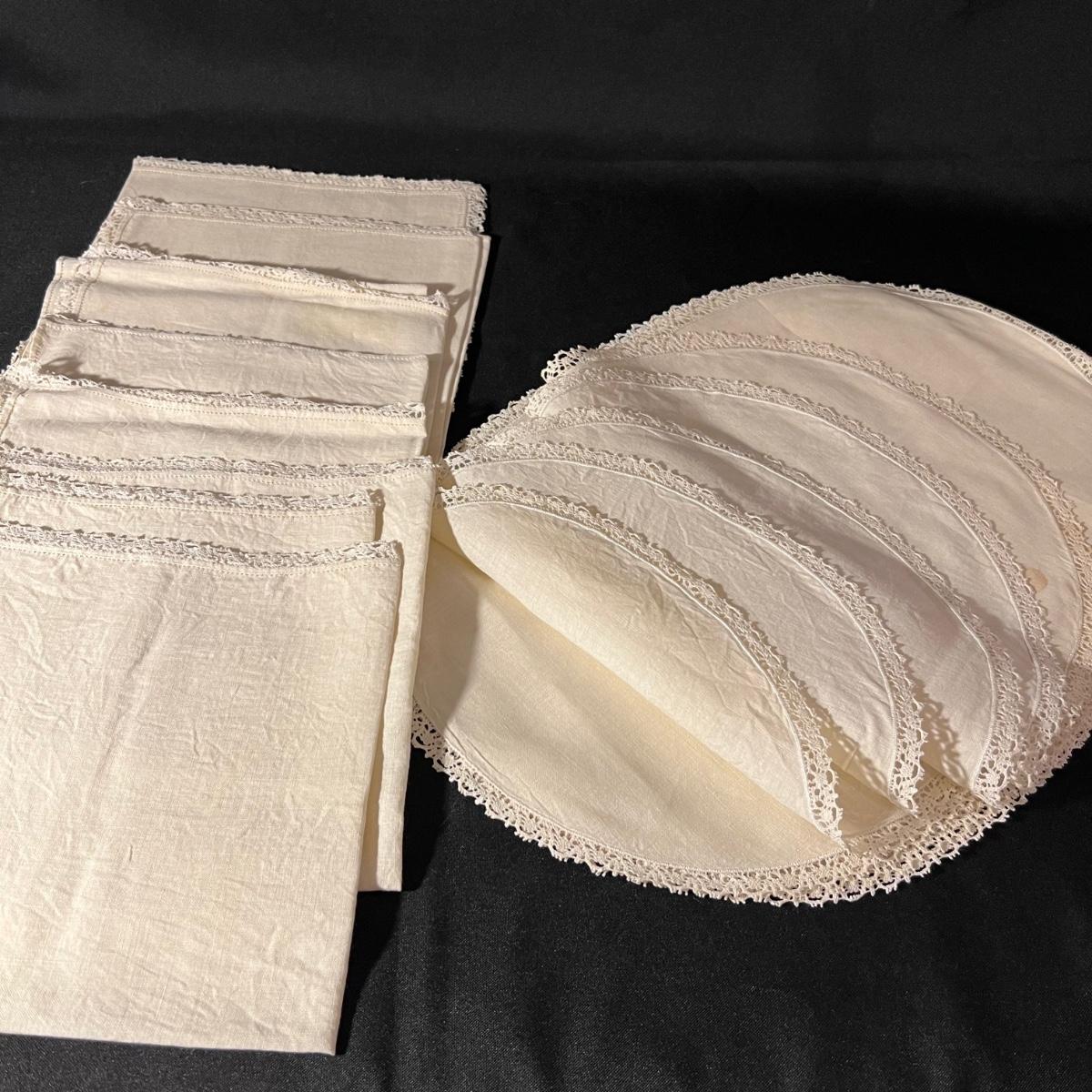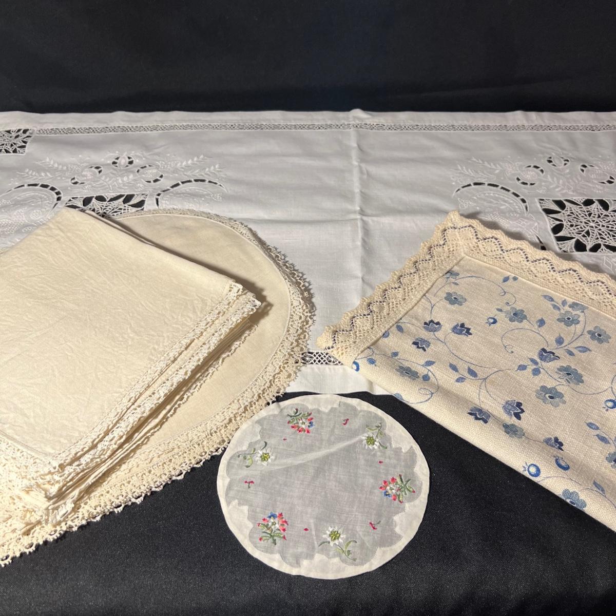 An assortment of well cared for vintage linens includes a white 33” square table cloth with four matching napkins. Other items include table runners, doilies and napkins. The ivory colored and lace edged set includes six placemats and eight napkins; note there are a few small stains shown in images along with other blemishes.