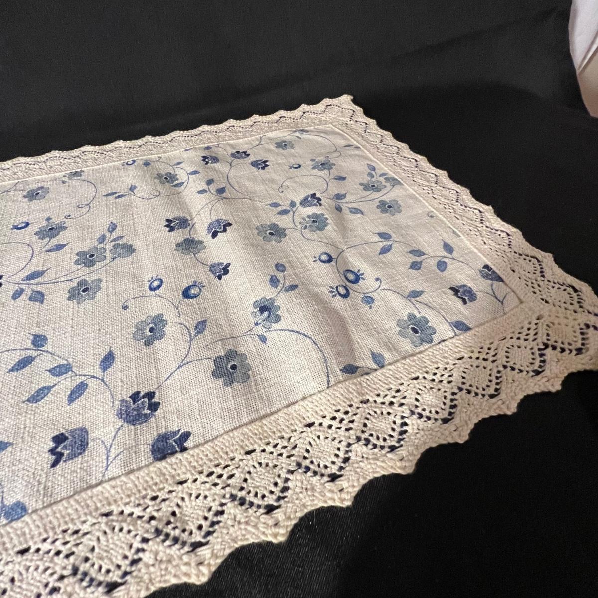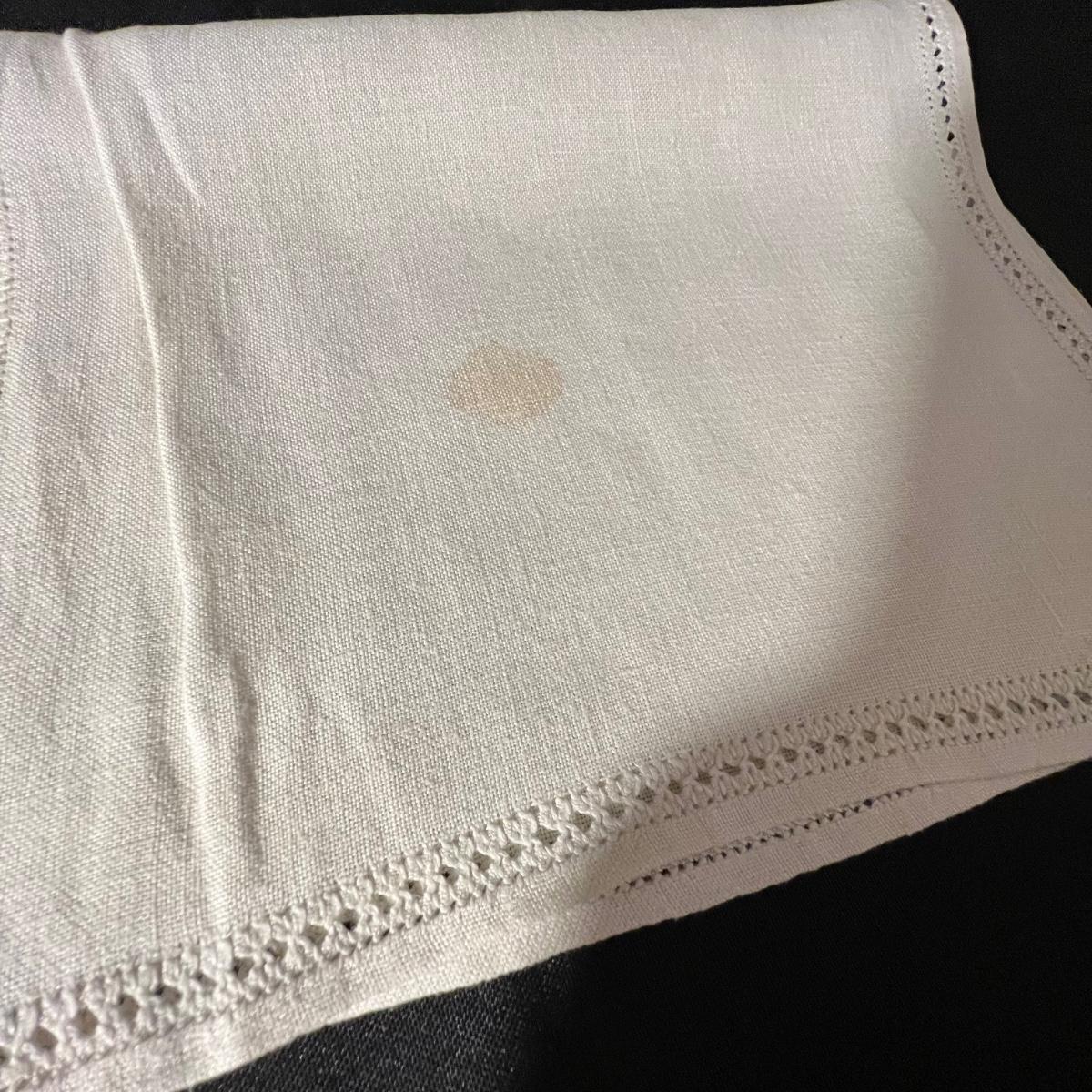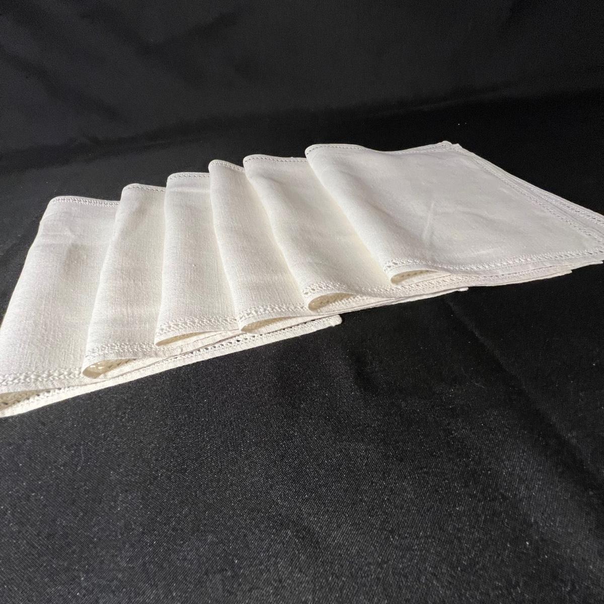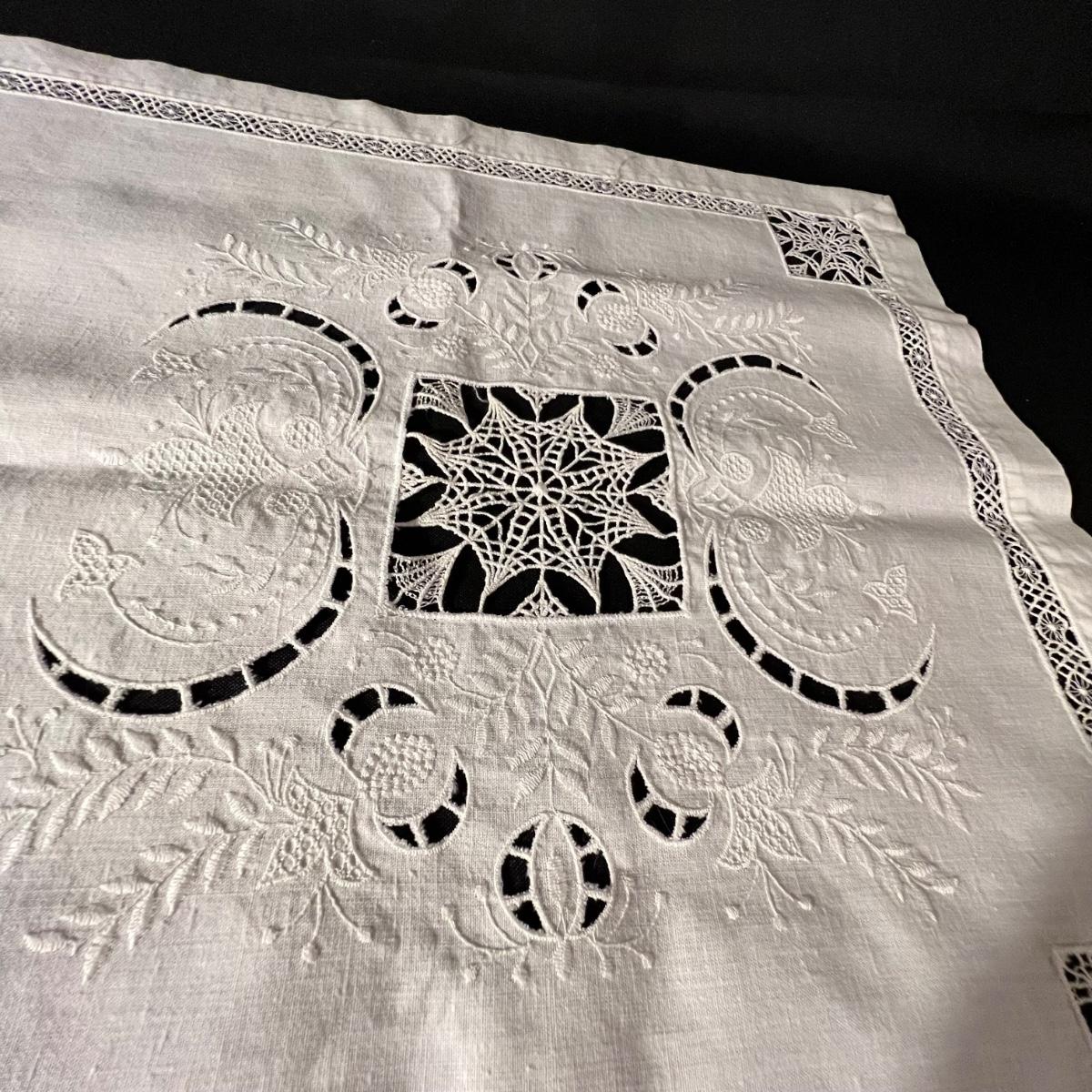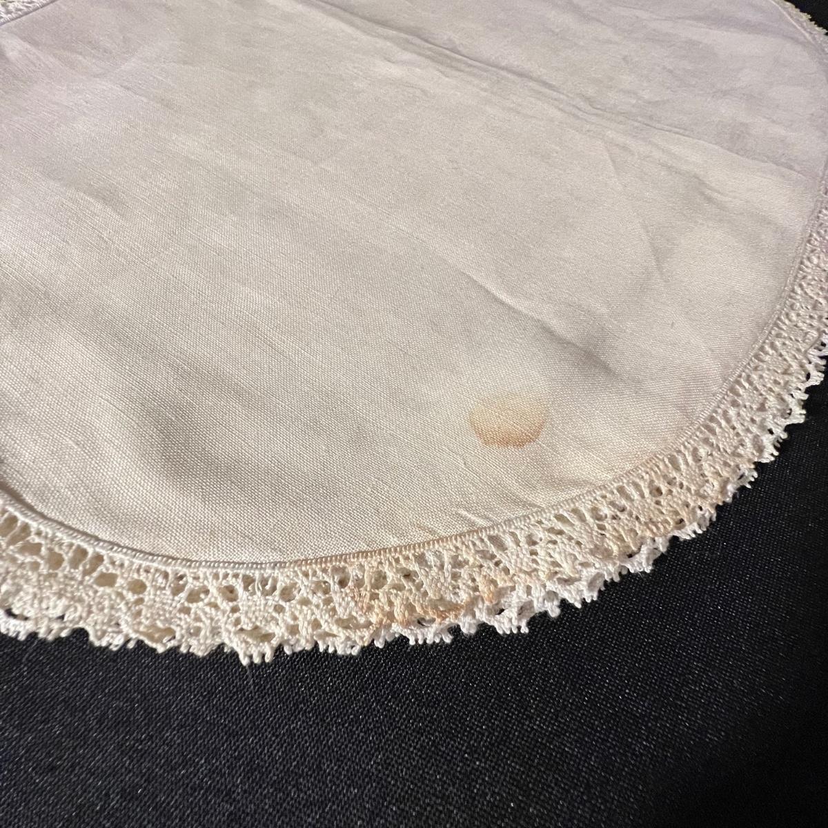 An assortment of well cared for vintage linens includes a white 33” square table cloth with four matching napkins. Other items include table runners, doilies and napkins. The ivory colored and lace edged set includes six placemats and eight napkins; note there are a few small stains shown in images along with other blemishes.