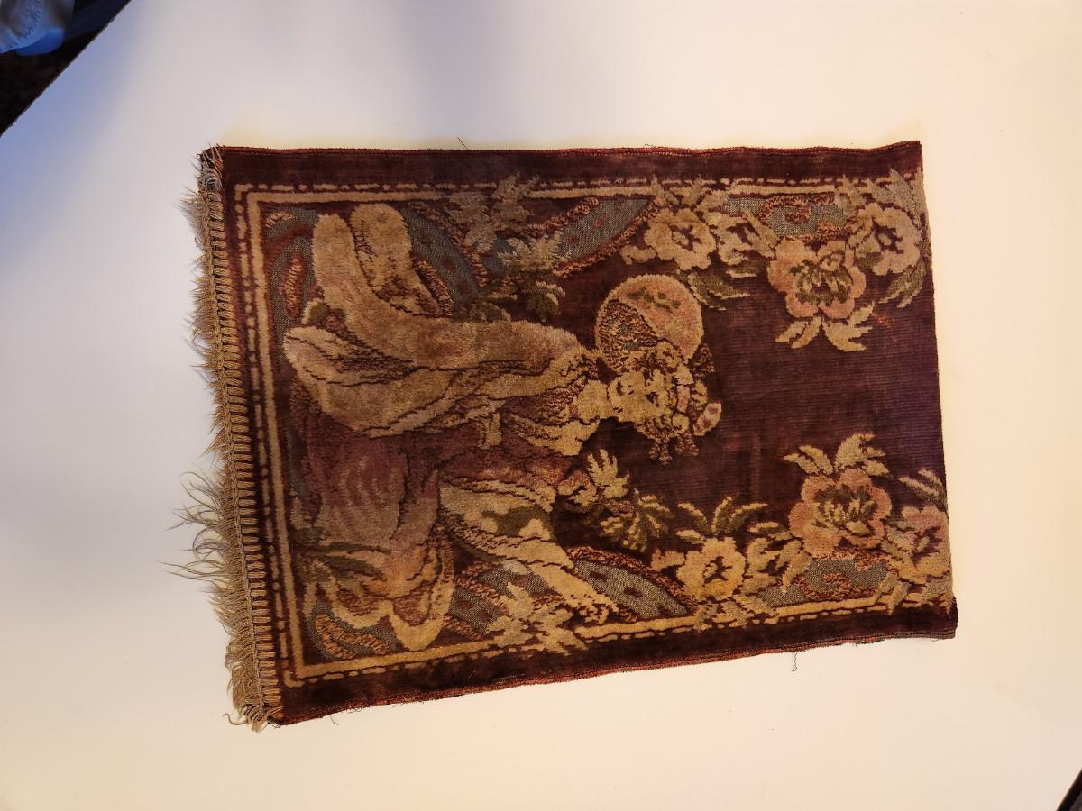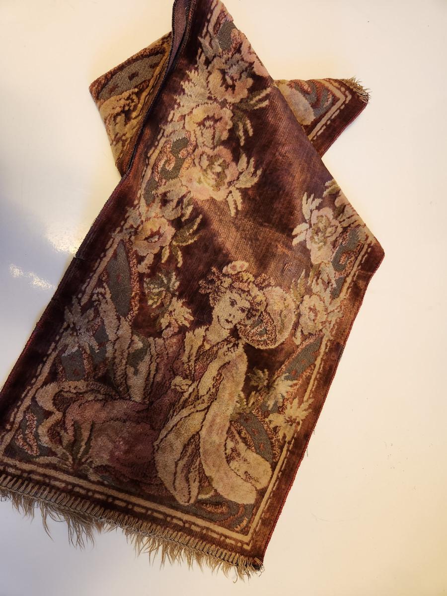 This auction lot is for a Vintage Table Scarf. This memory from the 1920's bears an Asian theme and is pretty good condition for its age. The scarf measures about 12X32-inches. Nifty maroon color with embossed design.