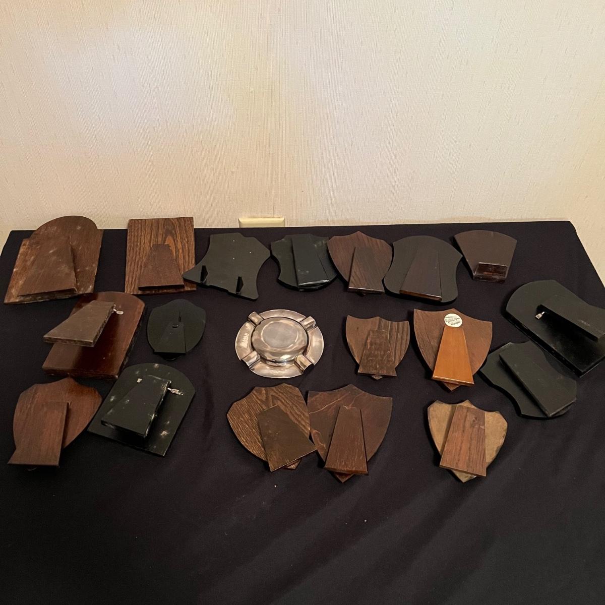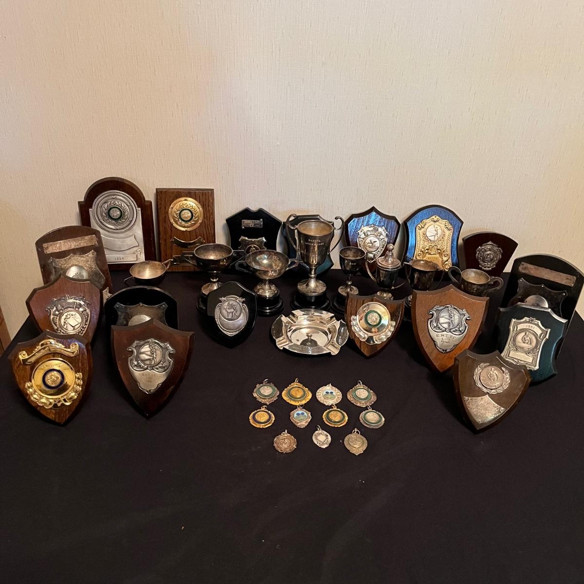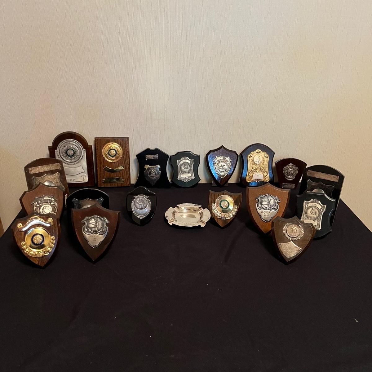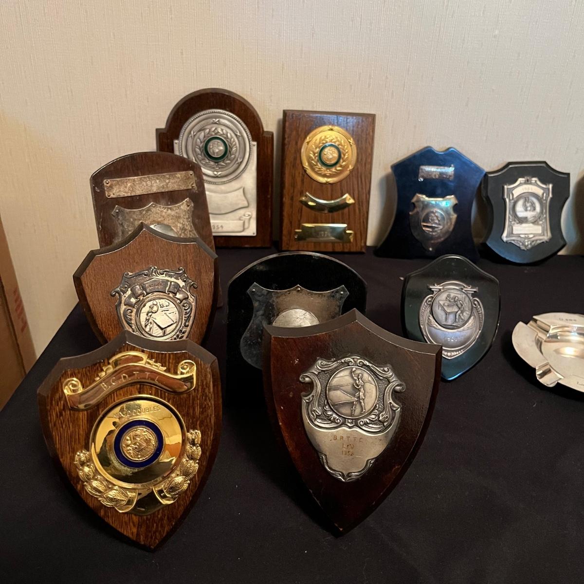 Lot includes eighteen wooden framed awards with metal, eleven pendants and eight mini cups with plastic base. Most awards are from the early 50s in Britain. Largest piece measures 4.5” x 6”.