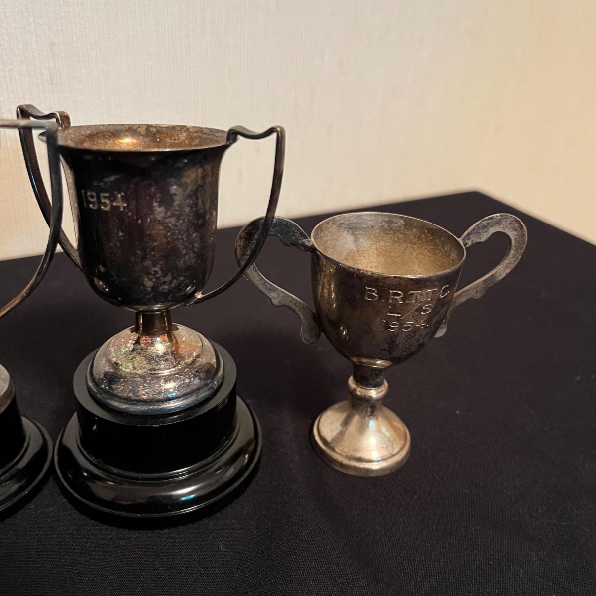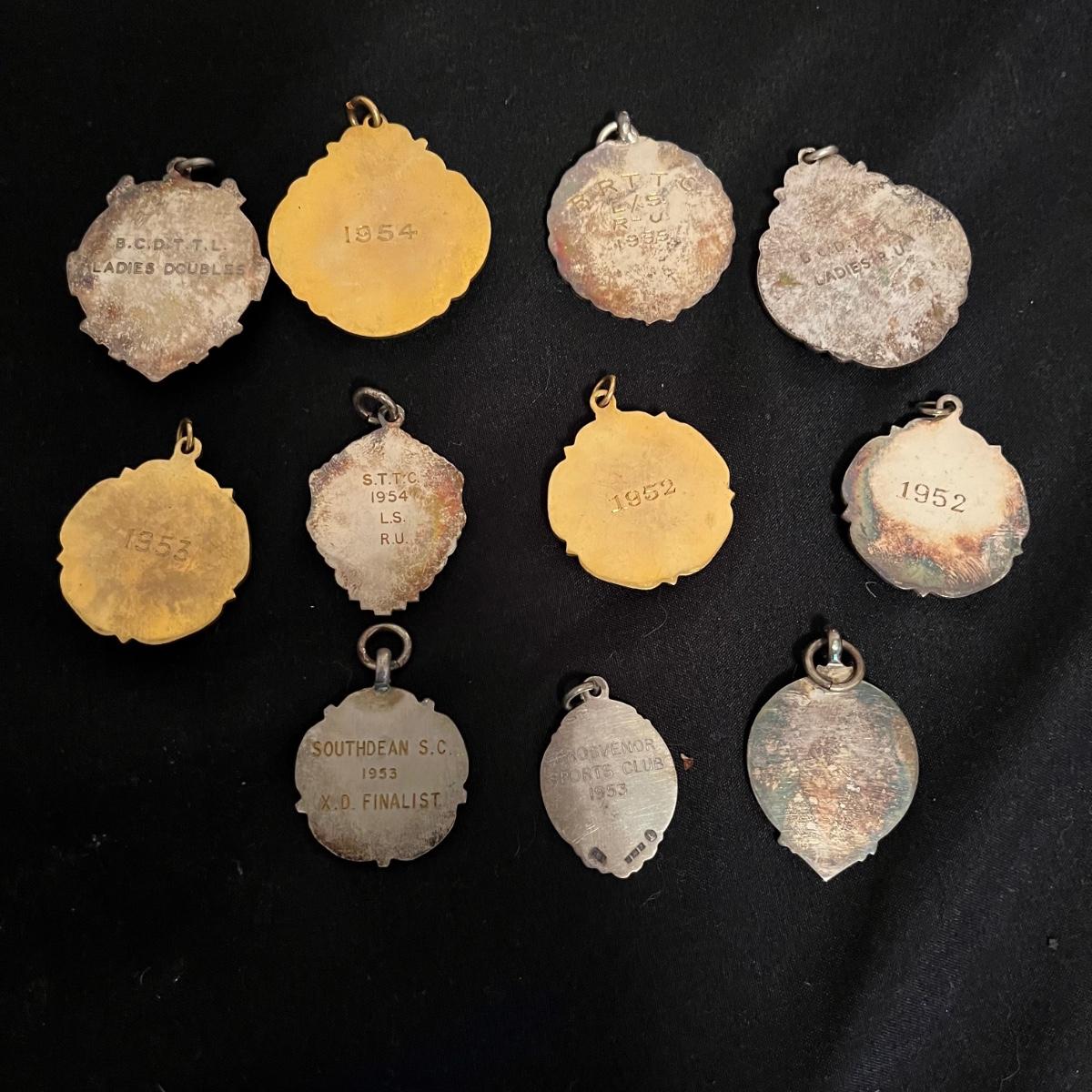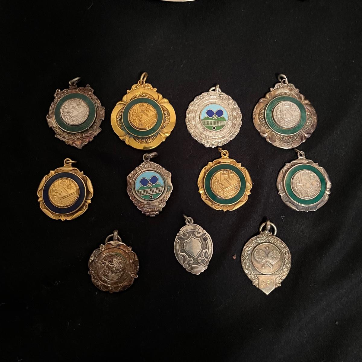 Lot includes eighteen wooden framed awards with metal, eleven pendants and eight mini cups with plastic base. Most awards are from the early 50s in Britain. Largest piece measures 4.5” x 6”.