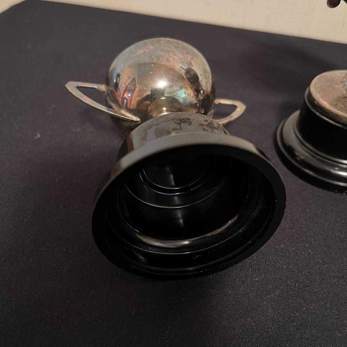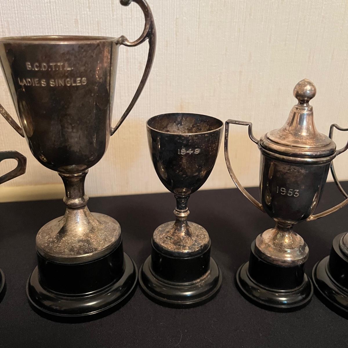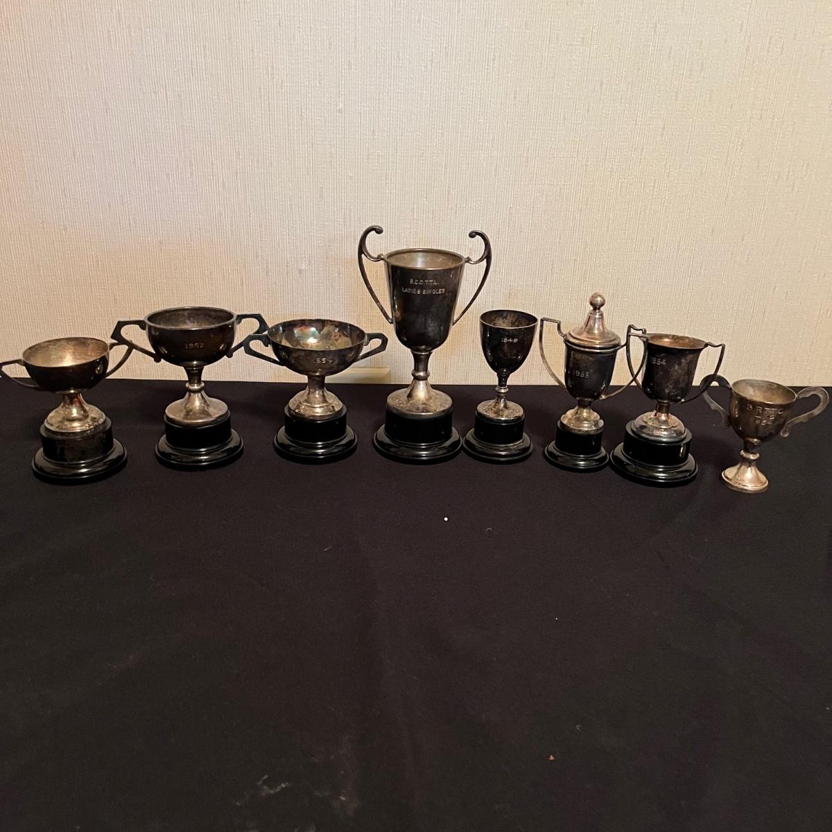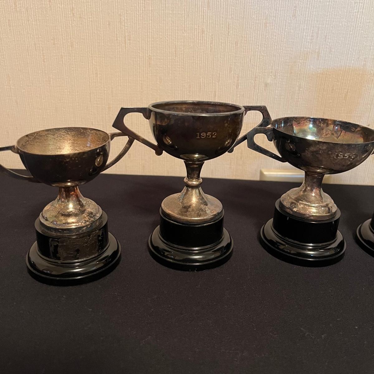 Lot includes eighteen wooden framed awards with metal, eleven pendants and eight mini cups with plastic base. Most awards are from the early 50s in Britain. Largest piece measures 4.5” x 6”.