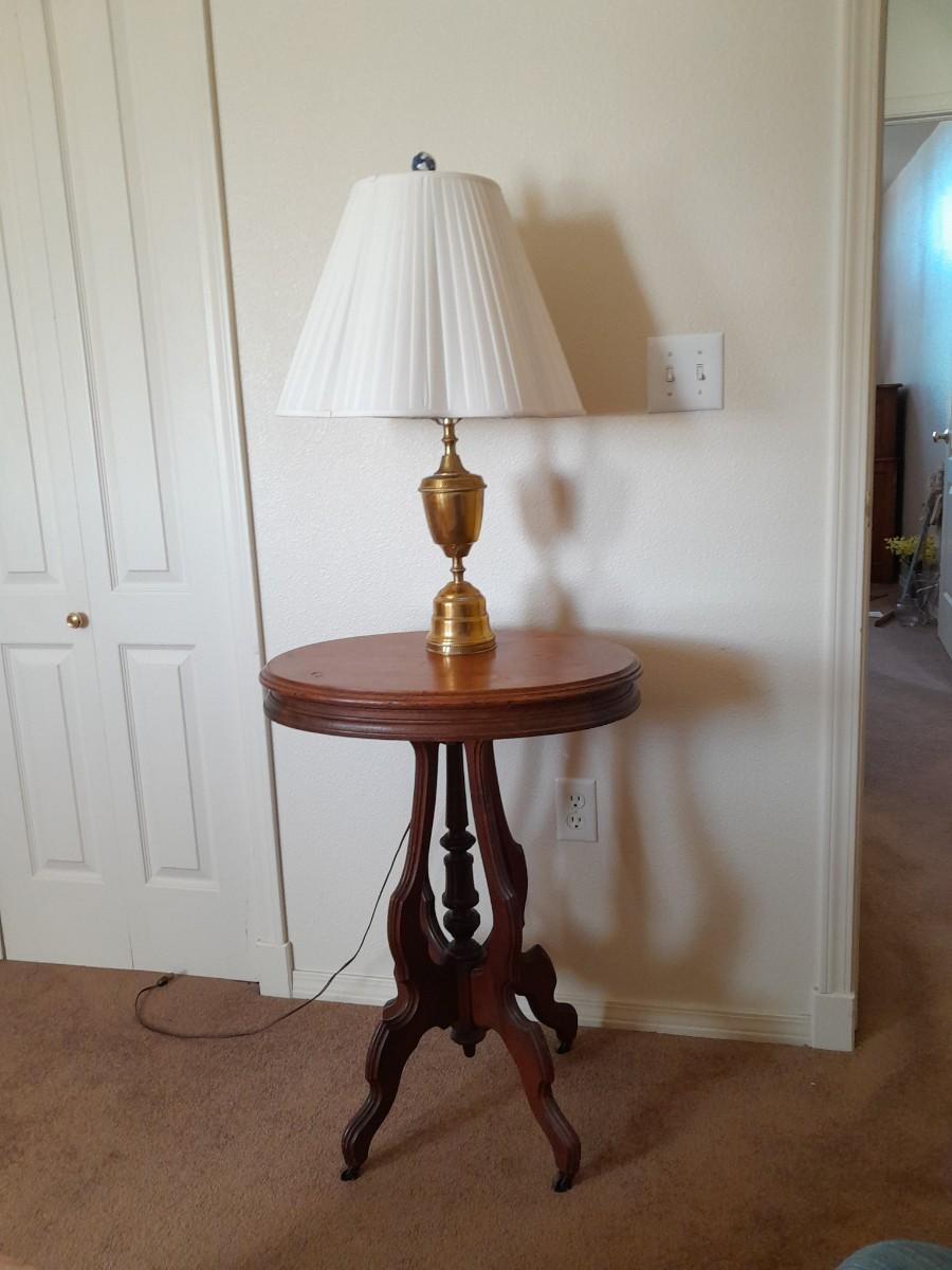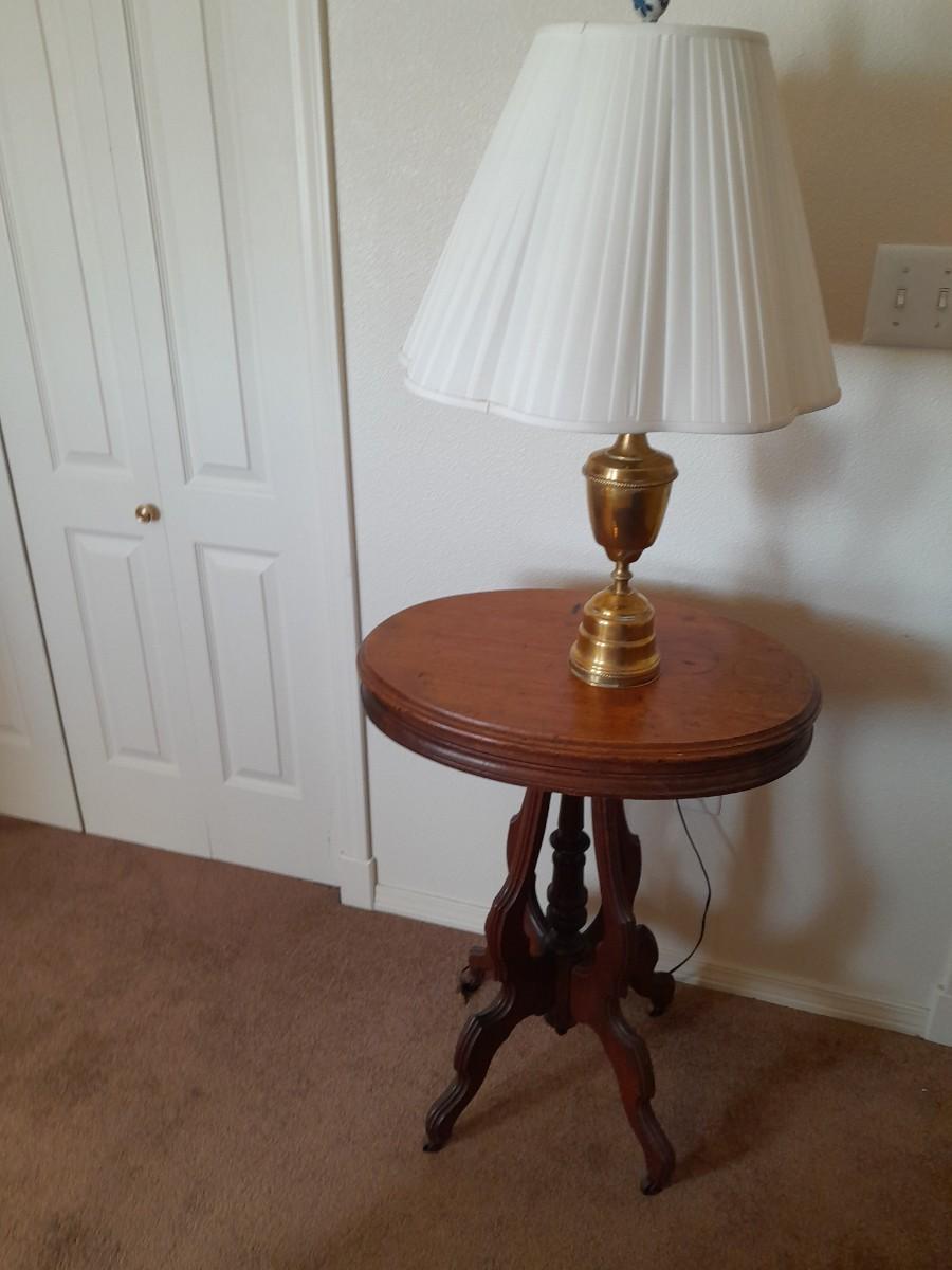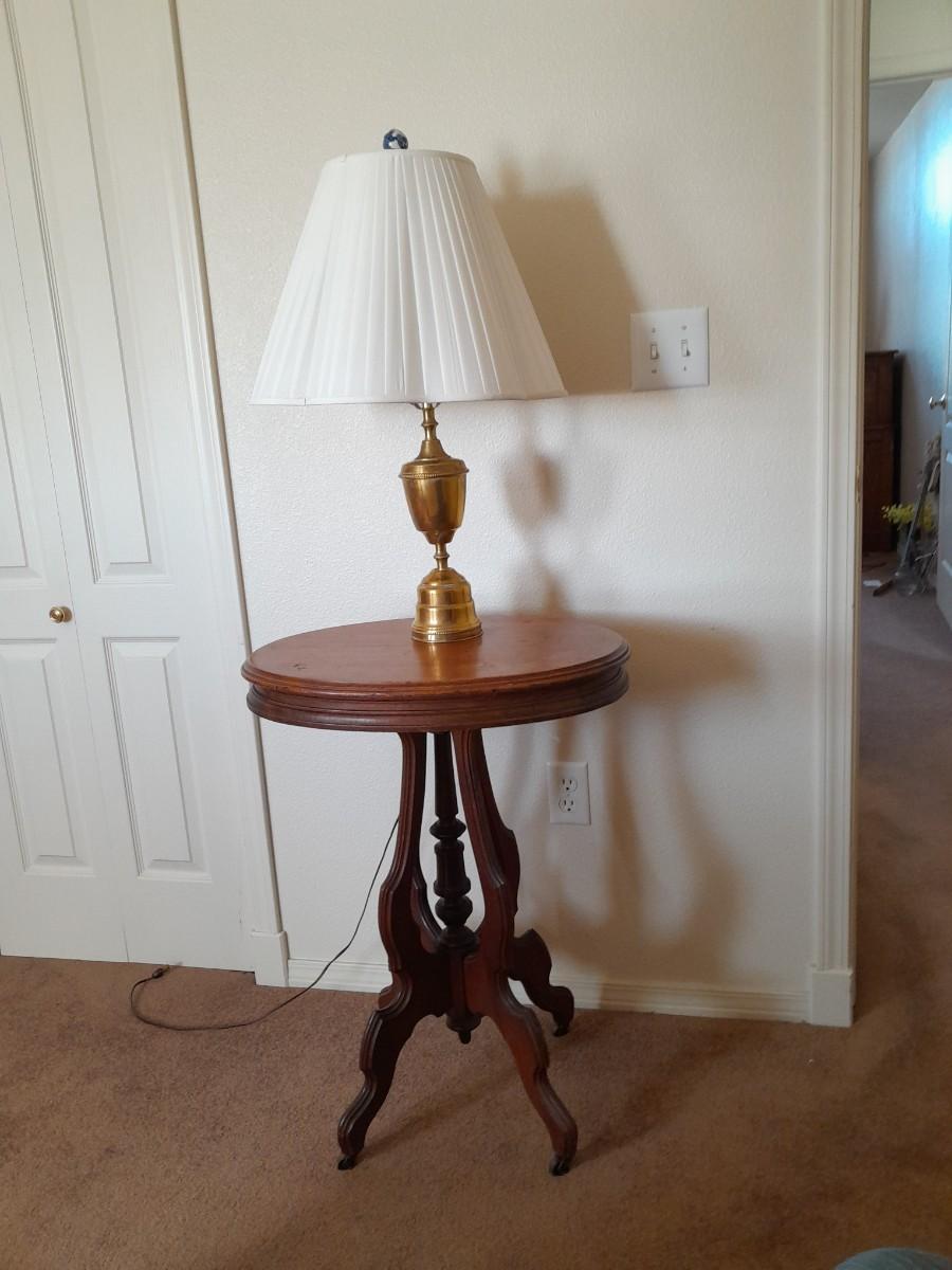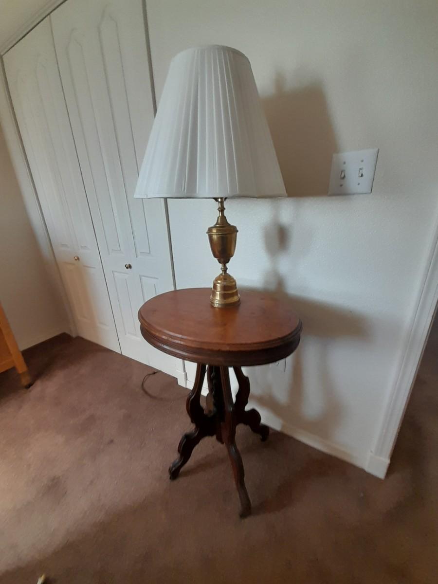 ANTIQUE TABLE WITH BRASS LAMP