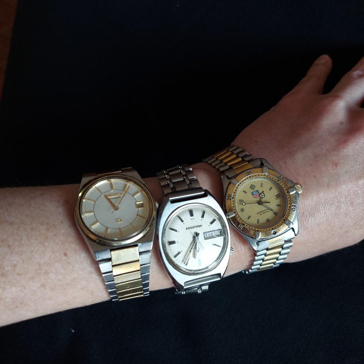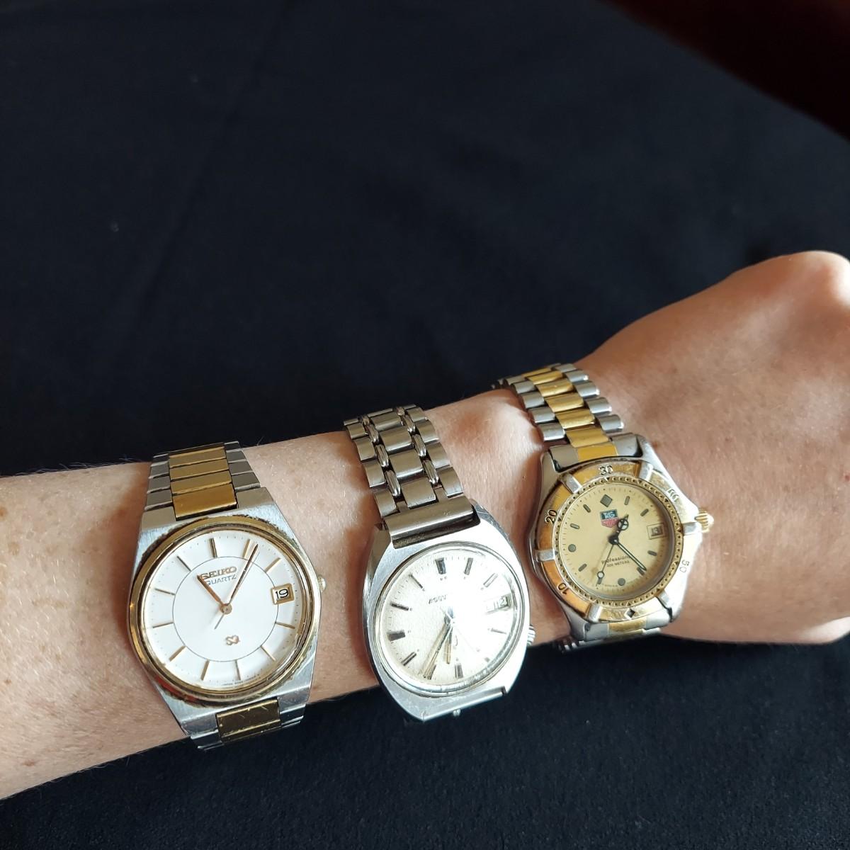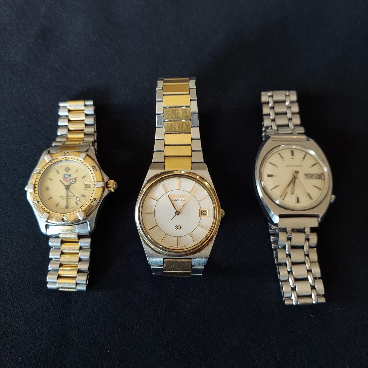 Three watches. Swiss made Tag Heuer 2000 series with stainless steel back. The battery was working when uploaded. Stainless steel Seiko Quartz watch. Bulova Accutron with stainless steel back. Both need battery replaced. Some overall wear due to age. Shipping available.