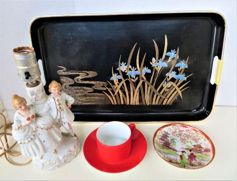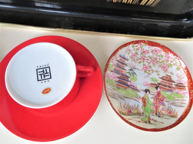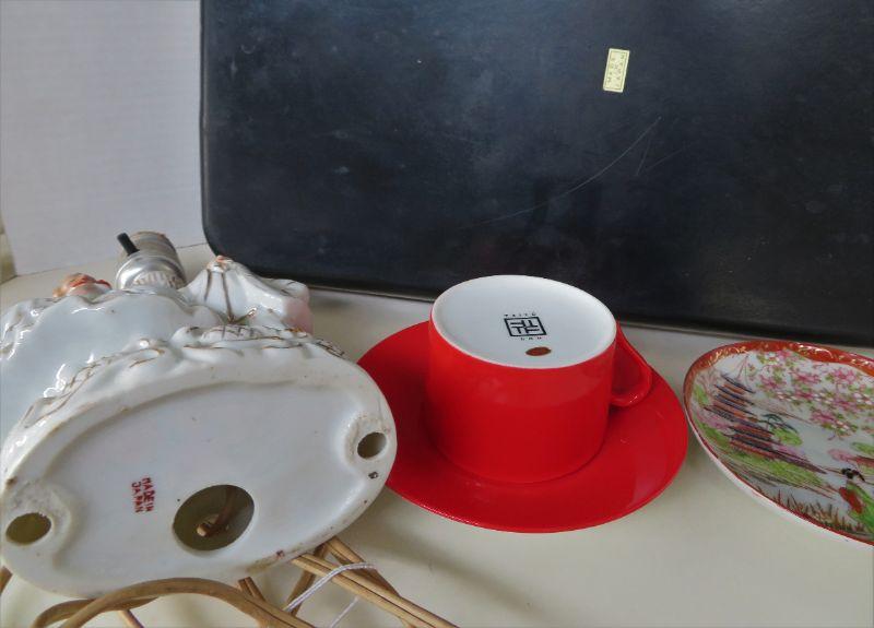 Japan Taitu Uno Porcelain Cup lipstick Red Saucer, Gold Gilt Japan Plate Serving Tray & Lamp Vintage LOT