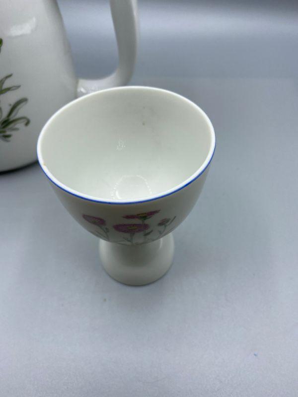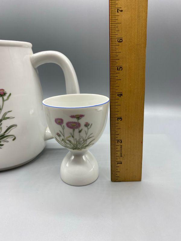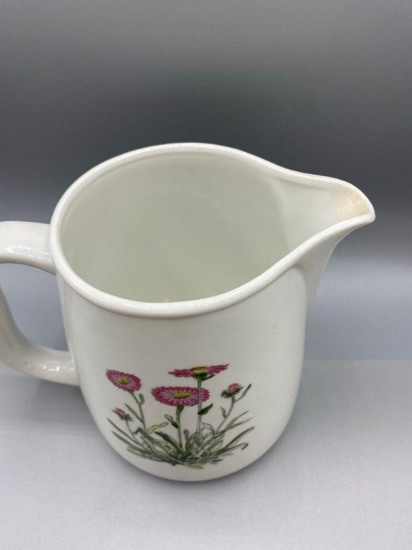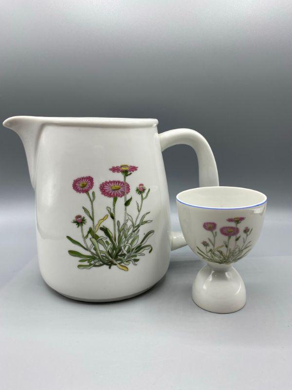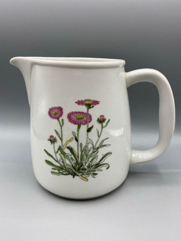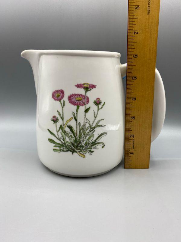 Vintage Takahashi San Francisco water pitcher and cup. Matching pink daisy/ cosmo flower pattern. Pitcher is small 6" size. Cup looks like an egg cup but could easily be a small water cup for use with pitcher at bedside. Both are in good condition.