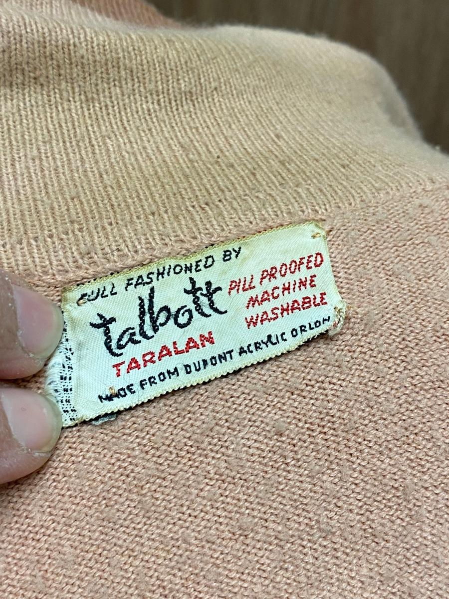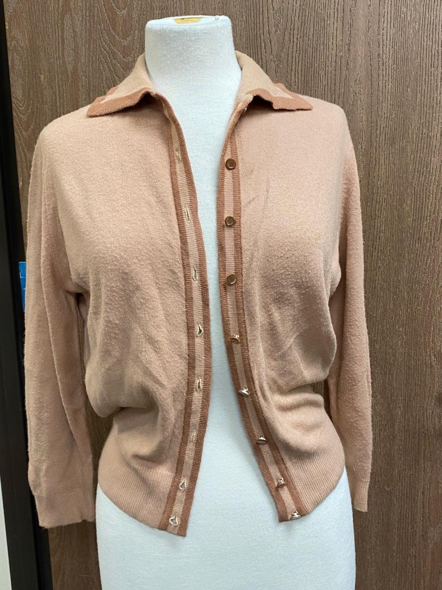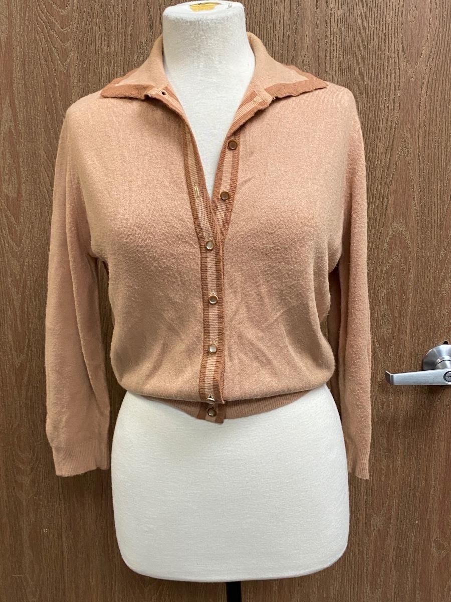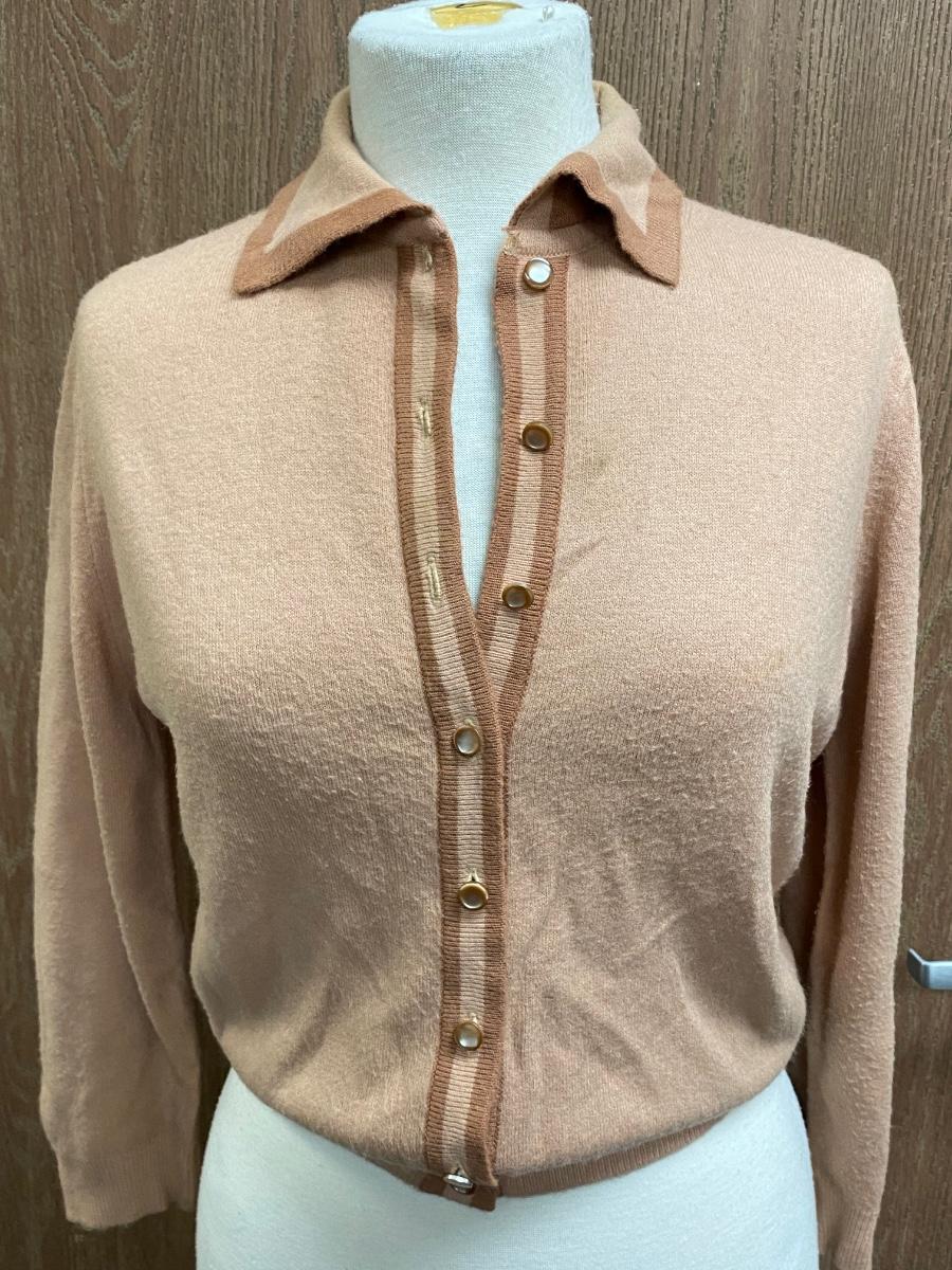Vintage two tone beige button front sweater from Talbott. Light beige with a darker edge, pearlized buttons. Did find a very tiny moth hole, no spots. No size tag, but guessing small/medium.