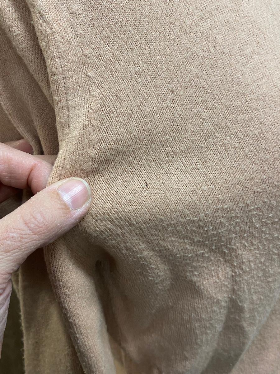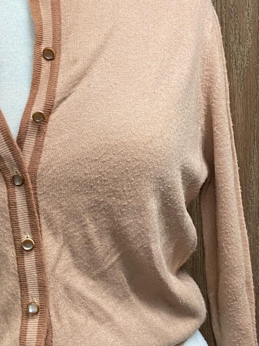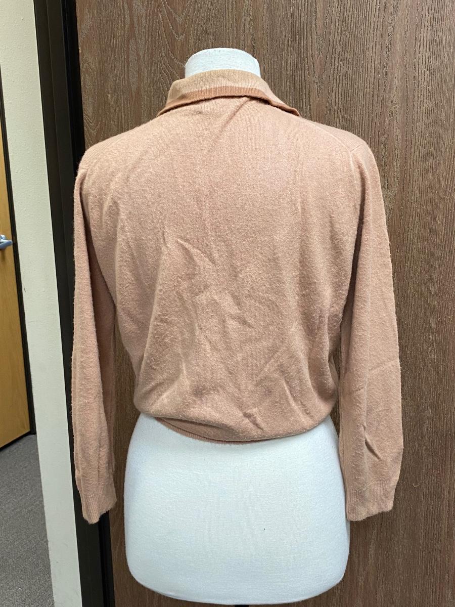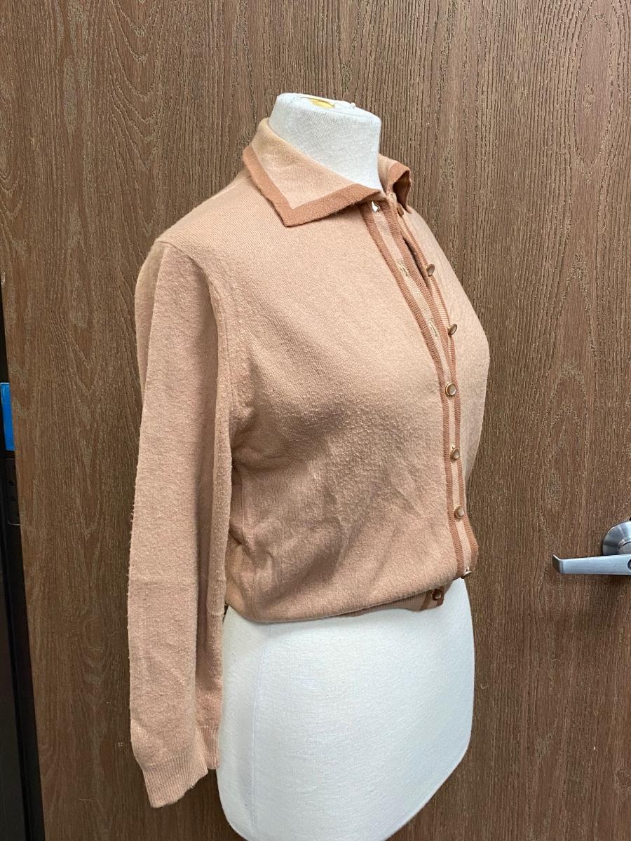 Vintage two tone beige button front sweater from Talbott. Light beige with a darker edge, pearlized buttons. Did find a very tiny moth hole, no spots. No size tag, but guessing small/medium.