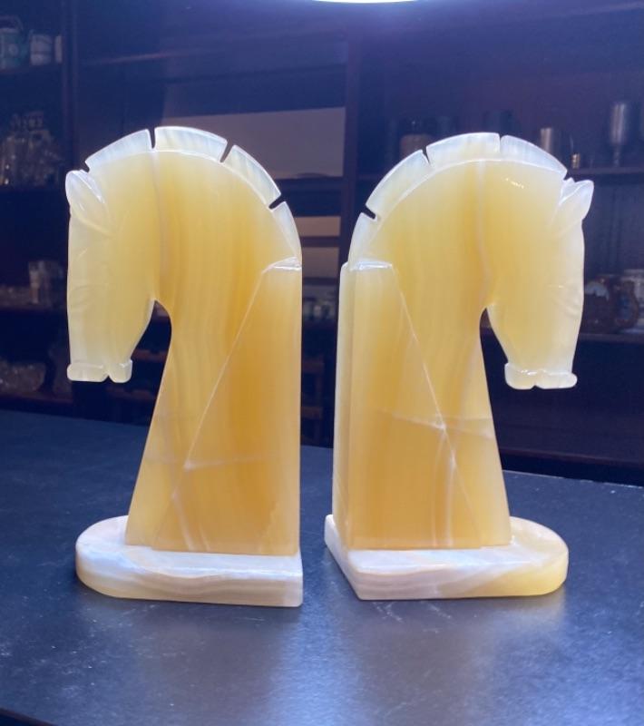 Nice alabaster? Marble Trojan horse bookends c. 1970. Measure 9.5 tall, 4.5 long, 3” deep. They make a beautiful statement!