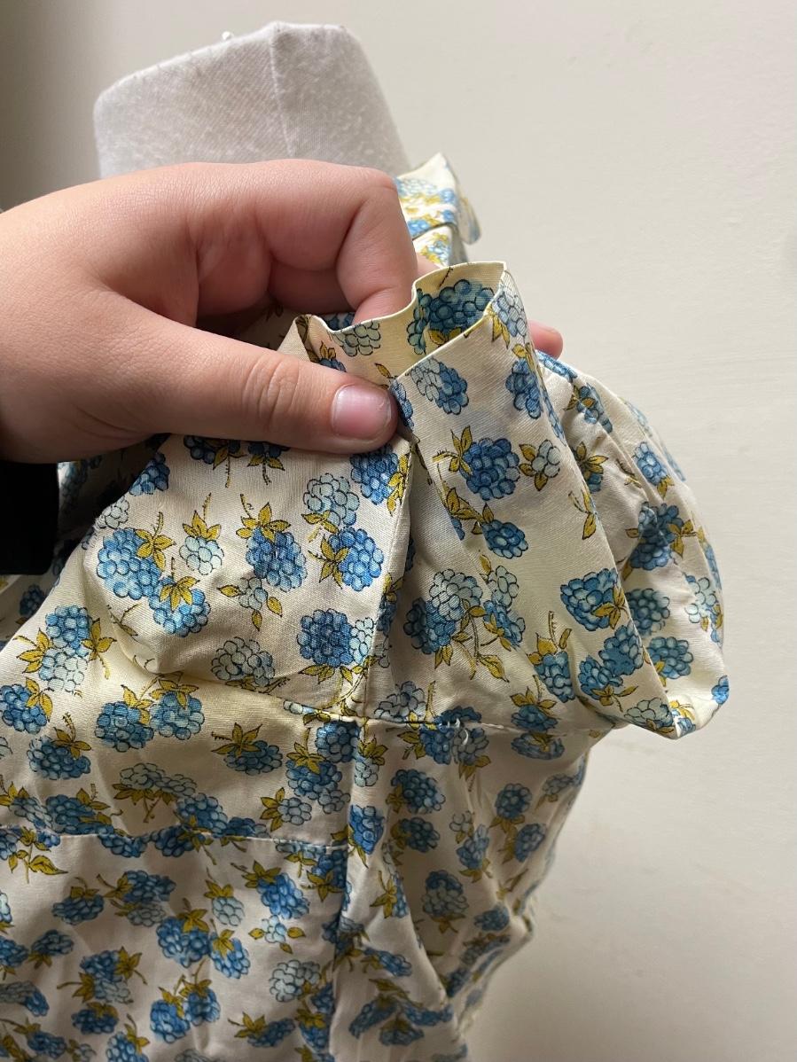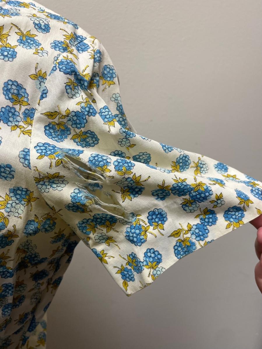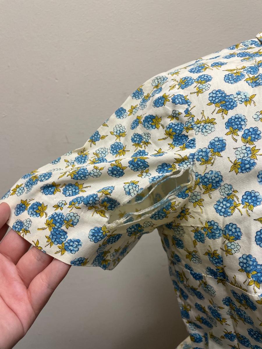 This item is in decent condition. There are rips on both sleeves and some discoloration under the armpit area. All of the buttons are on the top, none are missing. It is a bit wrinkled due to being folded. It says that it fits a size 12/ small.