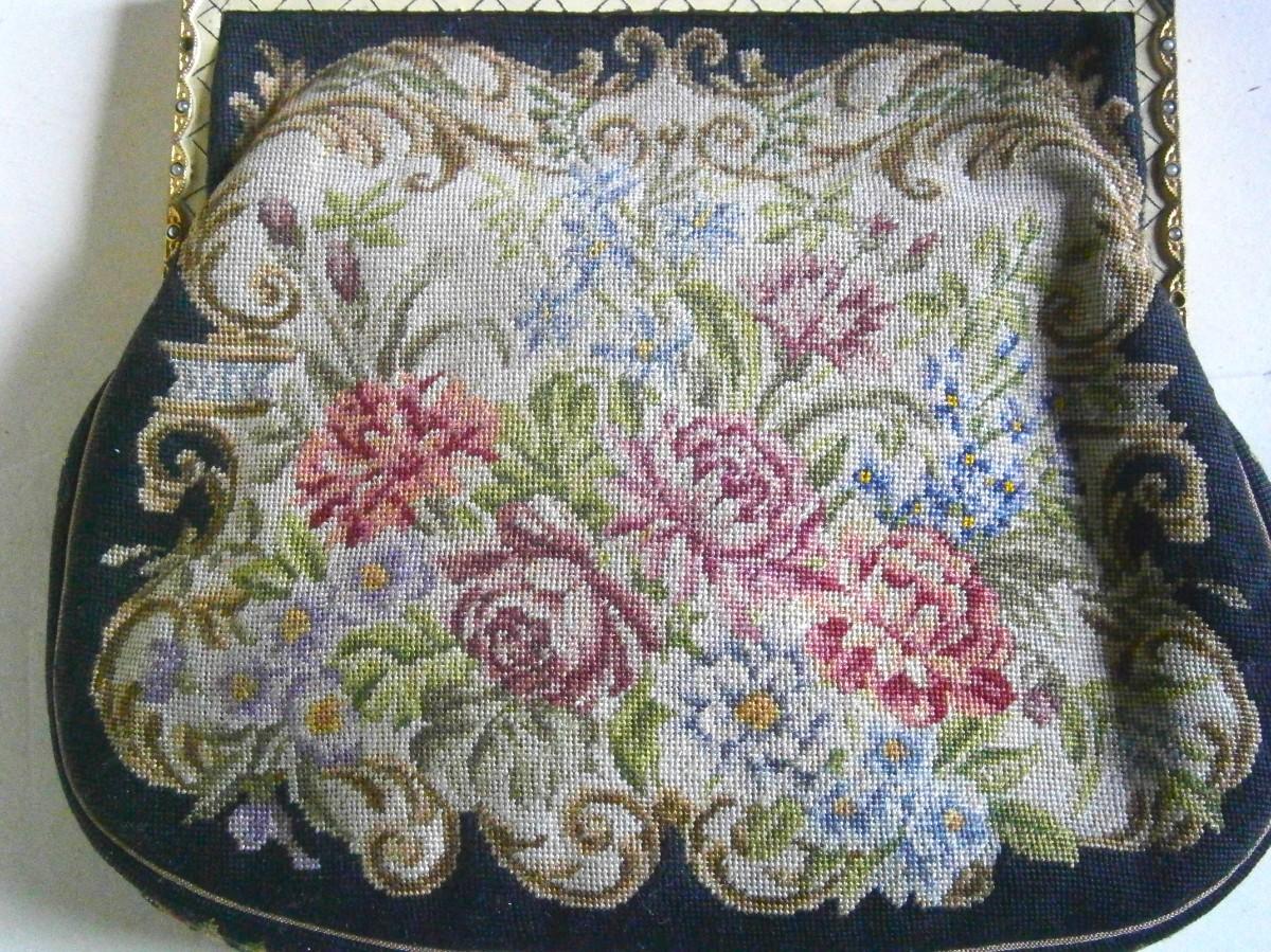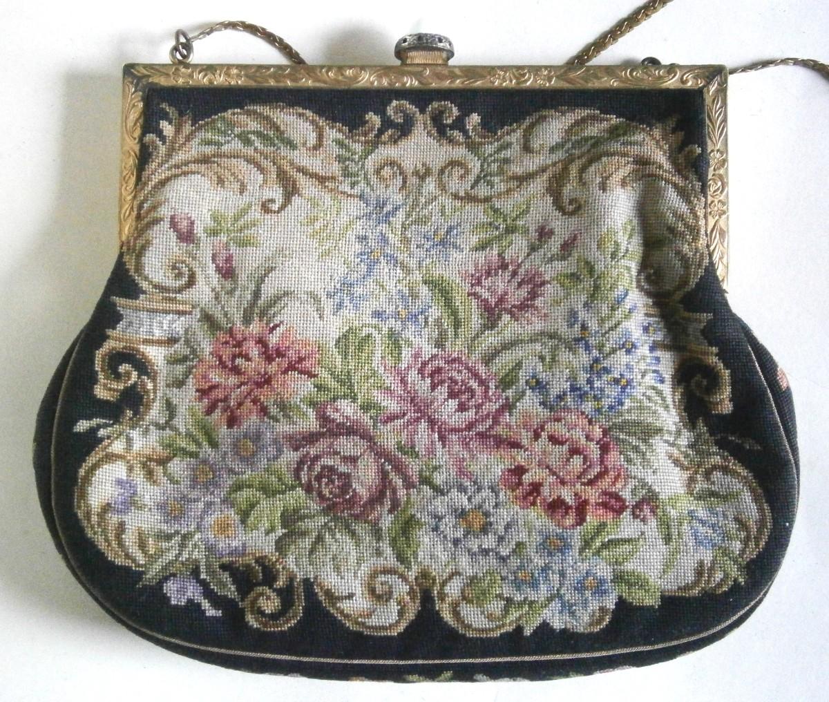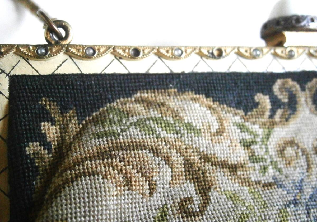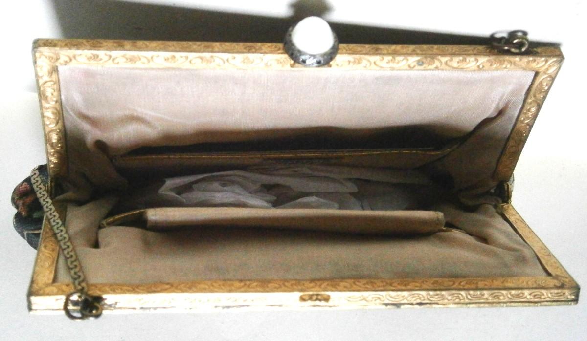 Vintage Tapestry Ladies Purse made in Austria from the Early 1900's, 6 x 5 in. (excluding chain strap), front of frame is enamel on brass with seed pearls (missing some of the pearls), silk lined with original mirror and cloth change purse, also has original owners calling card.