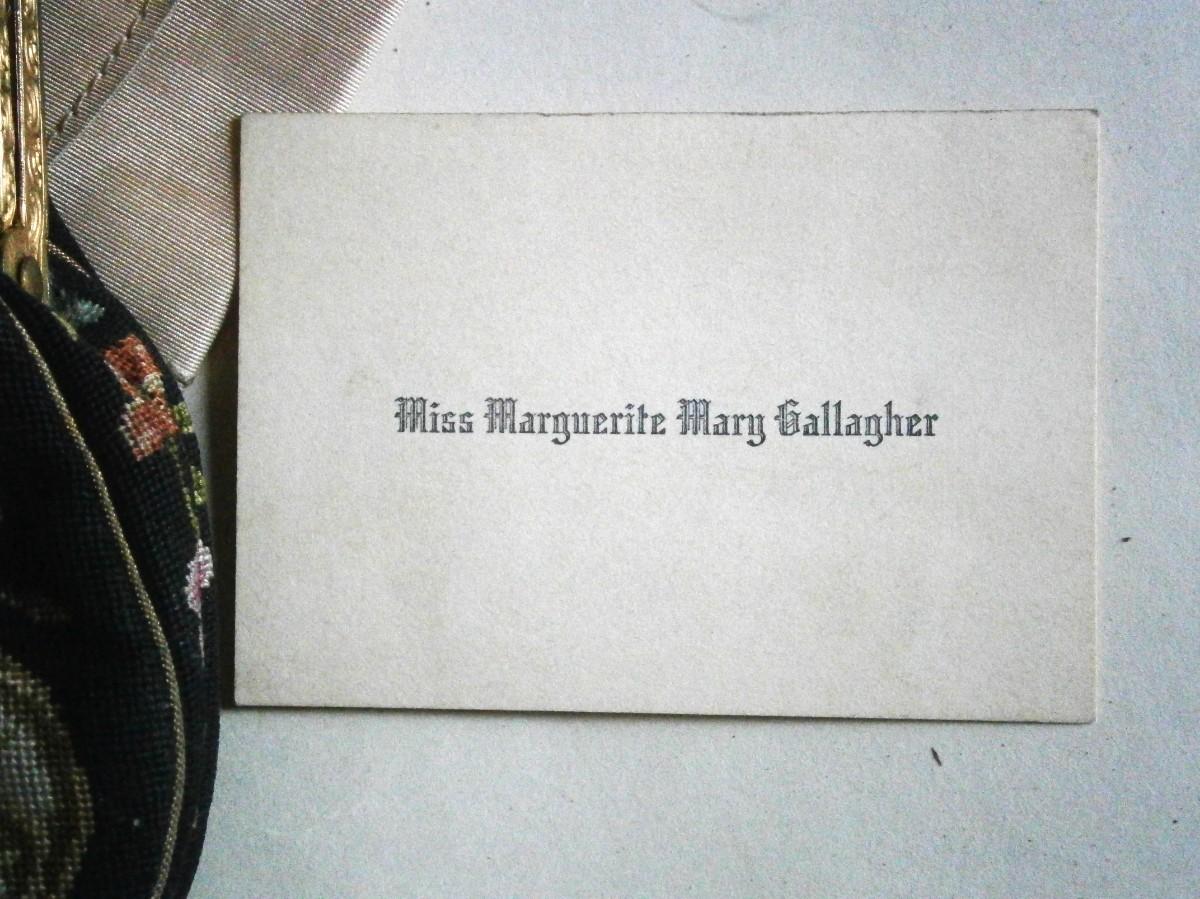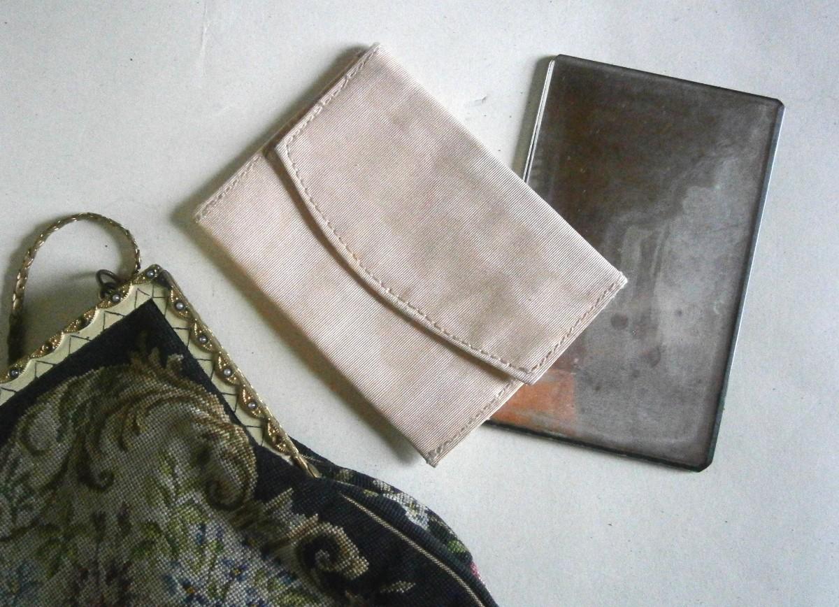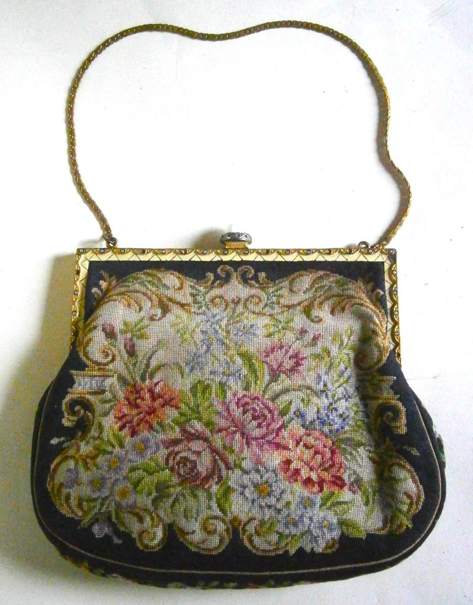 Vintage Tapestry Ladies Purse made in Austria from the Early 1900's, 6 x 5 in. (excluding chain strap), front of frame is enamel on brass with seed pearls (missing some of the pearls), silk lined with original mirror and cloth change purse, also has original owners calling card.