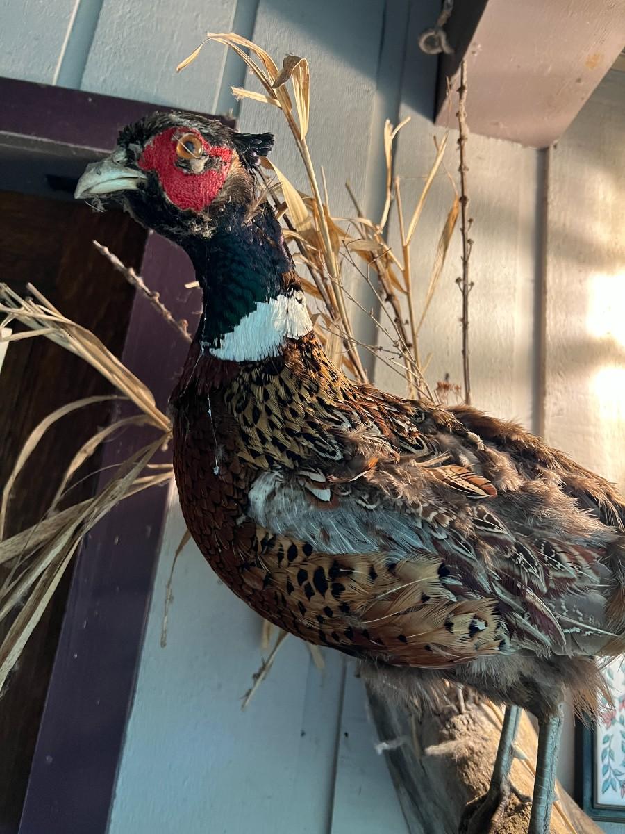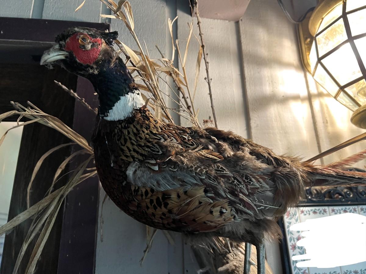 Vintage Taxidermy Mounted Pheasant Bird on Branch. In fair condition, with signs of weathering and some bent feathers (as shown in photos). Kept in a covered porch area.
