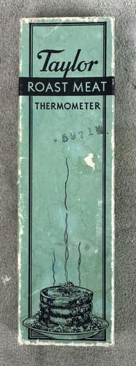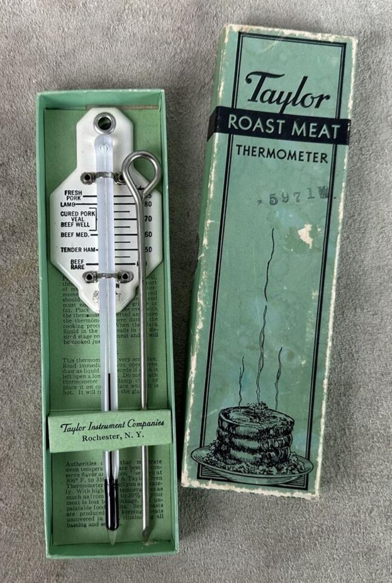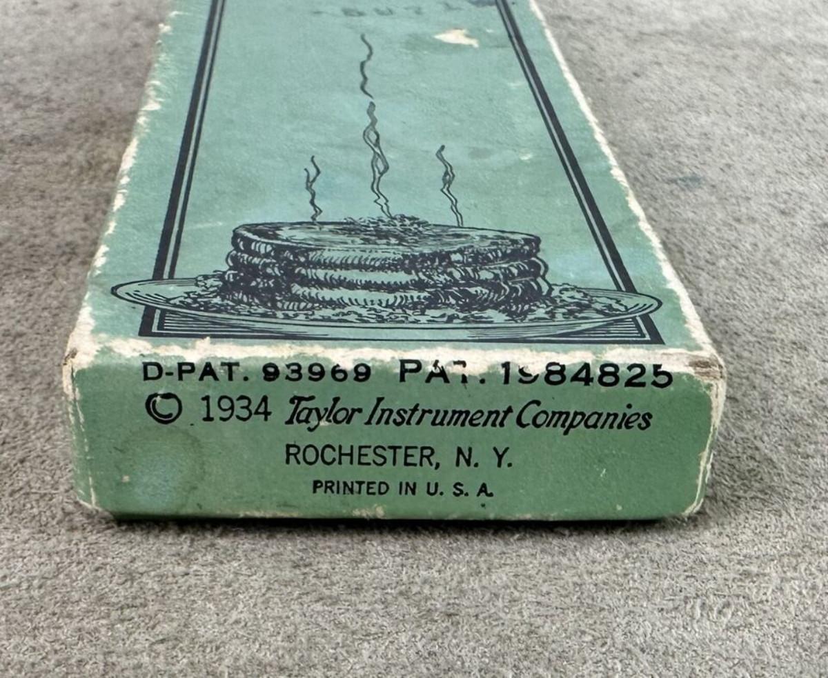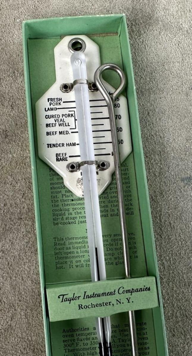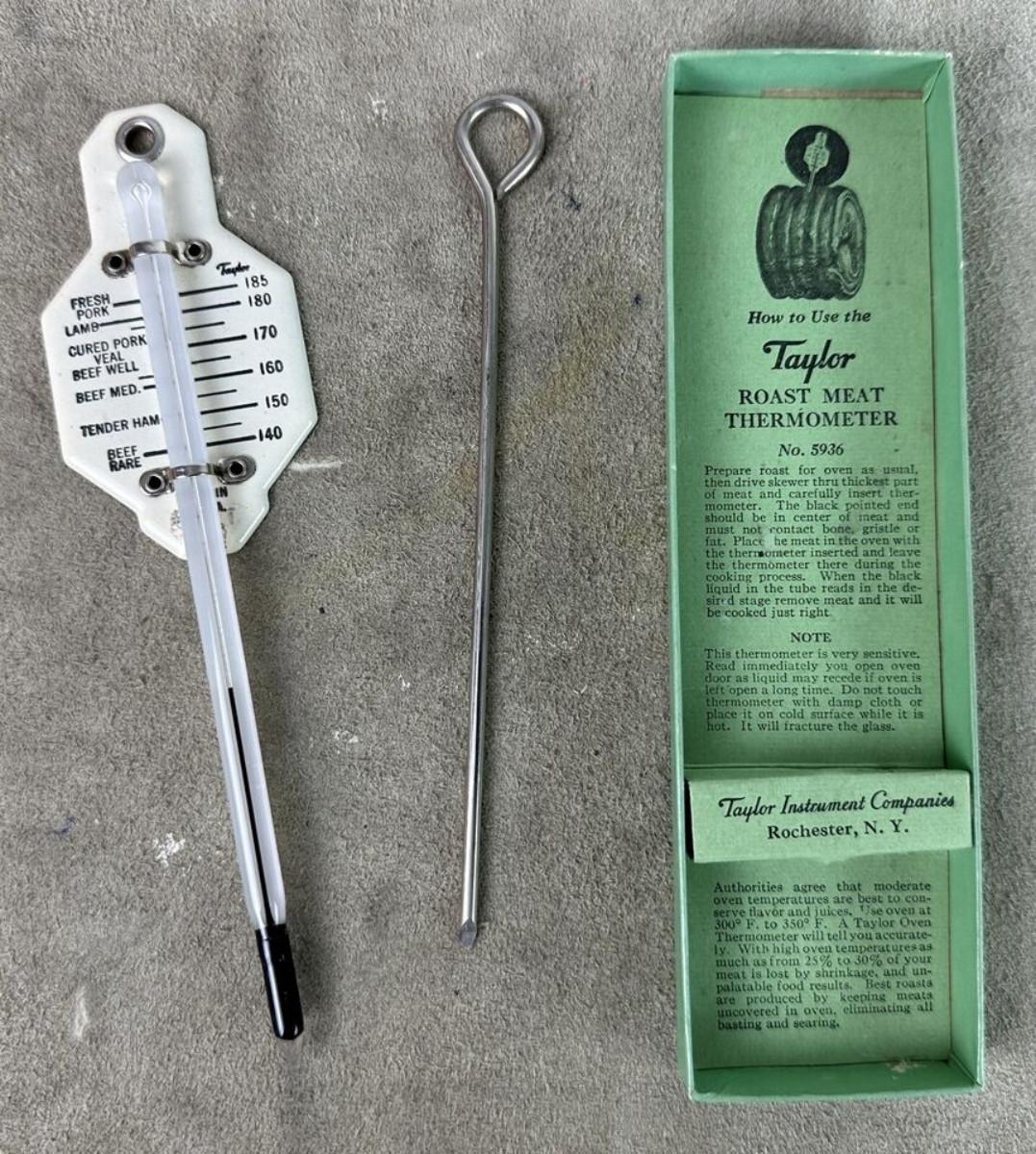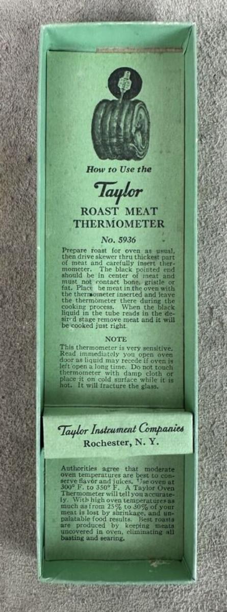 In good condition, slight use if any..right out of a Depression era kitchen here is a 1934 Taylor ROAST MEAT Thermometer with instructions for use..in the original box..as shown...Time table for roasting inside top cover...No. 5936...Taylor Instrument Companies, Rochester, N.Y...Some exterior wear on box with age.