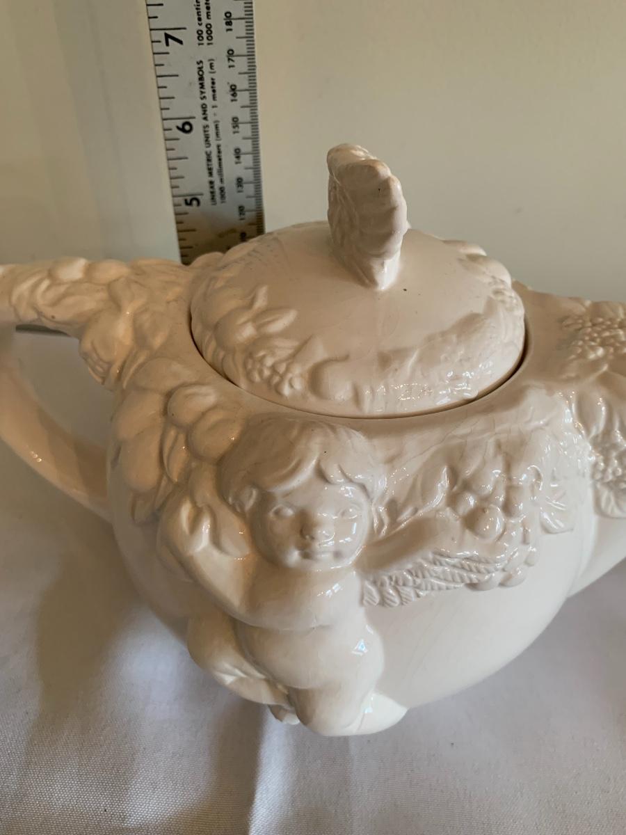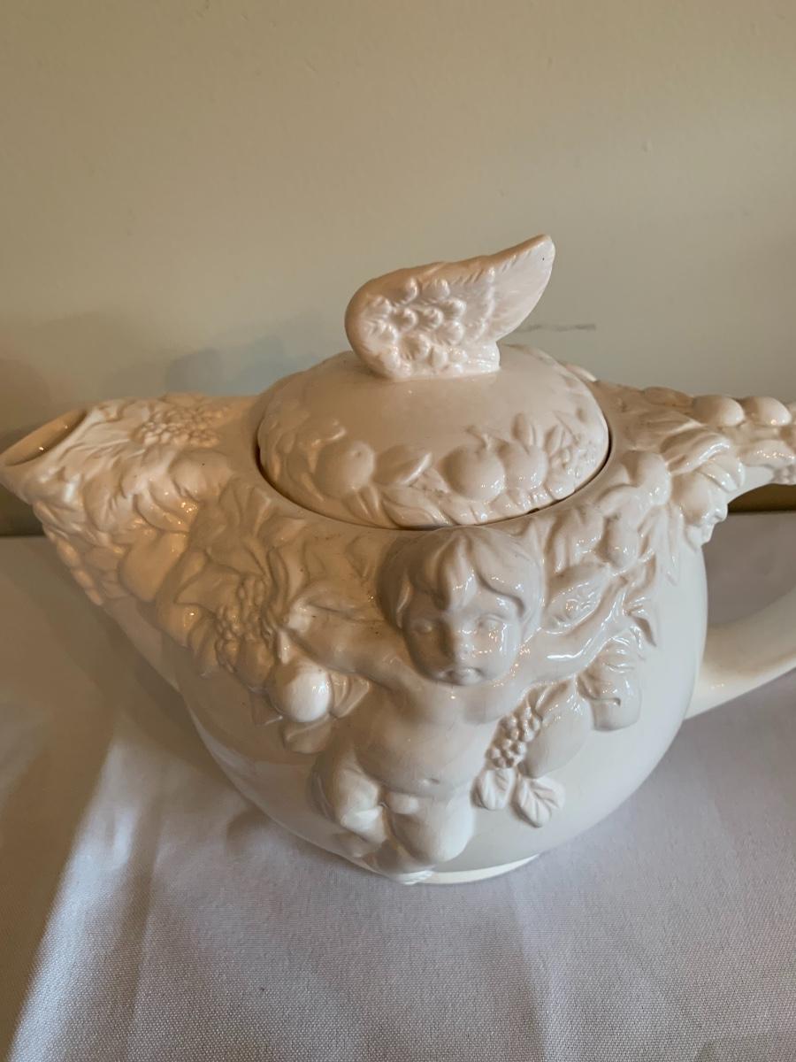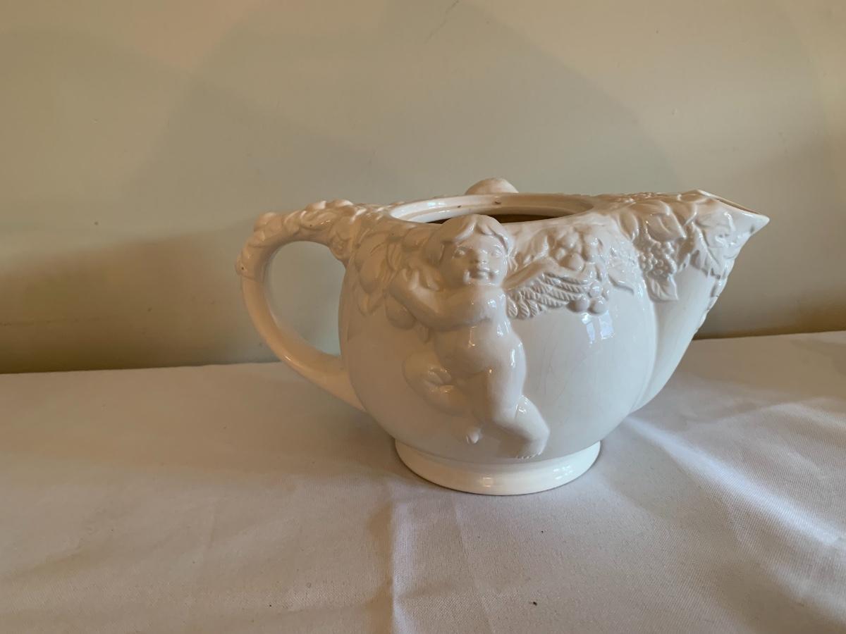Vintage Tea / Coffee Pot with Lid. White Pottery Pot with Cherub and Fruit Raised Decor