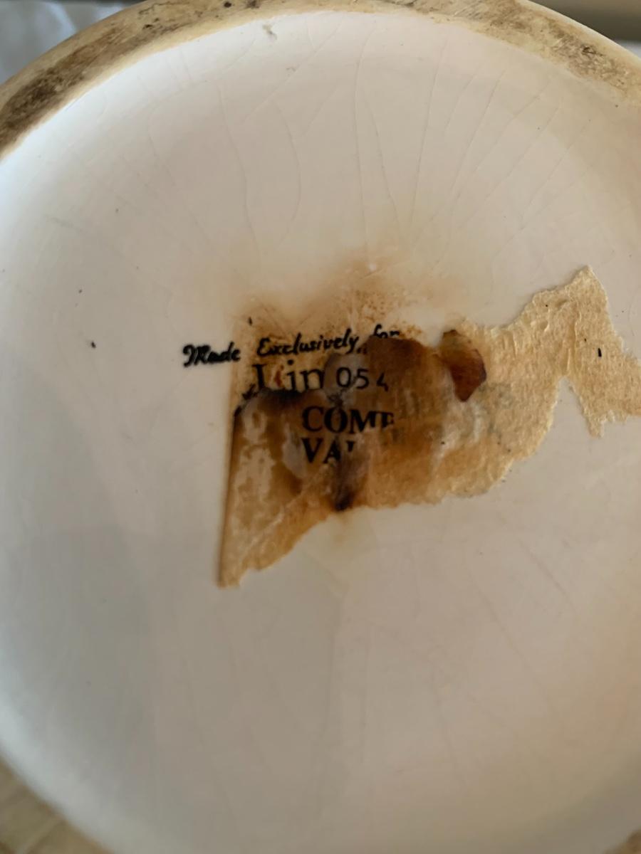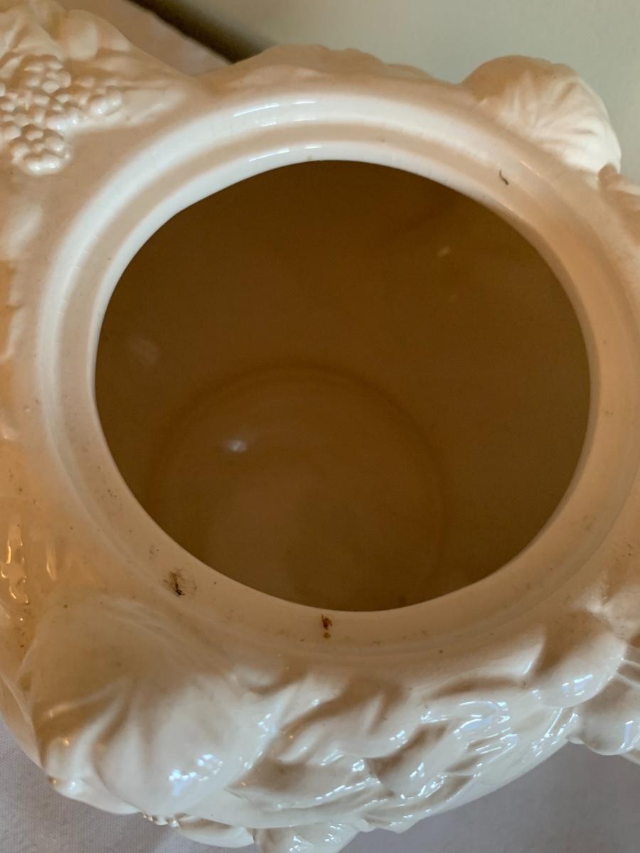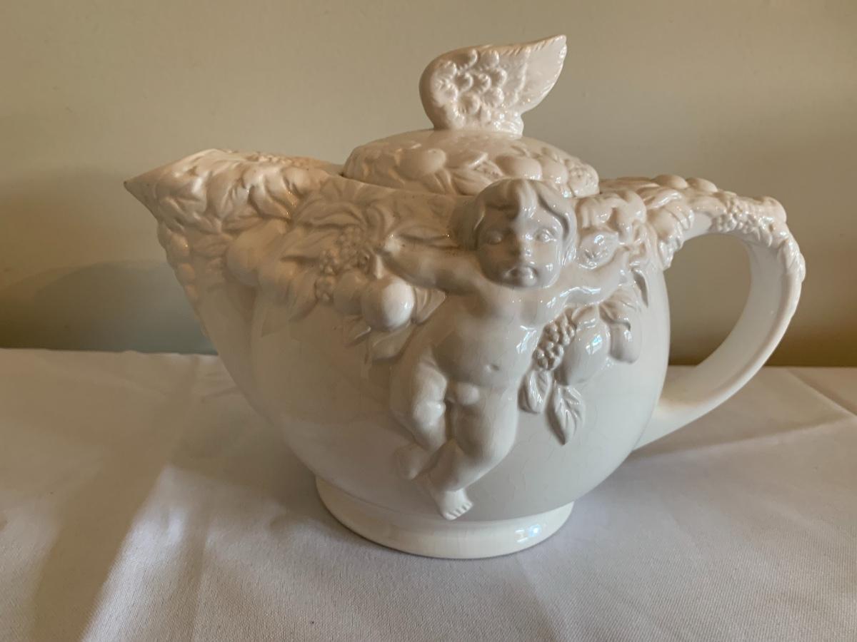 Vintage Tea / Coffee Pot with Lid. White Pottery Pot with Cherub and Fruit Raised Decor