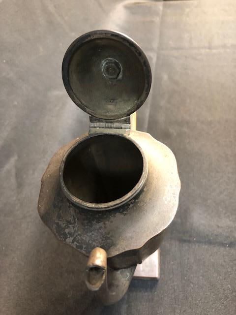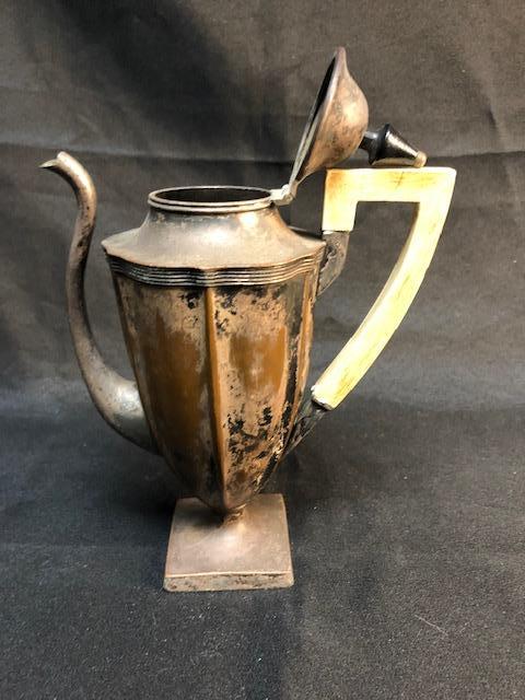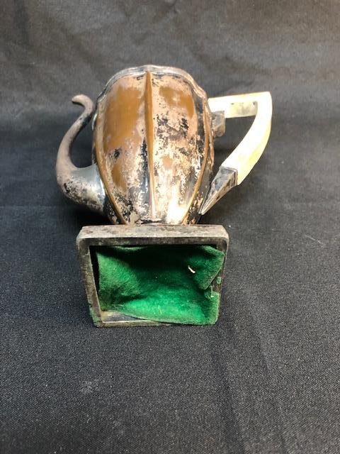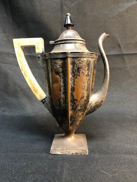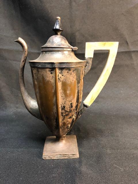 Vintage tea pot. Badly tarnished and worn. was once silver over copper it looks like. There is also dents and dings. Still has potential, maybe as a planter or flower vase.