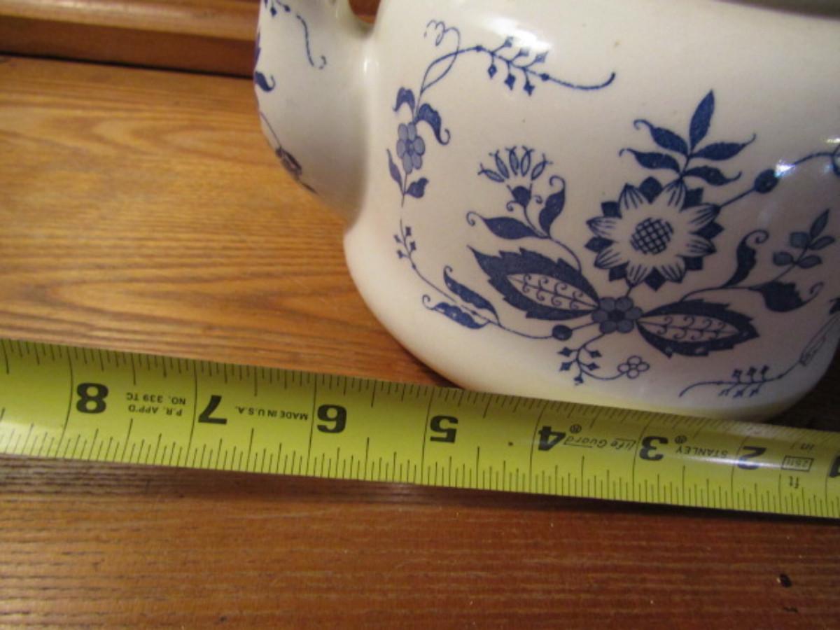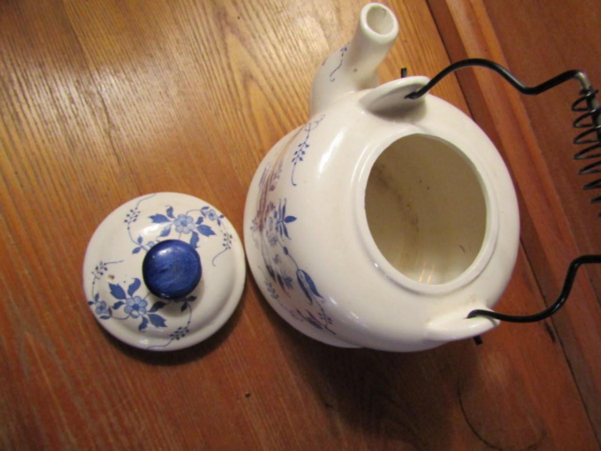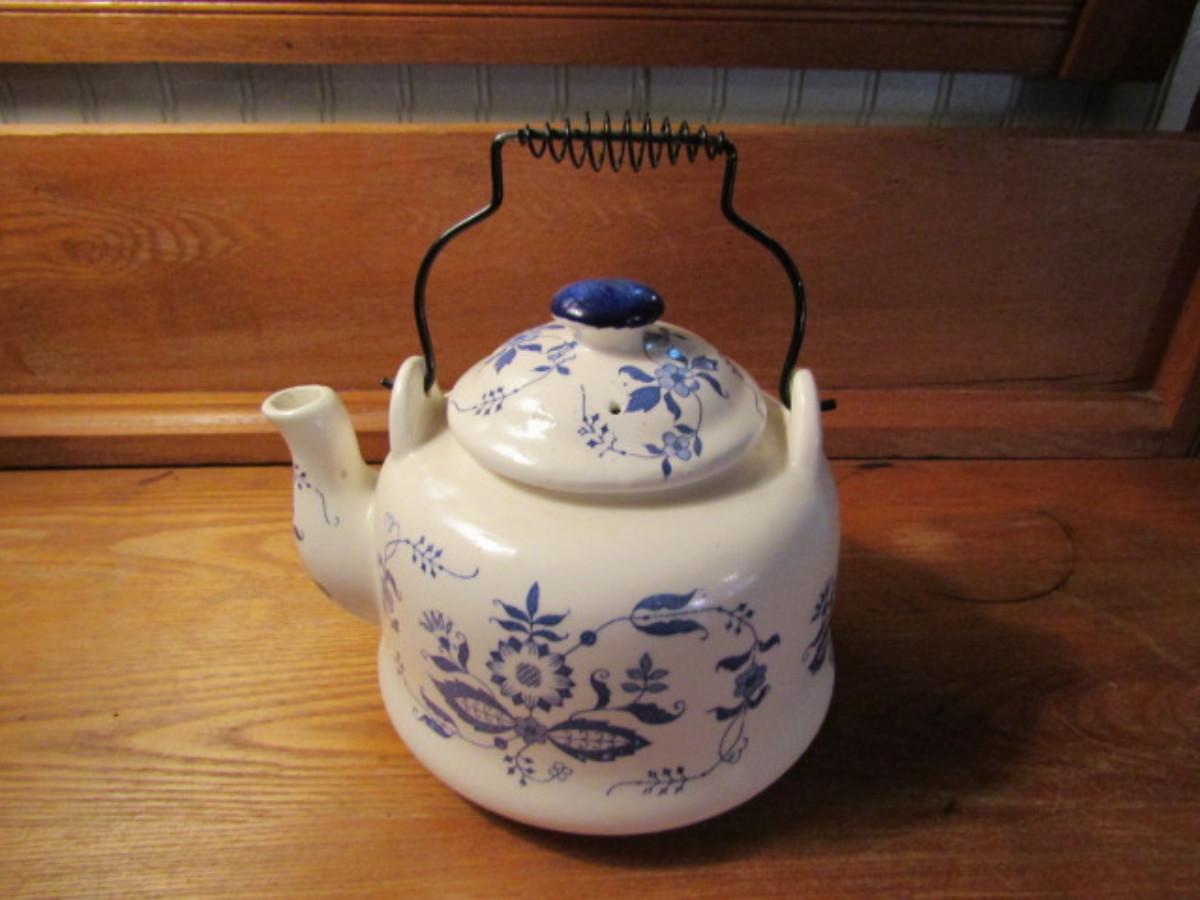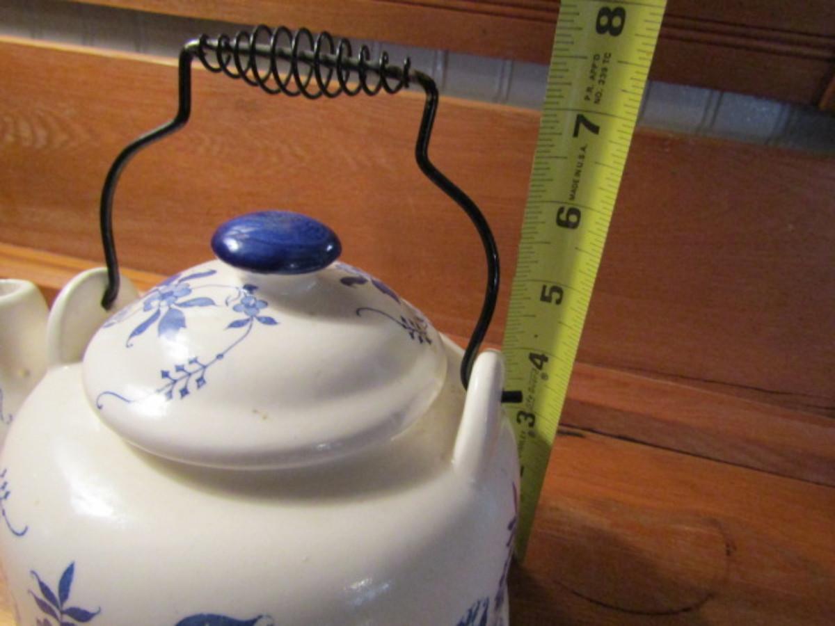 Vintage Tea Pot Blue Onion Type Pattern, Wire Handle