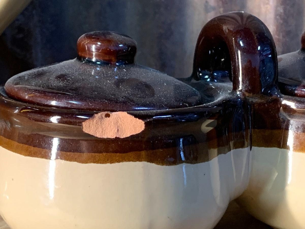This 4 Piece Set is Ready for use for all Occasions, Stoneware Tea Pot and Cream / Sugar Bowl - Chip in Bowl Set as Shown- Winning Bid Buys All Items Shown, All Item(s) are Sold As Is - Photo's Are Part of the Description - Pickup by Appointment, or Shipping is Available (Buyer Pays)