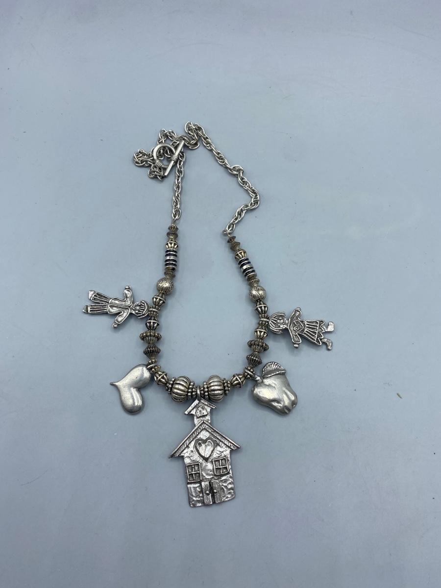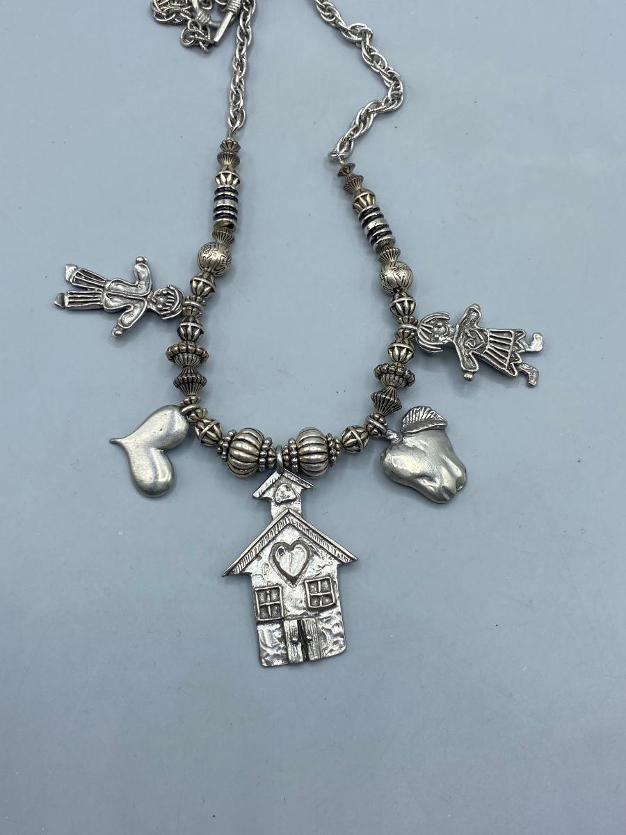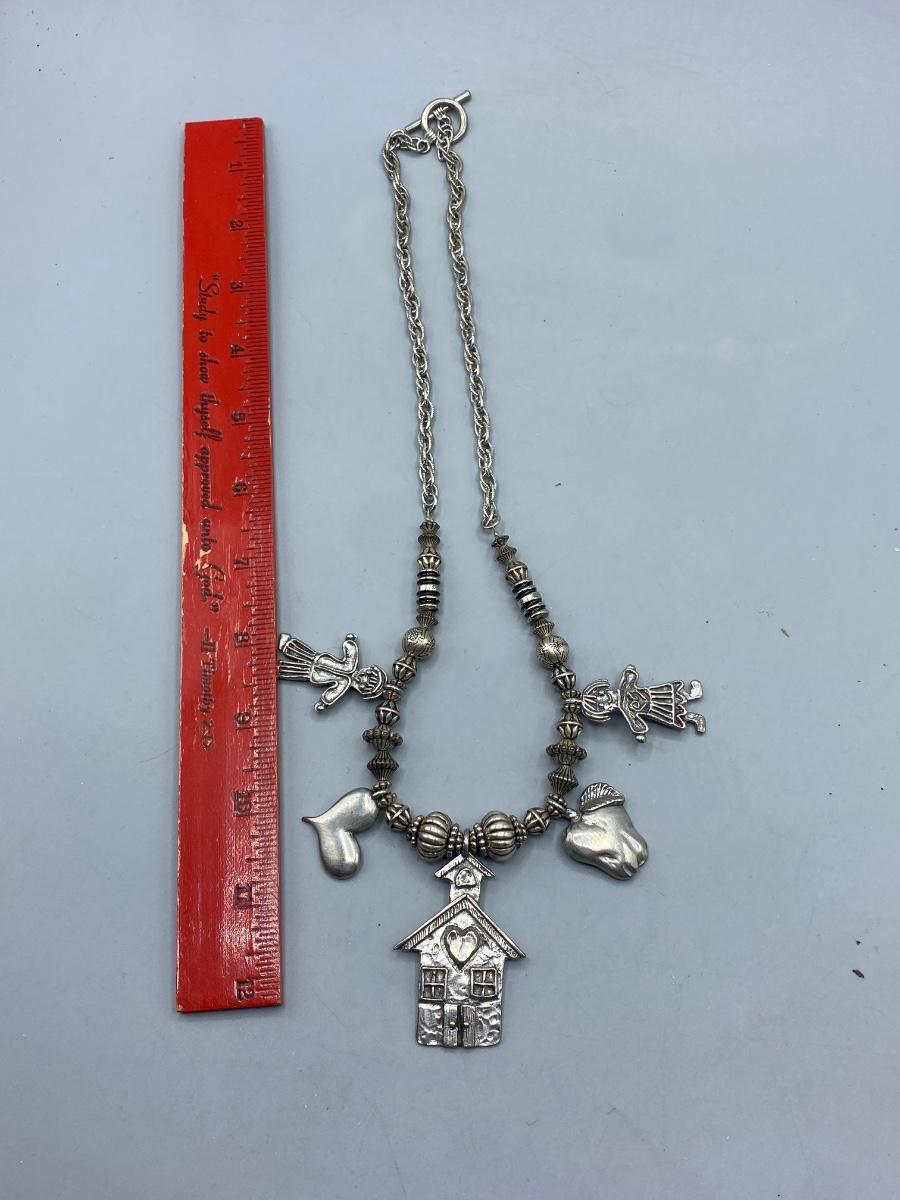 Vintage Teacher Themed Pewter Charm Necklace Marcie USA. In good condition. Charms include kids, heart, apple, and schoolhouse.