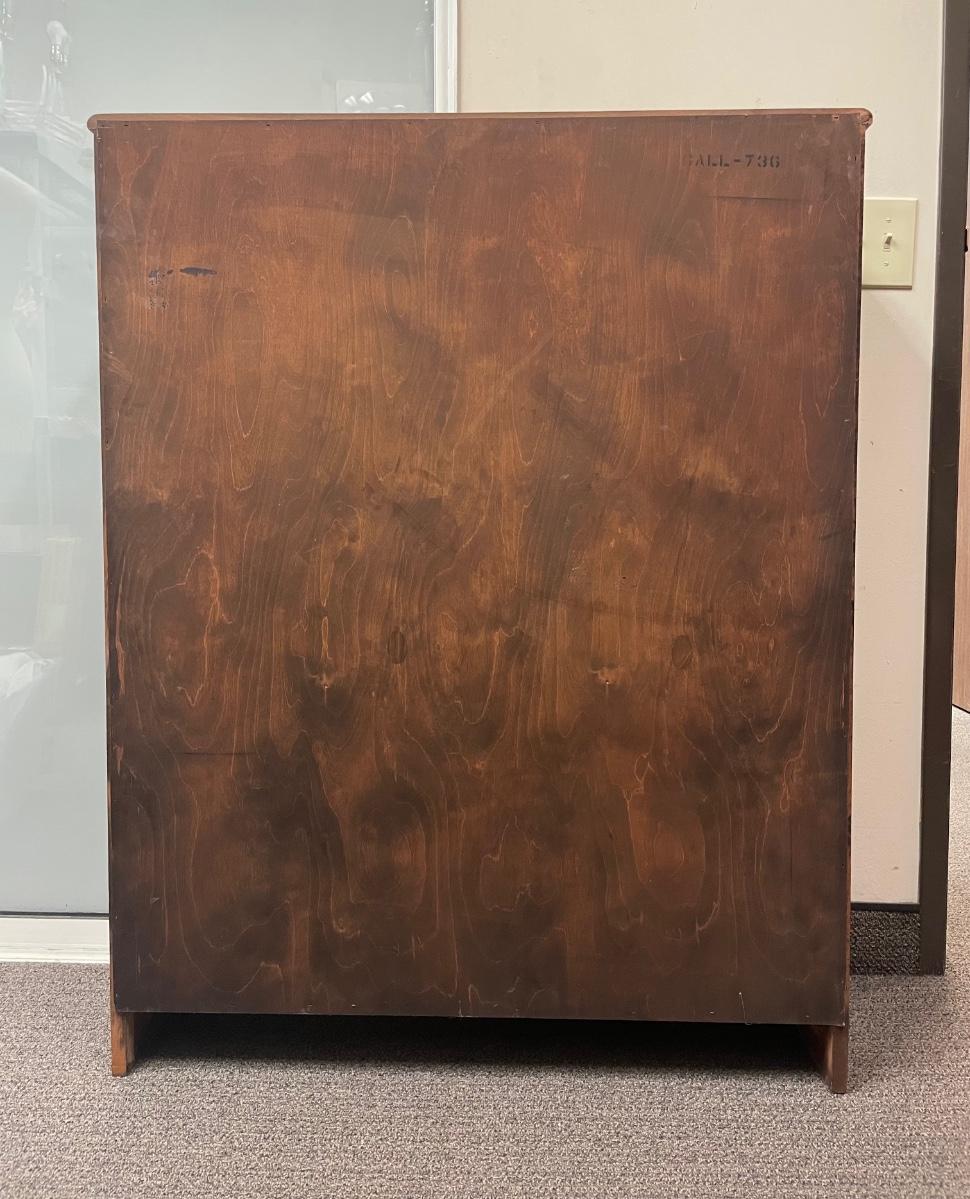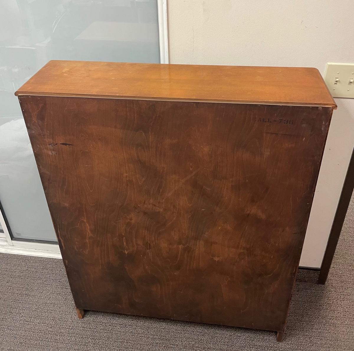 Bookcase shelves are adjustable. Has plywood back. Measures 45” tall, 35” wide and 10” deep.