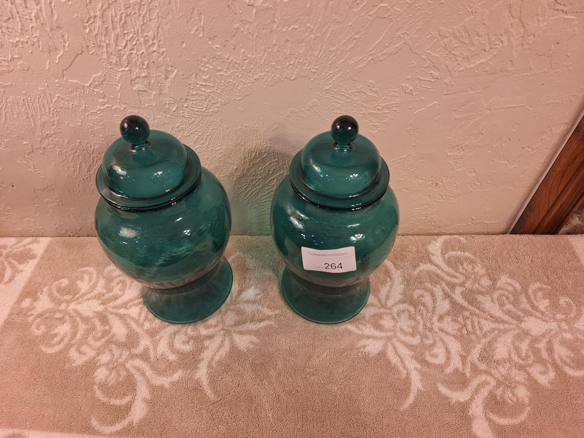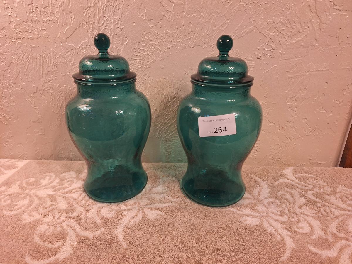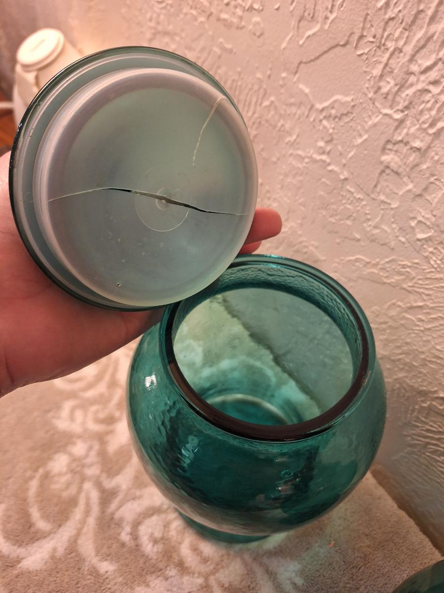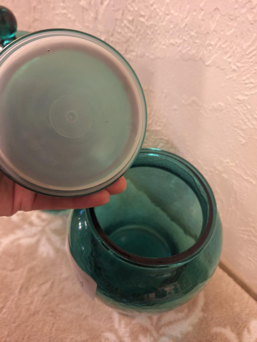 vintage teal blue or green apothecary jars canisters, one lid has damage to the seal part- see all photos.