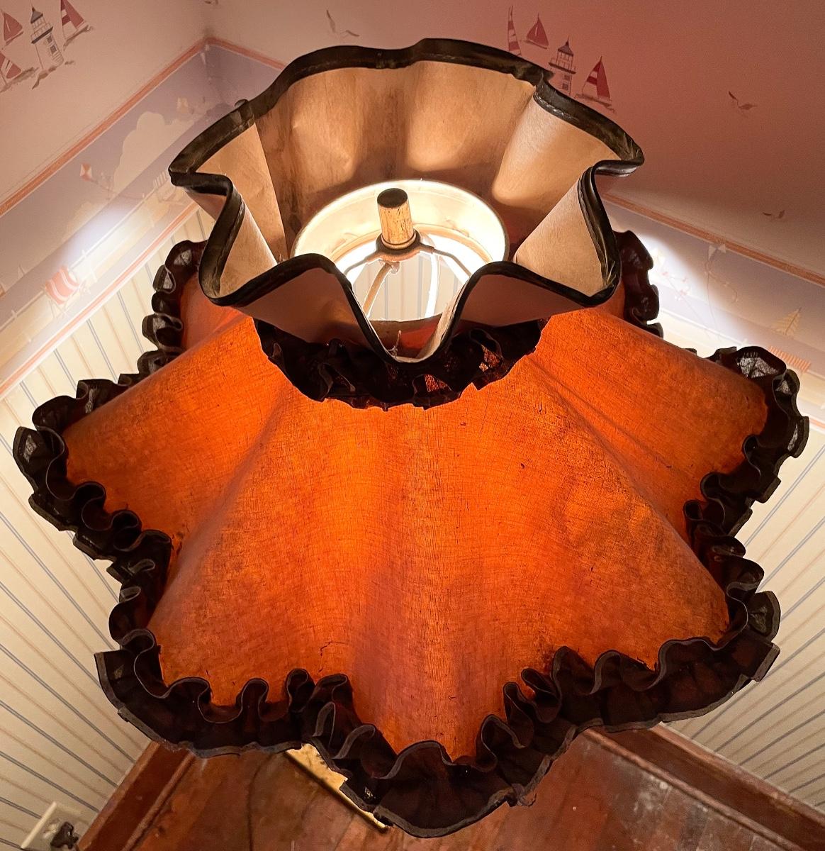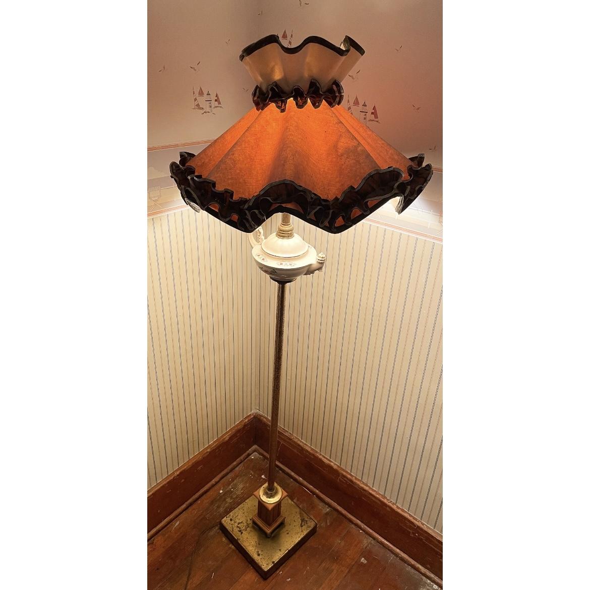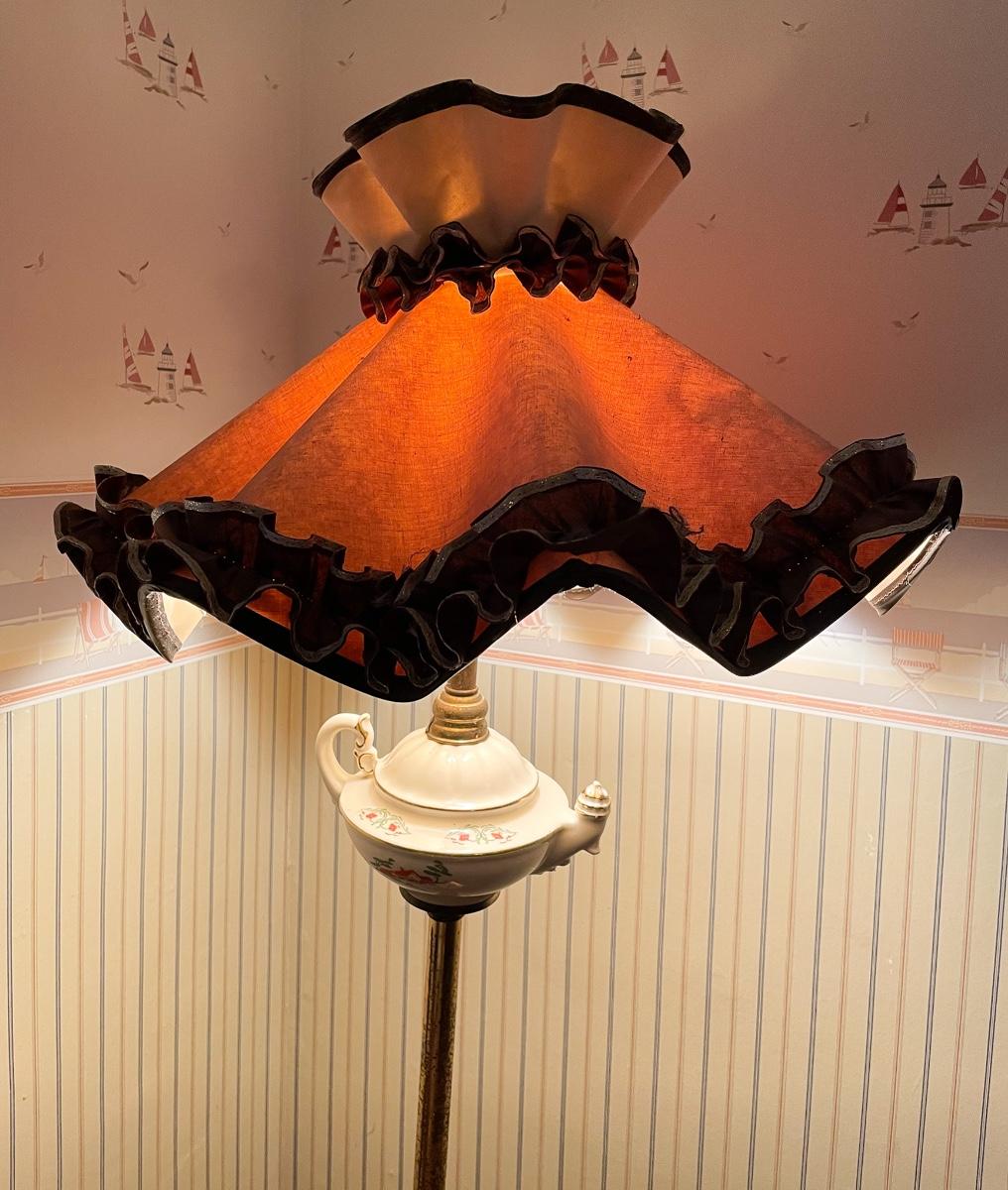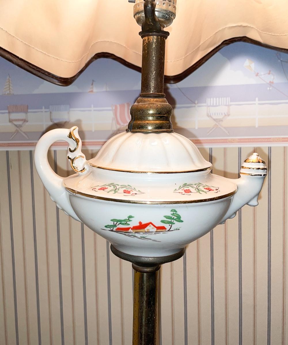 VINTAGE TEAPOT CERAMIC & BRASS LAMP W/ RUFFLED SHADE
