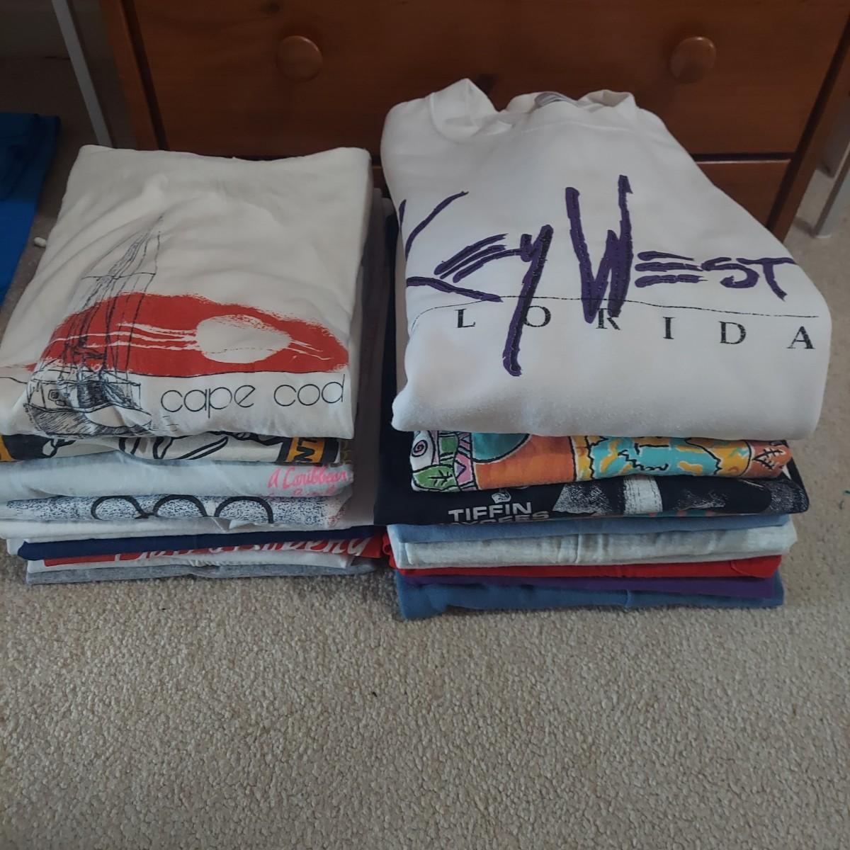 Lot includes 15+ vintage tees with a sweatshirt and long sleeve as well. Some pieces are single-stitch. Some overall wear due to age. Please see photos for tags and further details. Not all items are shown individually. Please come to preview if interested in seeing each piece. Shipping available