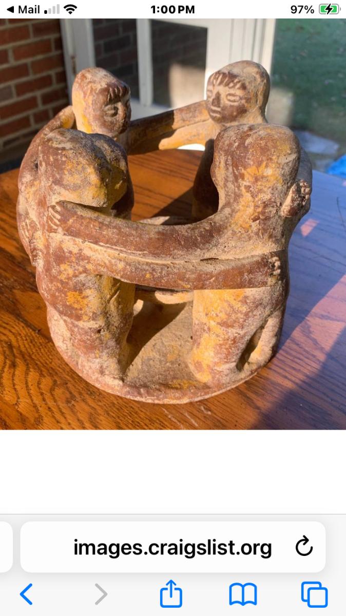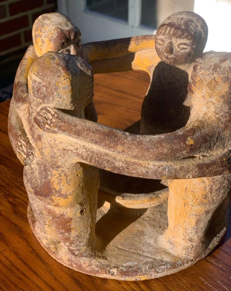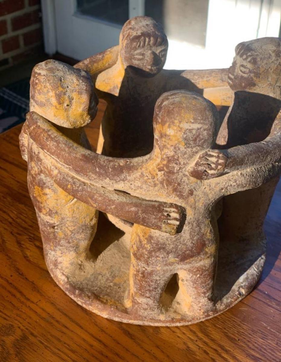• Features: Four figures joined in a hug/dance. The hollow center was likely intended for a pillar candle or incense/copal cone.